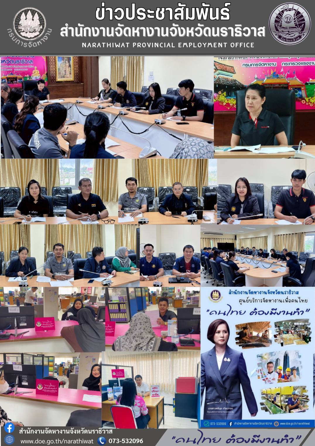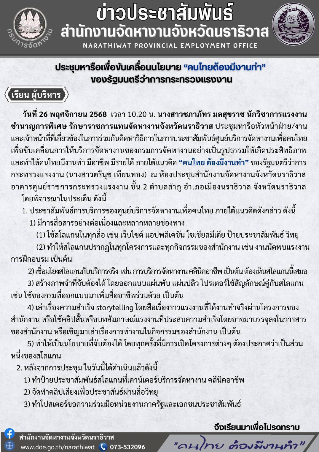 นางสาวชภาภัทรมลสุขราชนักวิชาการแรงงานชำนาญการพิเศษ รักษาราชการแทนจัดหางานจังหวัดนราธิวาส ประชุมหารือหัวหน้าฝ่าย/งานและเจ้าหน้าที่ที่เกี่ยวข้องในการร่วมกันคิดหาวิธีการในการประชาสัมพันธ์ศูนย์บริการจัดหางานเพื่อคนไทยเพื่อขับเคลื่อนการให้บริการจัดหางานของกรมการจัดหางานอย่างเป็นรูปธรรมให้เกิดประสิทธิภาพและทำให้คนไทยมีงานทำ มีอาชีพ มีรายได้ ภายใต้แนวคิด "คนไทย ต้องมีงานทำ" ของรัฐมนตรีกระทรวงแรงงาน (นางสาวตรีนุช เทียนทอง) ณ ห้องประชุมสำนักงานจัดหางานจังหวัดนราธิวาส อาคารศูนย์ราชการกระทรวงแรงงาน ชั้น 2 ตำบลลำภู อำเภอเมืองนราธิวาส จังหวัดนราธิวาส