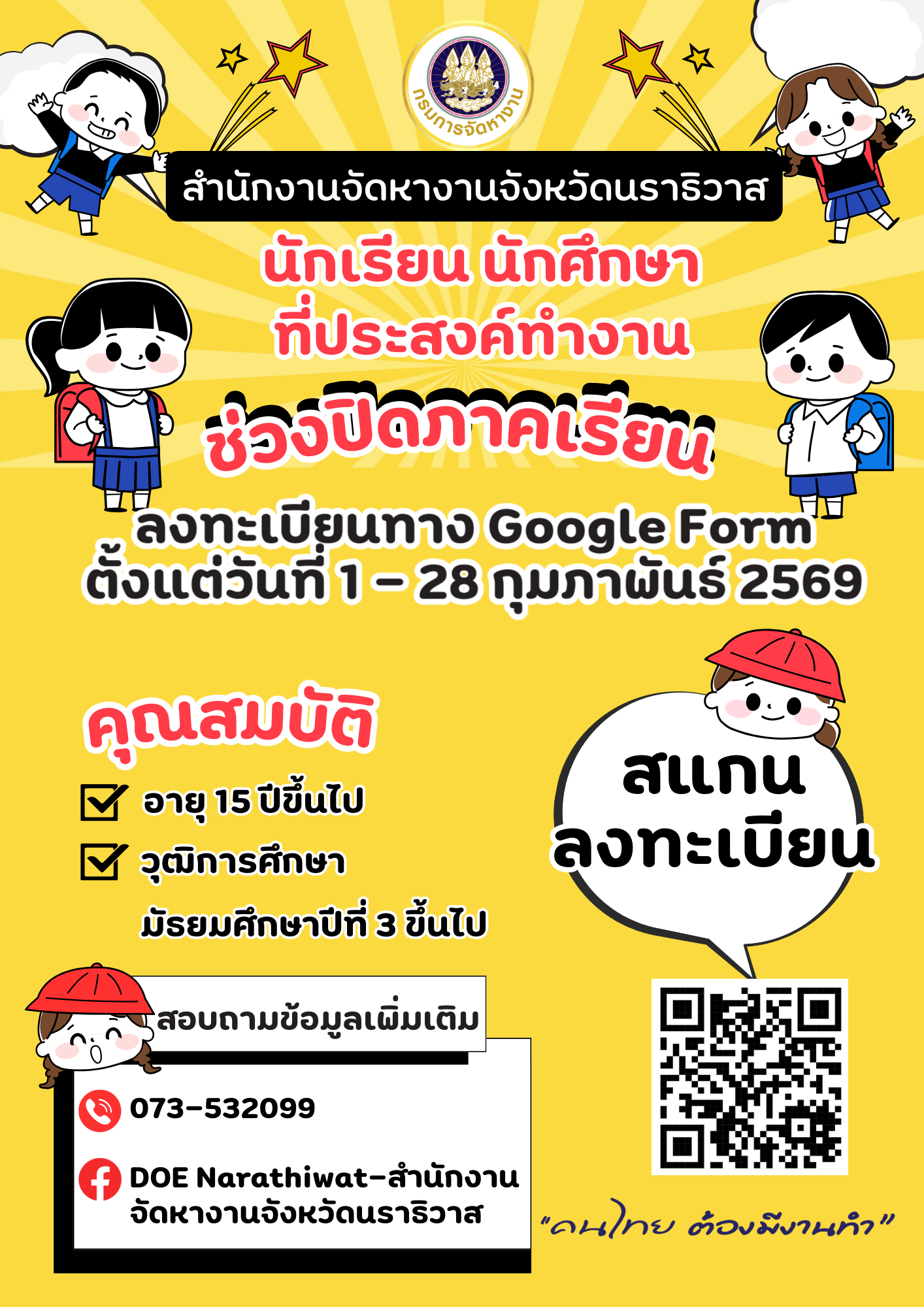 น้องๆท่านใดที่สนใจจะทำงานช่วงปิดภาคเรียน อย่าลืม ลงทะเบียนกันด้วยนะครับ
