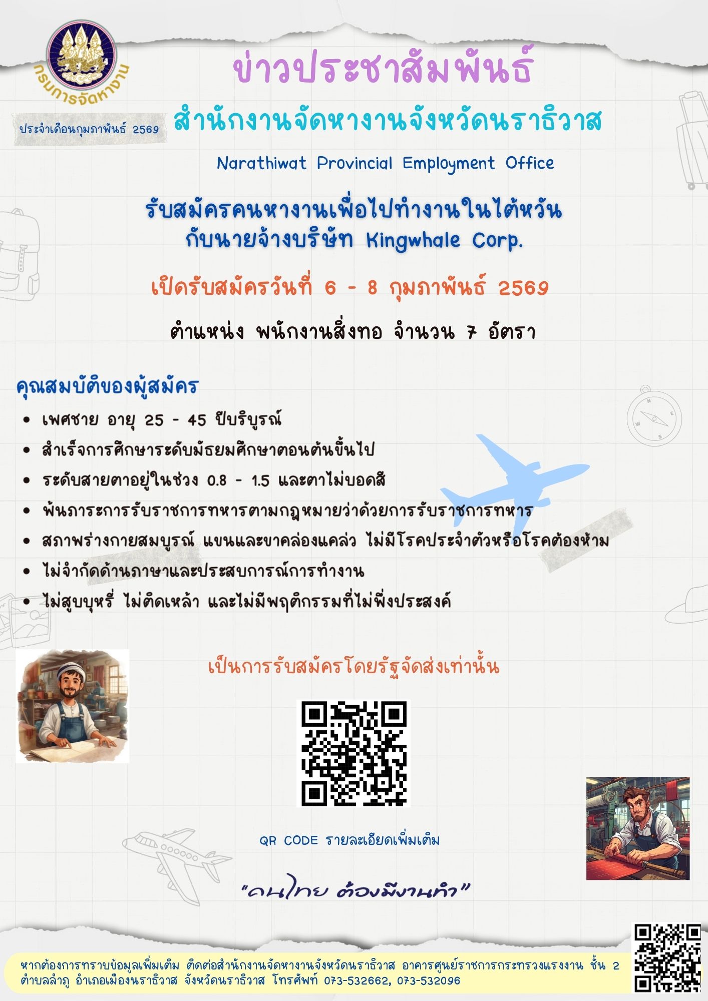 ข่าวประชาสัมพันธ์ เรื่อง รับสมัครคนหางานไปทำงานในไต้หวันกับนายจ้างบริษัท Kingwhale Corp