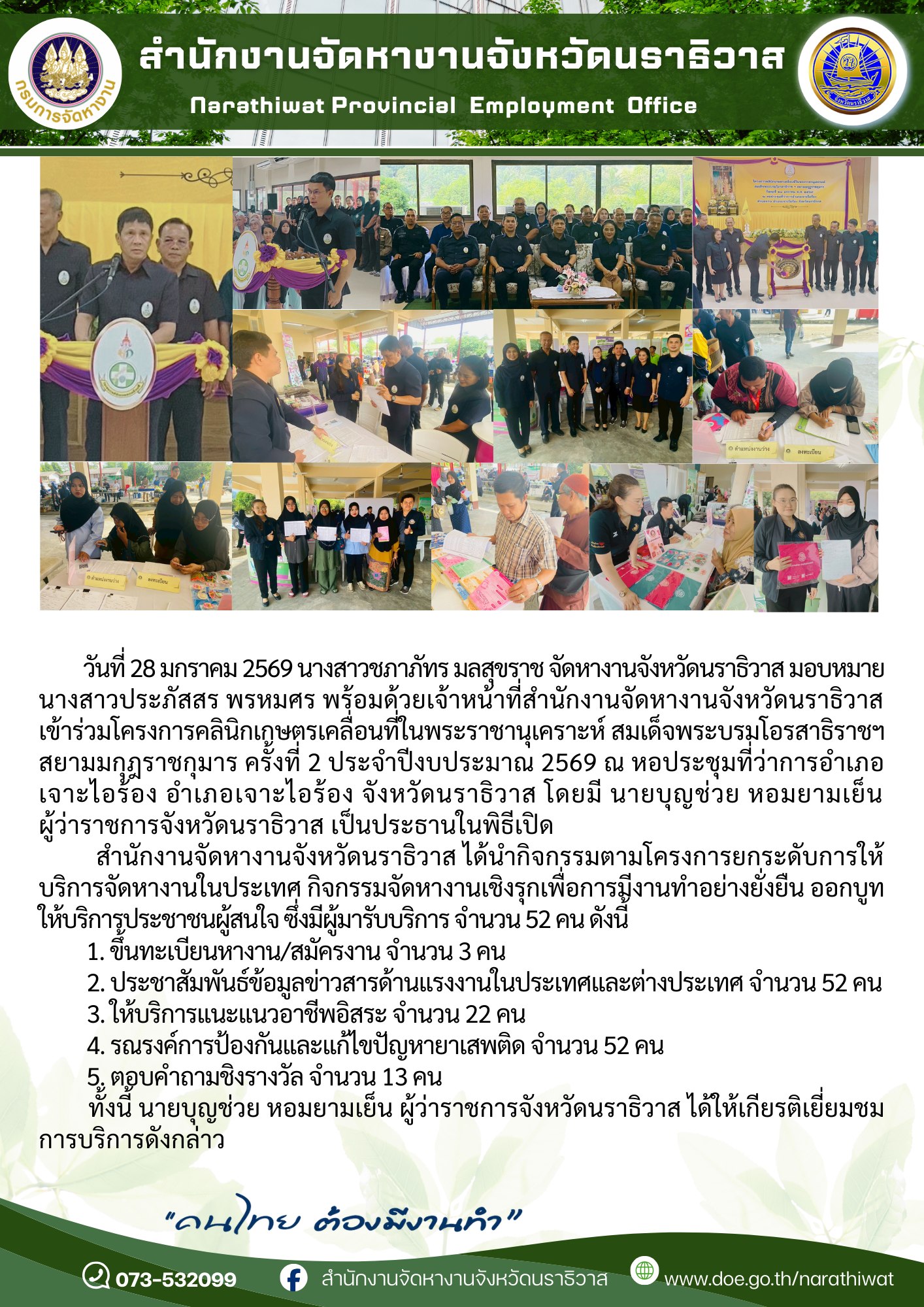 สำนักงานจัดหางานจังหวัดนราธิวาส ได้นำกิจกรรมตามโครงการยกระดับการให้บริการจัดหางานในประเทศ กิจกรรมจัดหางานเชิงรุกเพื่อการมีงานทำอย่างยั่งยืน ออกบูทให้บริการประชาชนผู้สนใจ ซึ่งมีผู้มารับบริการ จำนวน 52 คน ดังนี้