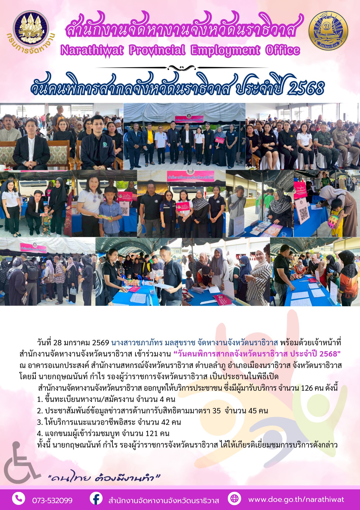 วันที่ 28 มกราคม 2569 นางสาวชภาภัทร มลสุขราช จัดหางานจังหวัดนราธิวาส พร้อมด้วยเจ้าหน้าที่สำนักงานจัดหางานจังหวัดนราธิวาส เข้าร่วมงาน “วันคนพิการสากลจังหวัดนราธิวาส ประจำปี 2568" ณ อาคารอเนกประสงค์ สำนักงานสหกรณ์จังหวัดนราธิวาส ตำบลลำภู อำเภอเมืองนราธิวาส จังหวัดนราธิวาสโดยมี นายกฤษณนันท์ กำไร รองผู้ว่าราชการจังหวัดนราธิวาส เป็นประธานในพิธีเปิด