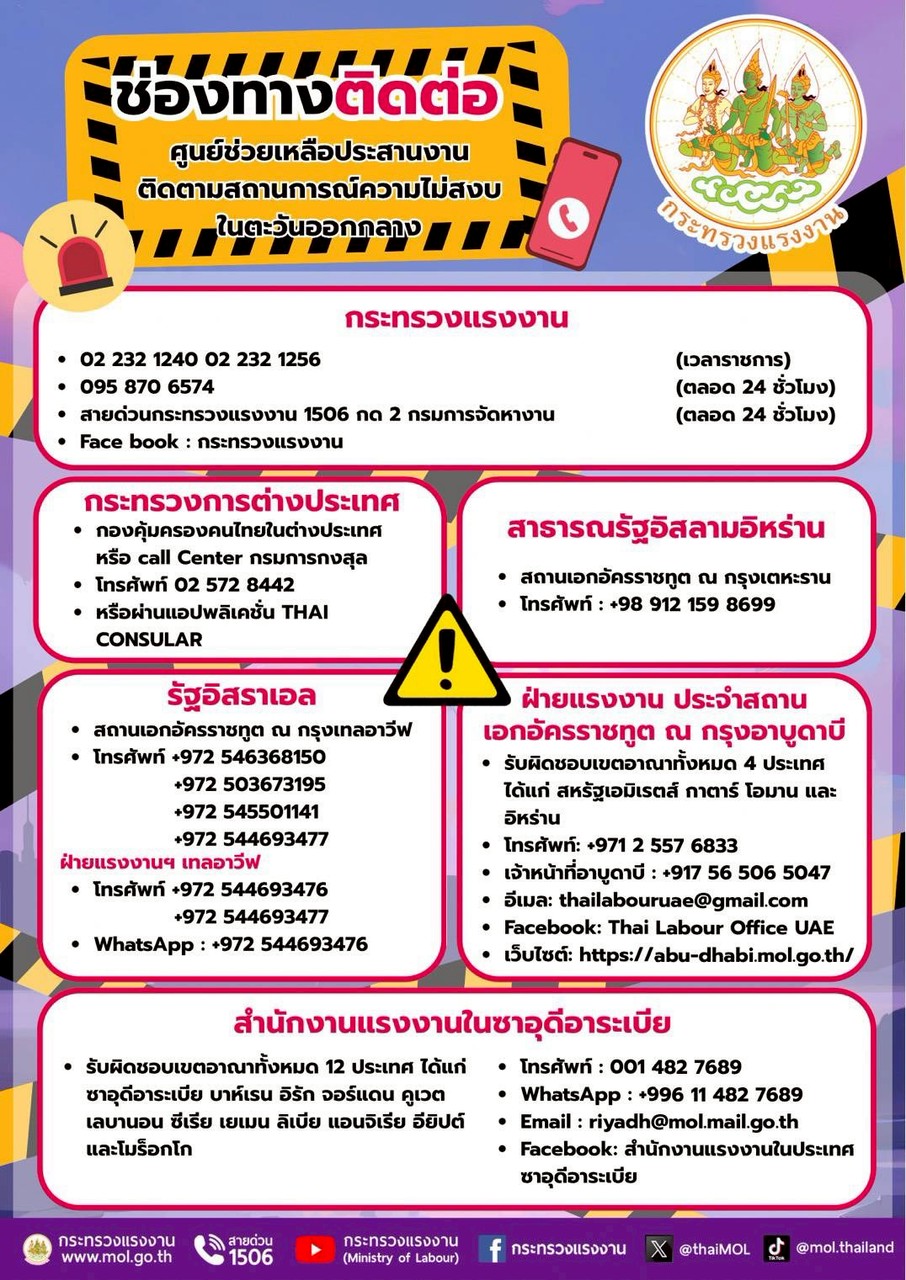 ช่องทางการติดต่อ ศูนย์ช่วยเหลือประสานงานติดตามสถานการณ์ความไม่สงบในตะวันออกกลาง