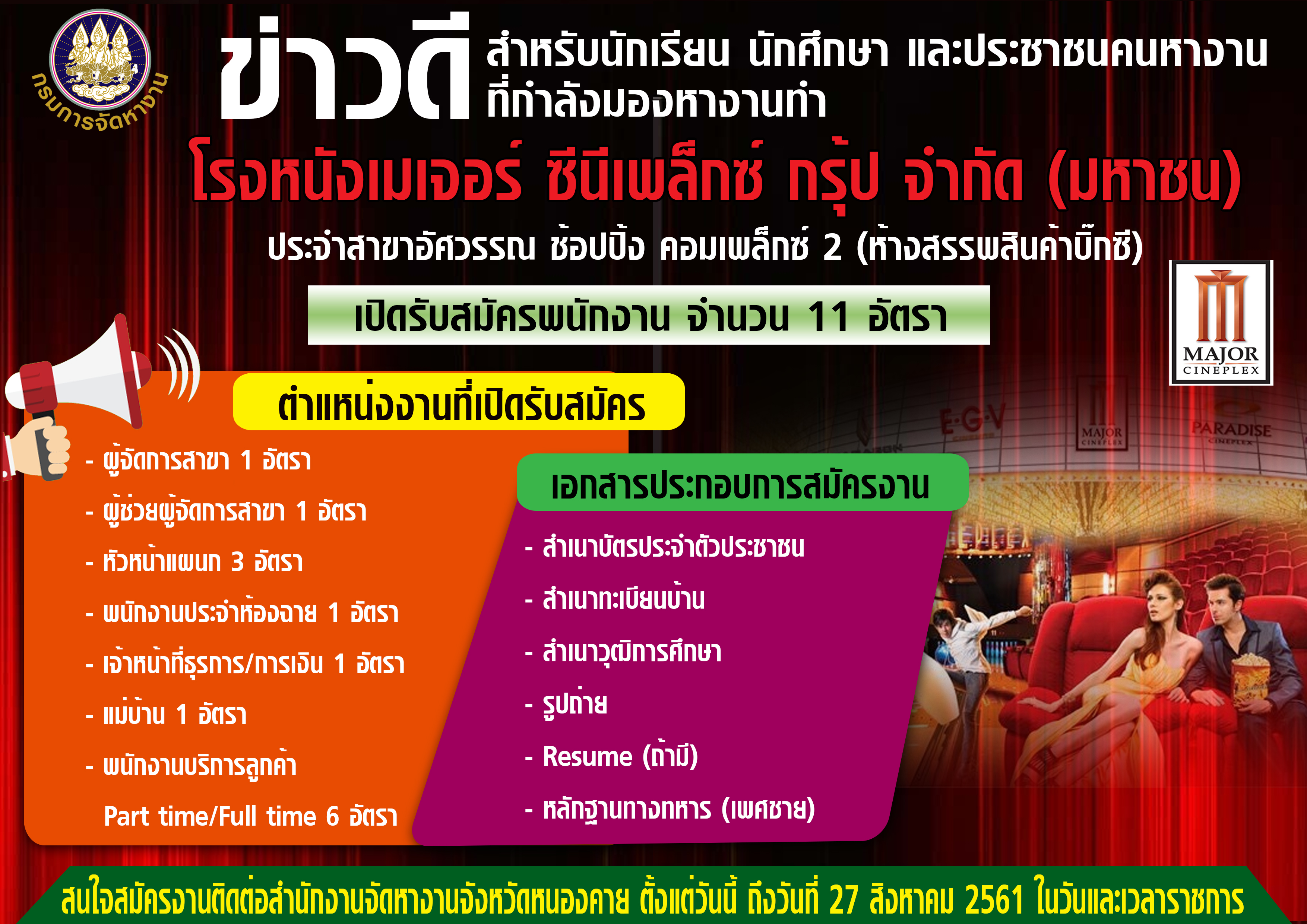 ข่าวดี!!! สำหรับนักเรียน นักศึกษาและประชาชนคนหางาน ที่กำมองหางานทำ โรงหนังเมเจอร์ซีนีเพล็กซ์ กรุ๊ป จำกัด เปิดรับสมัครพนักงาน ประจำห้างสรรพสินค้าอัศวรรณ ช้อปปิ้ง คอมเพล็กซ์ 2 (บิ๊กซี) สนใจสมัครงานติดต่อได้ที่สำนักงานจัดหางานจังหวัดหนองคาย ตั้งแต่วันนี้ ถึง 27 สิงหาคม 2561 ในวันและเวลาราชการ