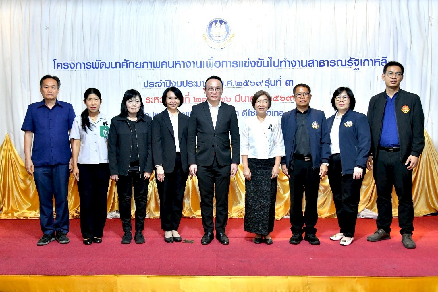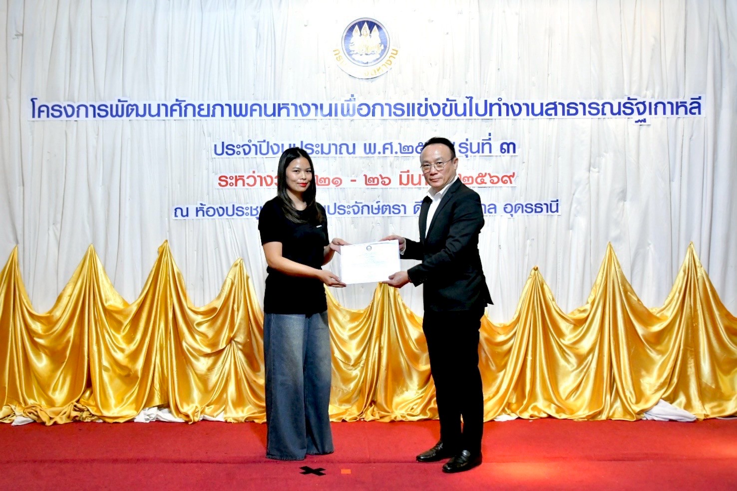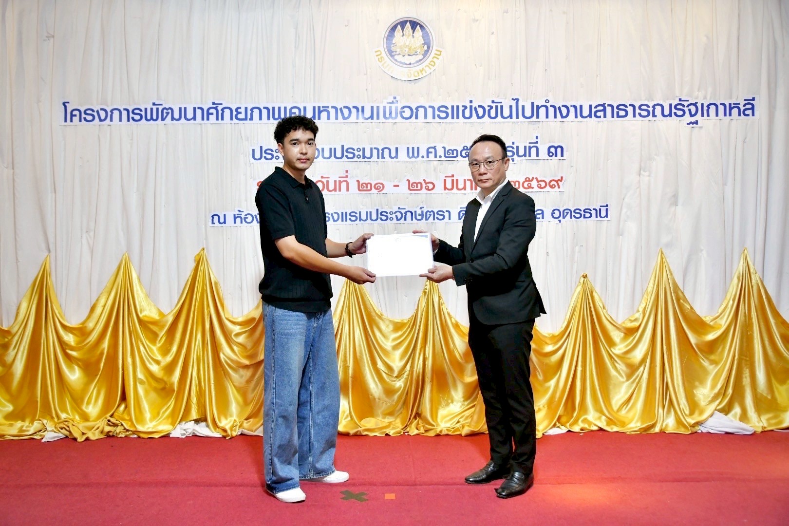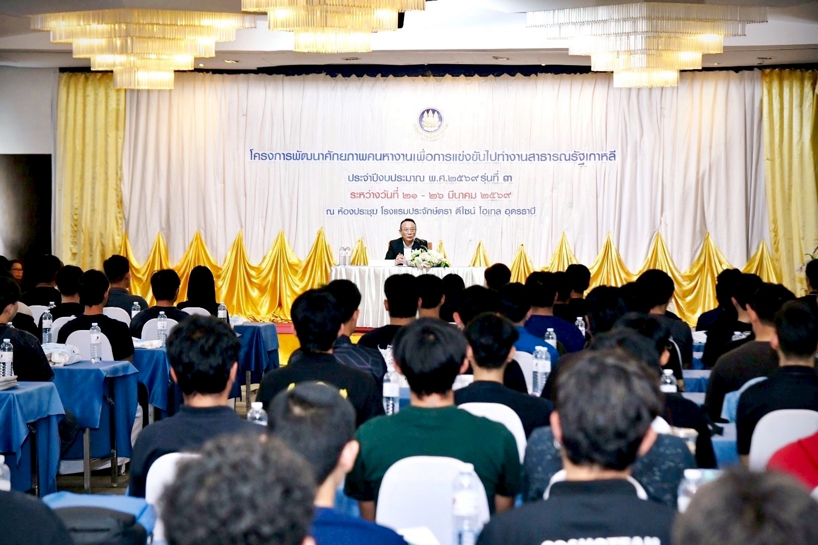 วันที่ 26 มีนาคม 2569 เวลา 14.00 น. นายสมชาย มรกตศรีวรรณ อธิบดีกรมการจัดหางาน เป็นประธานในพิธีปิดโครงการพัฒนาศักยภาพคนหางานเพื่อการแข่งขันไปทำงานสาธารณรัฐเกาหลี ประจำปีงบประมาณ พ.ศ. 2569 รุ่นที่ 3 และมอบวุฒิบัตรแก่ผู้สำเร็จการฝึกอบรม โดยมีนางสาวทิพวรรณ ธงศรี ผู้อำนวยการกองบริหารแรงงานไทยไปต่างประเทศ กล่าวรายงาน นางสาวศิริวรรณ ศุภมิตร ผู้ตรวจราชการกรม กรมการจัดหางาน นายวิรัตน์ กลางบุญเรือง จัดหางานจังหวัดอุดรธานี เจ้าหน้าที่ และหน่วยงานที่เกี่ยวข้องร่วมเป็นเกียรติในพิธี ณ โรงแรมประจักษ์ตรา ดีไซน์ โฮเทล จังหวัดอุดรธานี