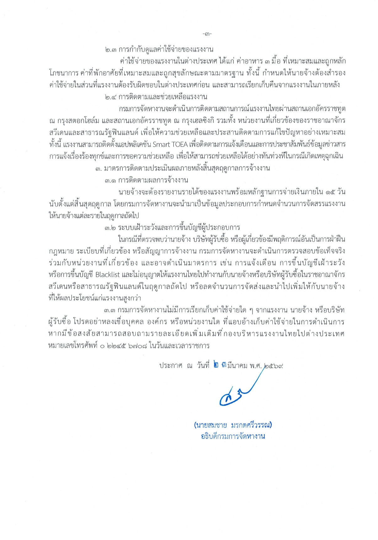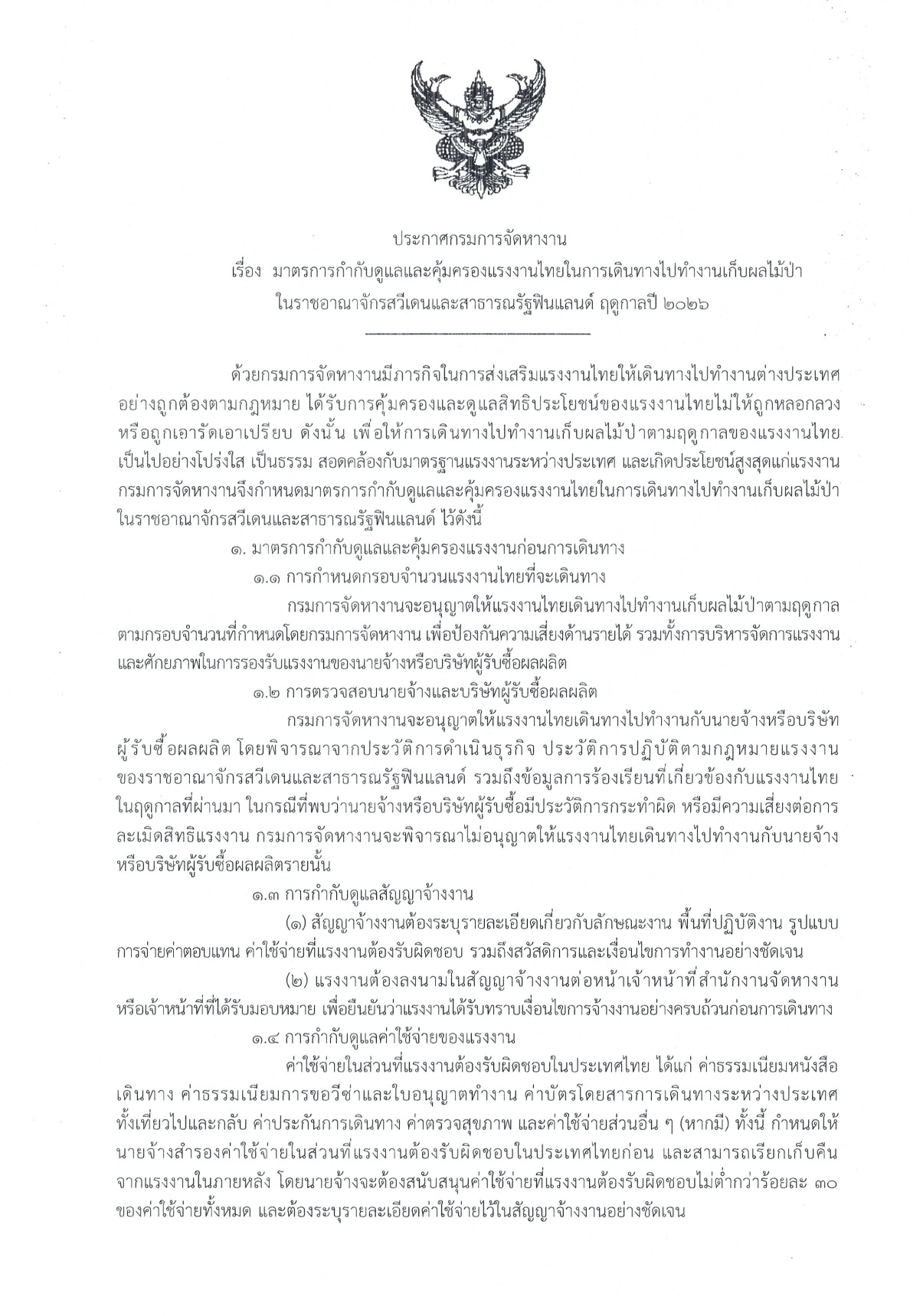 ประกาศกรมการจัดหางาน เรื่องมาตรการกำกับดูแลและคุ้มครองแรงงานไทยในการเดินทางไปทำงานเก็บผลไม้ป่าในราชอาณาจักรสวีเดนและสาธารณรัฐฟินแลนด์ ฤดูกาลปี 2026