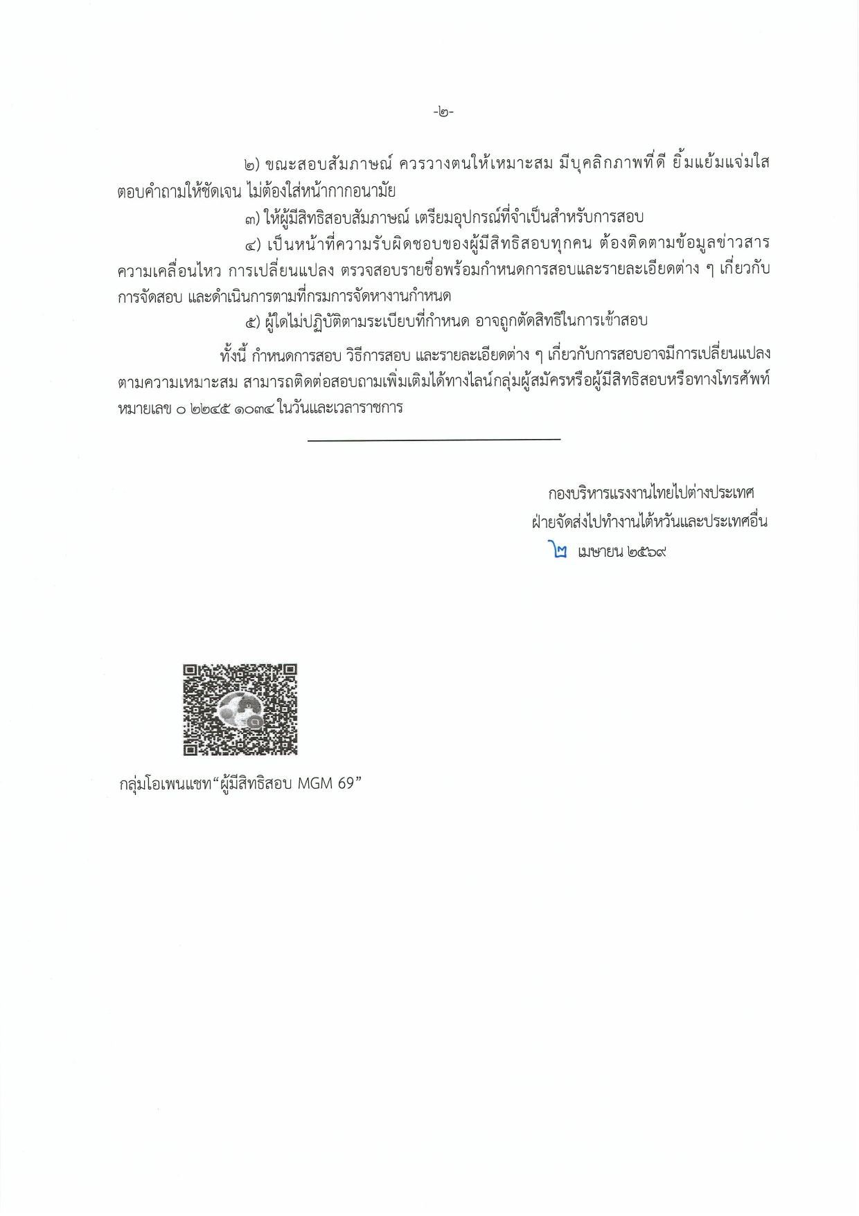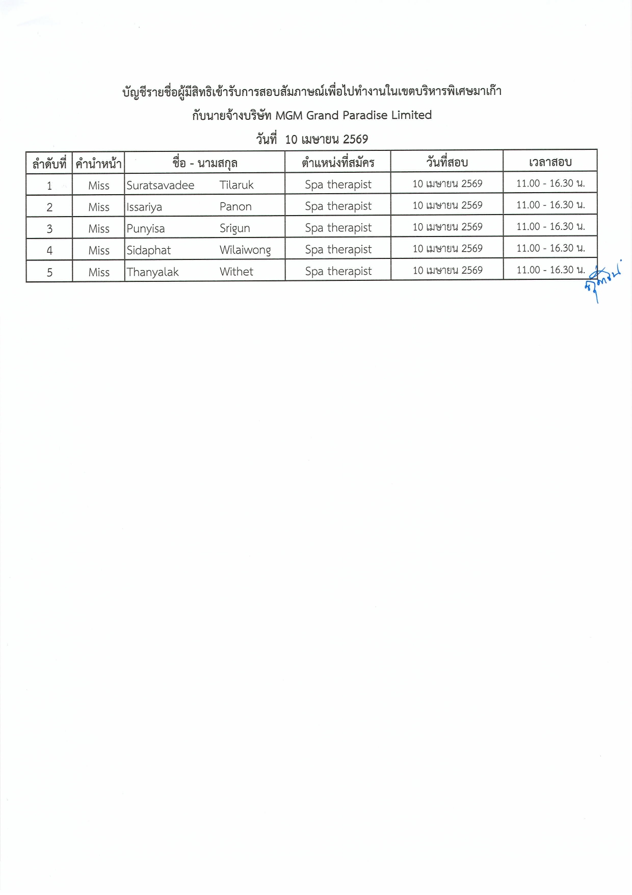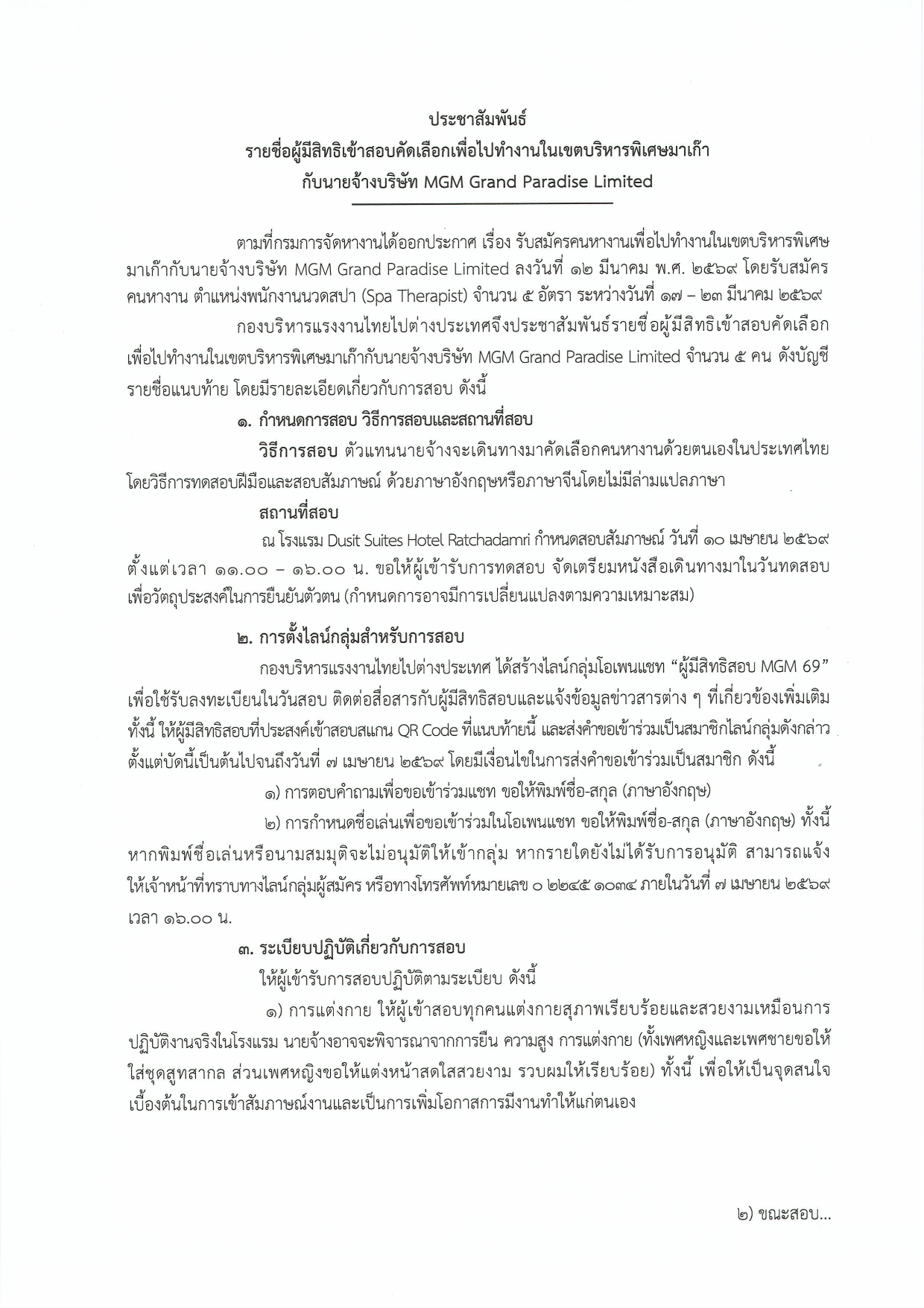 ประชาสัมพันธ์ รายชื่อผู้มีสิทธิเข้าสอบคัดเลือกเพื่อไปทำงานในเขตบริหารพิเศษมาเก๊า กับนายจ้างบริษัท MGM Grand Paradise Limited