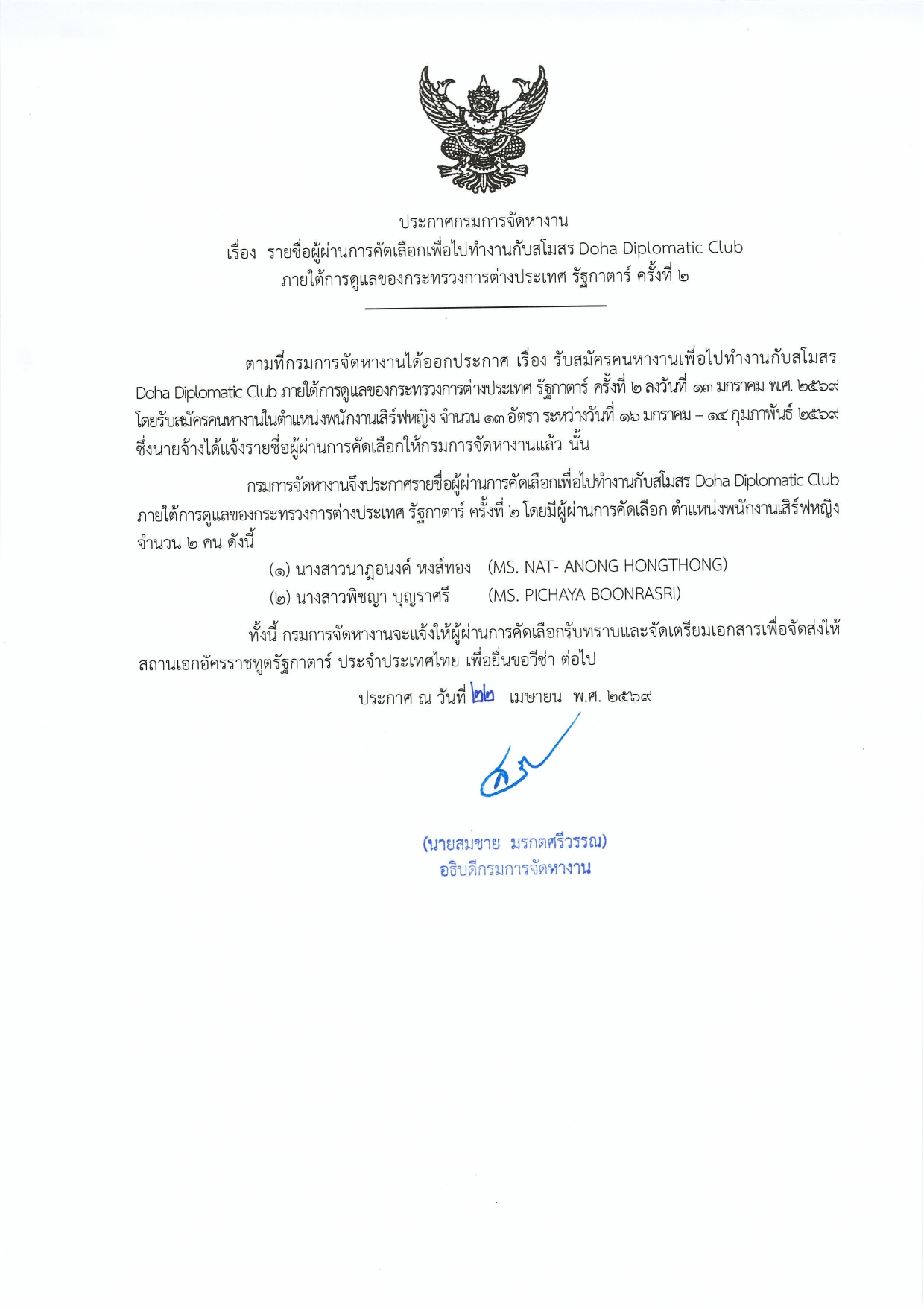 ประกาศกรมการจัดหางาน เรื่อง รายชื่อผู้ผ่านการคัดเลือกเพื่อไปทำงานกับสโมสร Doha Diplomatic Club ภายใต้การดูแลของกระทรวงการต่างประเทศ รัฐกาตาร์ ครั้งที่ 2
