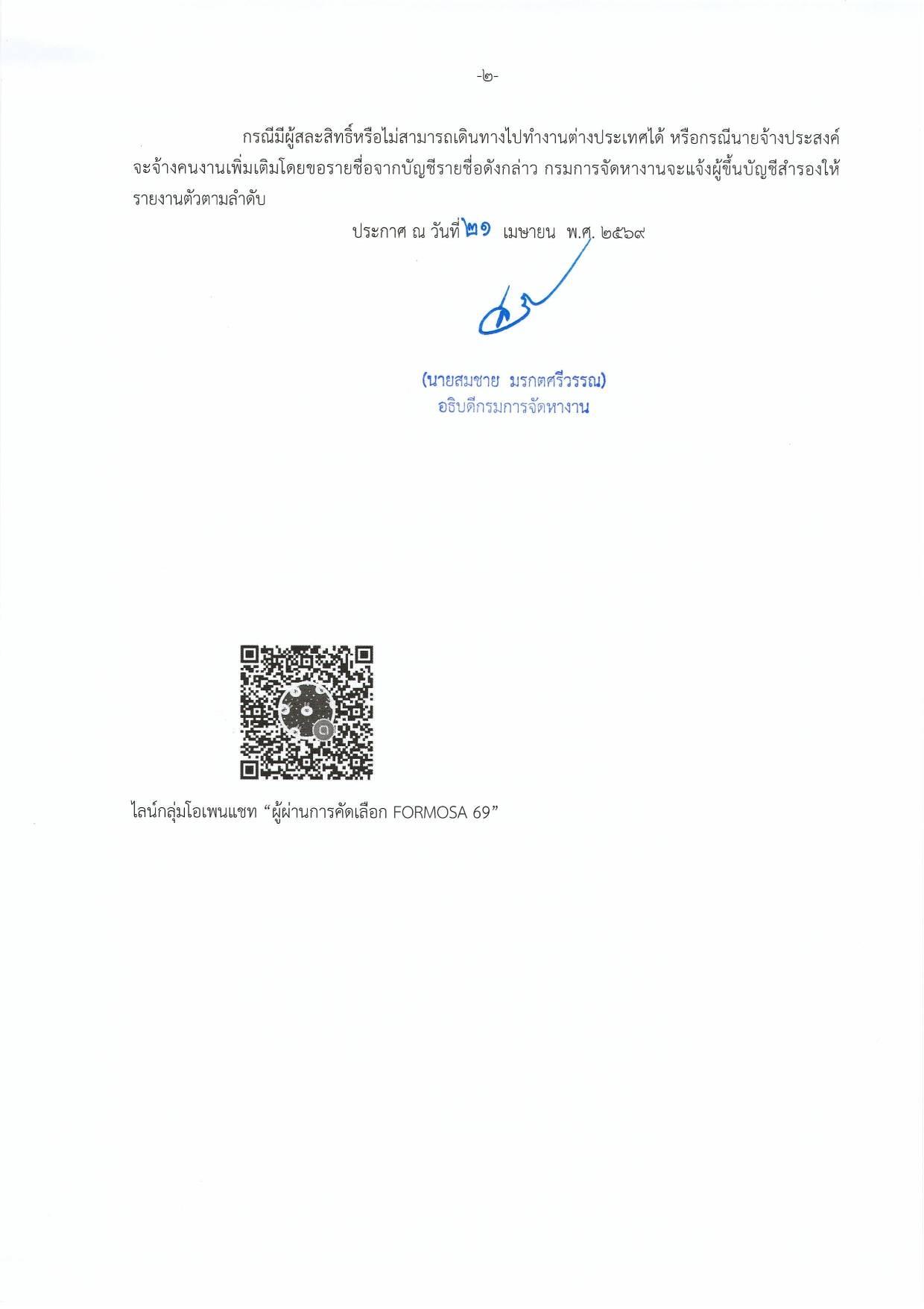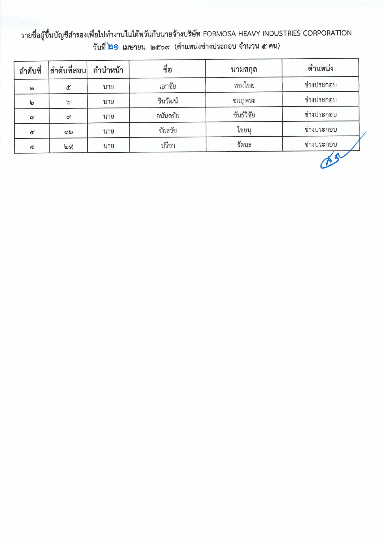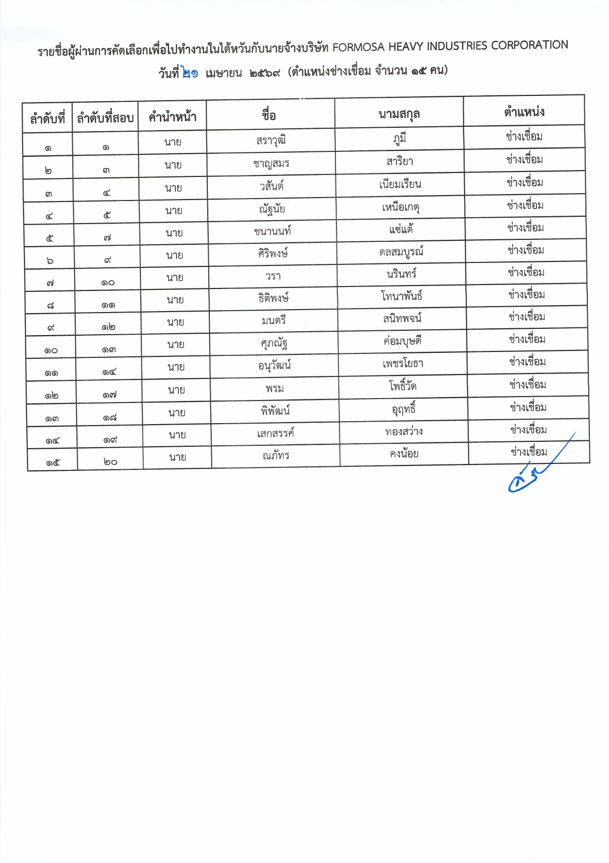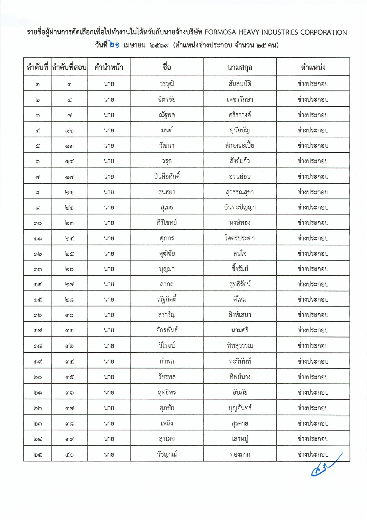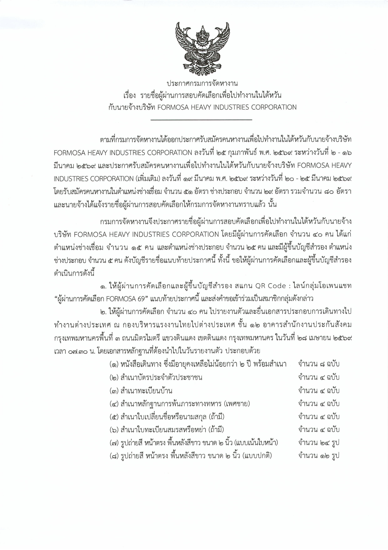 ประกาศกรมการจัดหางาน เรื่อง รายชื่อผู้ผ่านการสอบคัดเลือกเพื่อไปทำงานในไต้หวัน กับนายจ้างบริษัท FORMOSA HEAVY INDUSTRIES CORPORATION