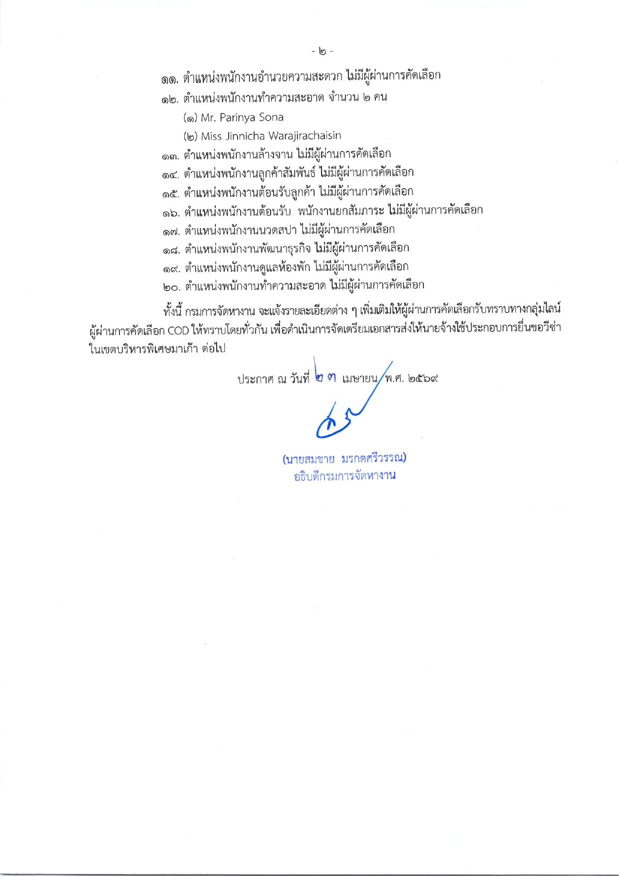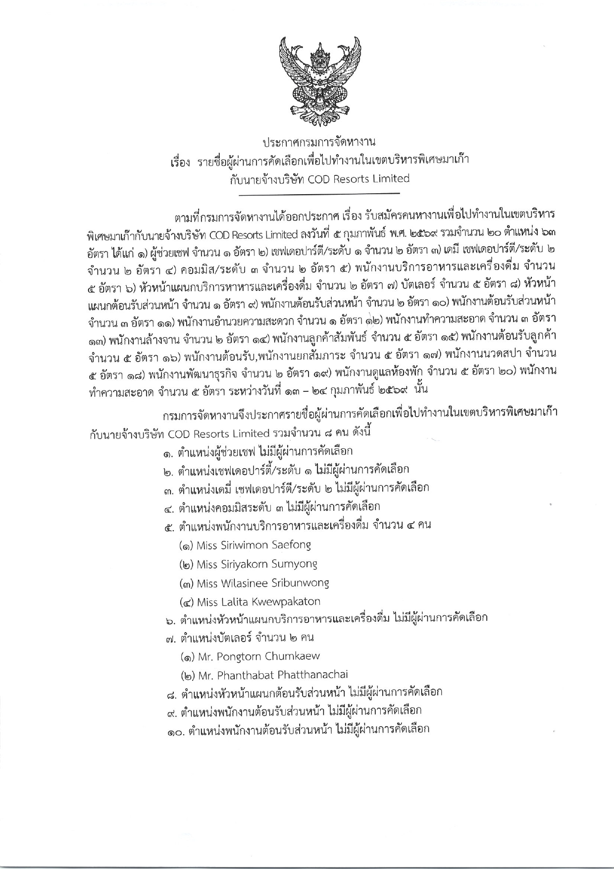 ประกาศกรมการจัดหางาน เรื่อง รายชื่อผู้ผ่านการสอบคัดเลือกเพื่อไปทำงานในเขตบริหารพิเศษมาเก๊า กับนายจ้างบริษัท COD Resorts Limited