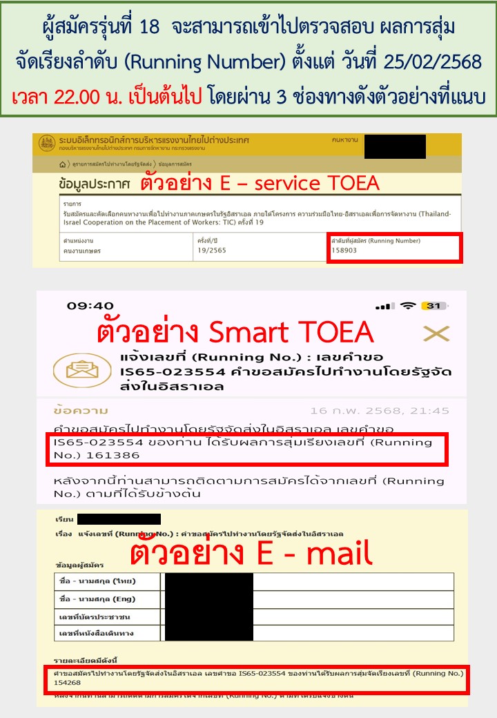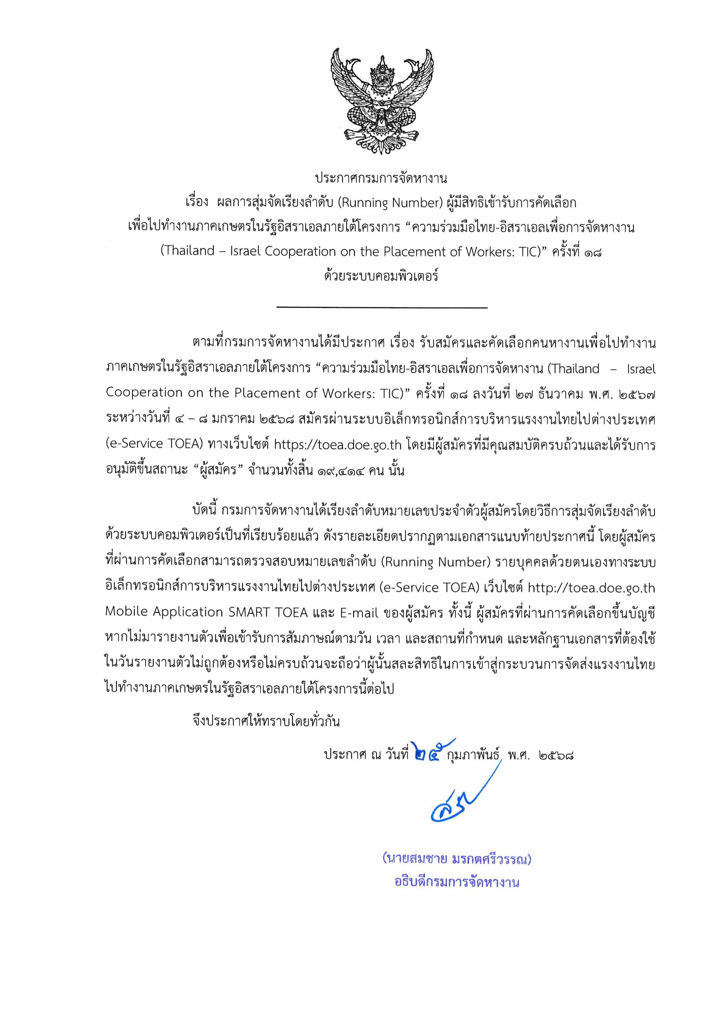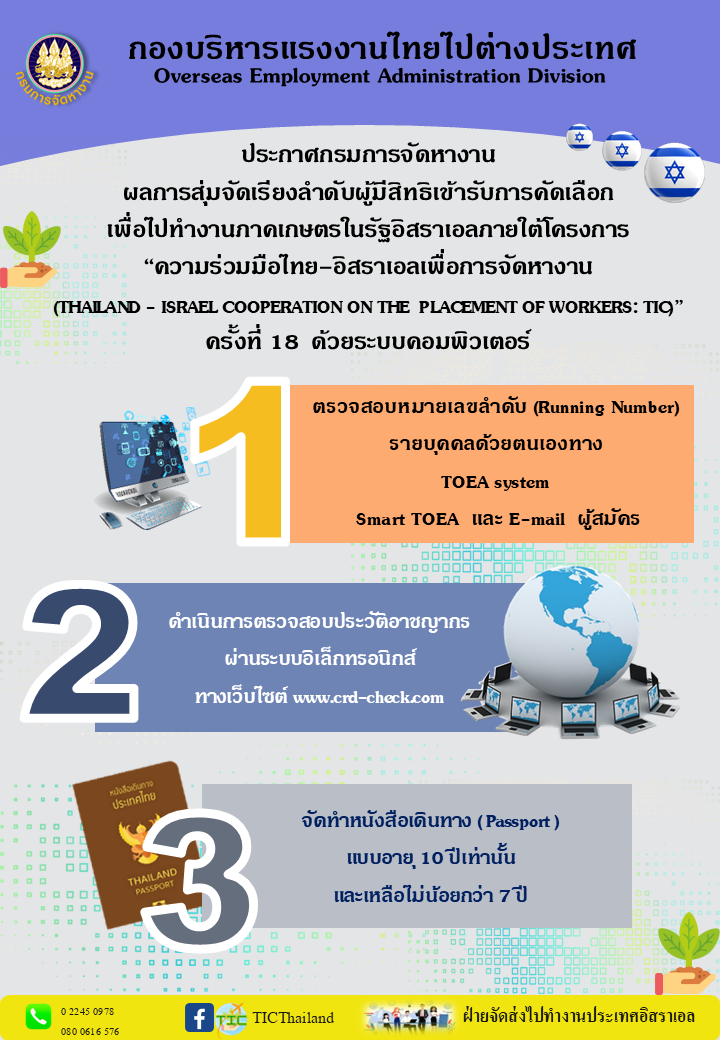 ประกาศกรมการจัดหางาน เรื่อง ผลการสุ่มจัดเรียงลำดับ (Running Number) ผู้มีสิทธิเข้ารับการคัดเลือกเพื่อไปทำงานภาคเกษตรในรัฐอิสราเอลภายใต้โครงการ "ความร่วมมือไทย-อิสราเอลเพื่อการจัดหางาน (Thailand - Israel Cooperation on the Placement of Workers: TIC)" ครั้งที่ 18