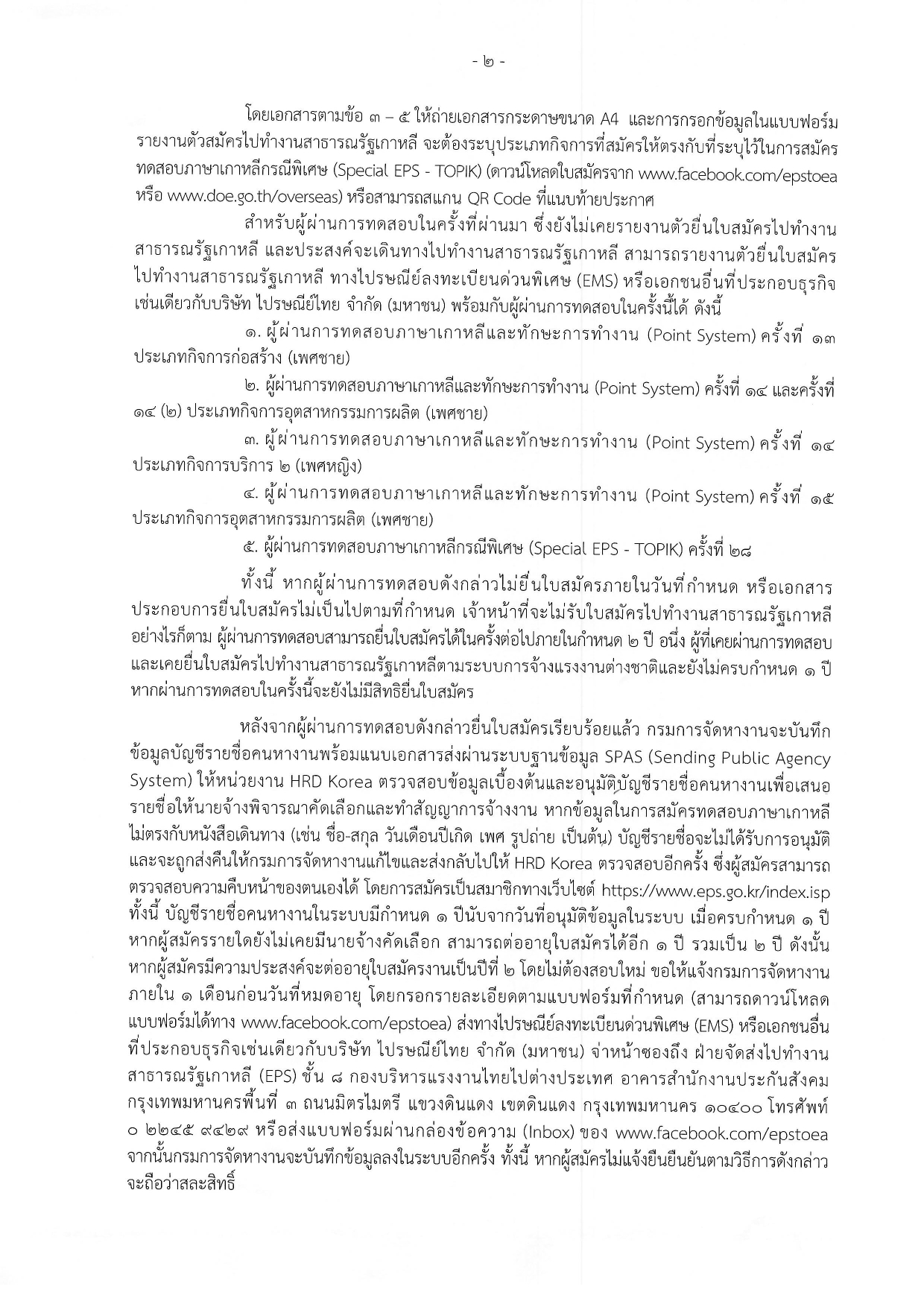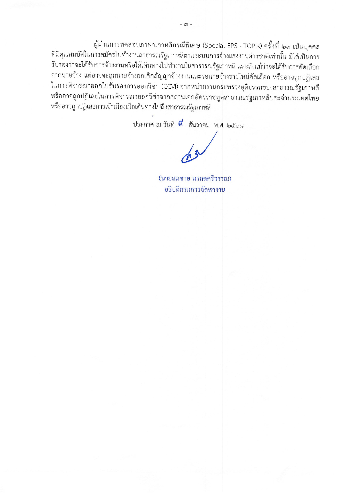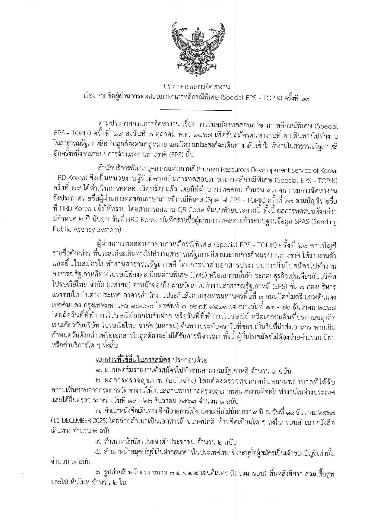 ประกาศกรมการจัดหางาน เรื่อง รายชื่อผู้ผ่านการทดสอบภาษาเกาหลีกรณีพิเศษ (Special - TOPIK) ครั้งที่ 29