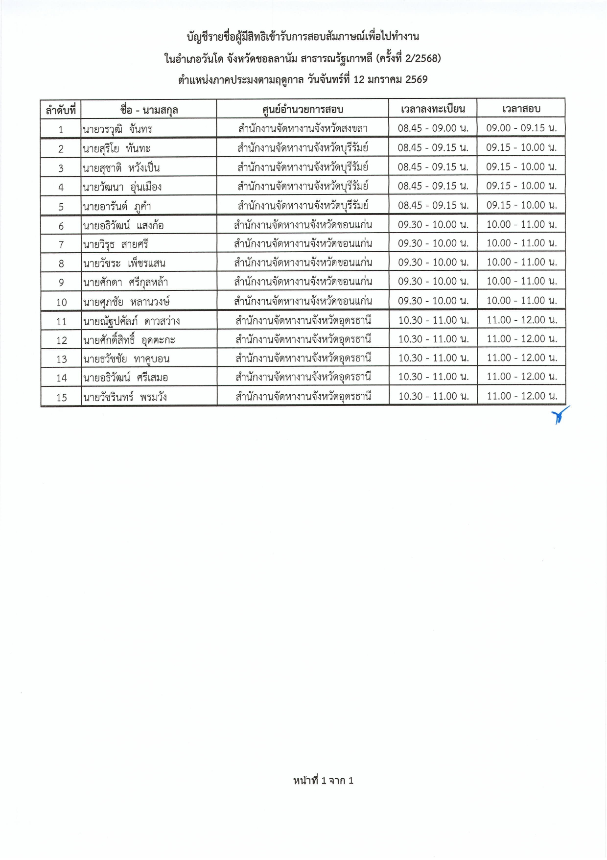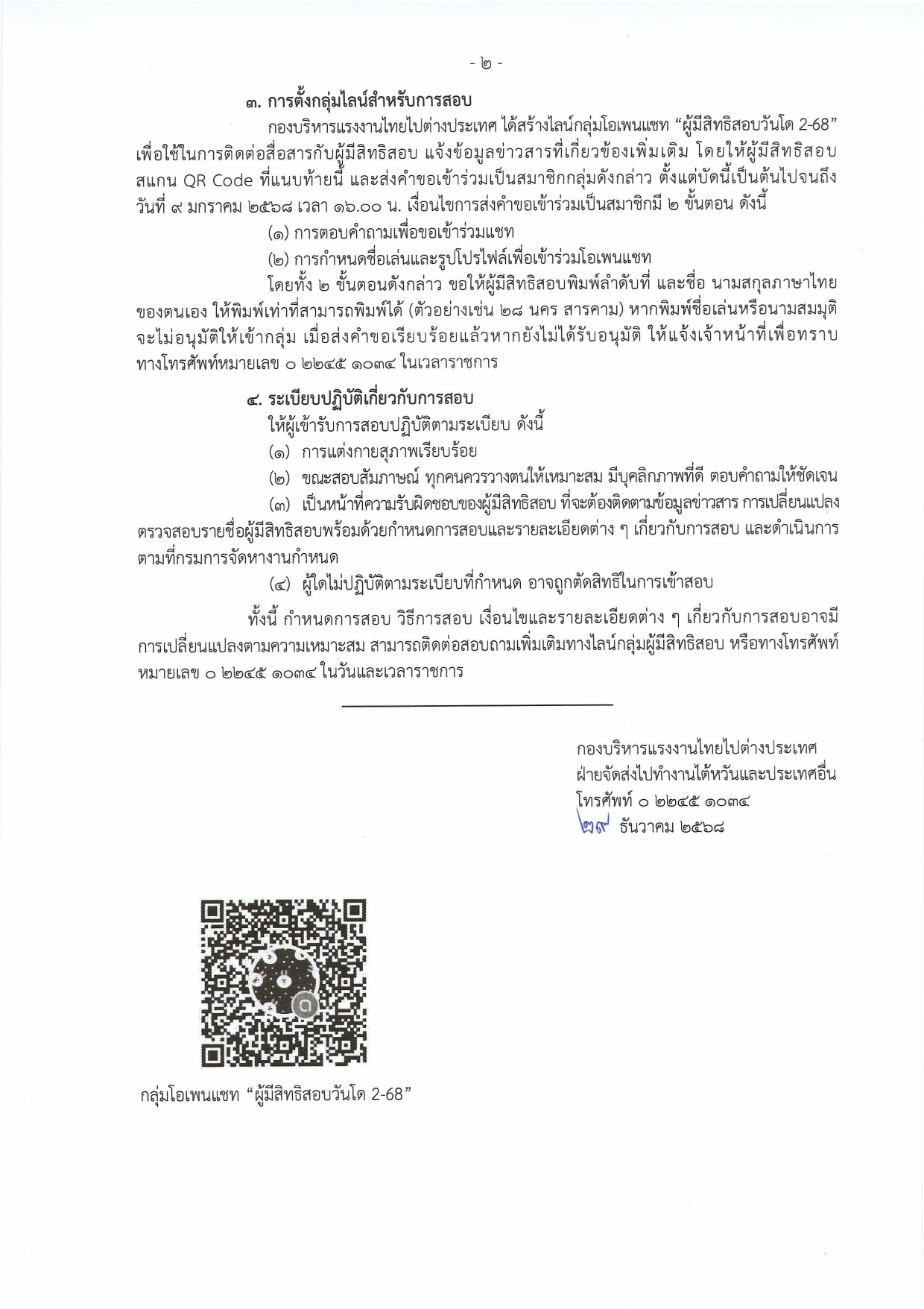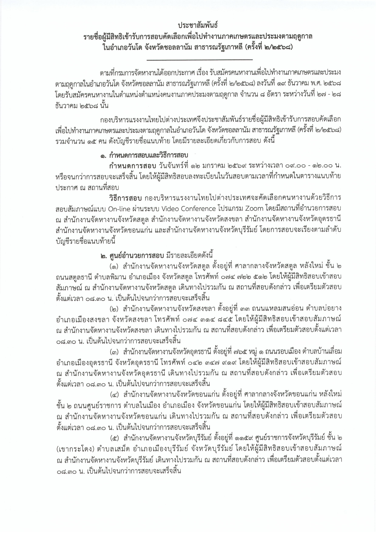 ประกาศกรมการจัดหางาน เรื่อง รายชื่อผู้มีสิทธิเข้ารับการสอบคัดเลือกเพื่อไปทำงานภาคเกษตรและประมงตามฤดูกาลในอำเภอวันโด จังหวัดชอลลานัม สาธารณรัฐเกาหลี (ครั้งที่ 2/2568)