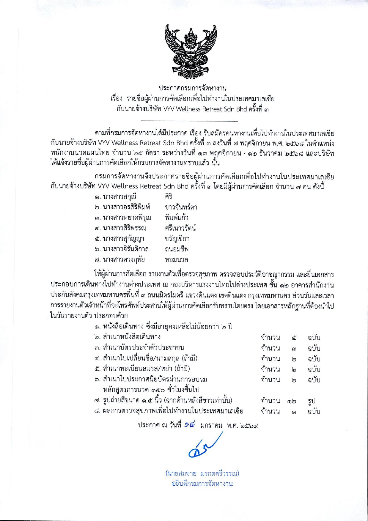 ประกาศกรมการจัดหางาน เรื่อง รายชื่อผู้ผ่านการคัดเลือกเพื่อไปทำงานในประเทศมาเลเซีย กับนายจ้างบริษัท VYV Wellness Retreat Sdn Bhd ครั้งที่ 3