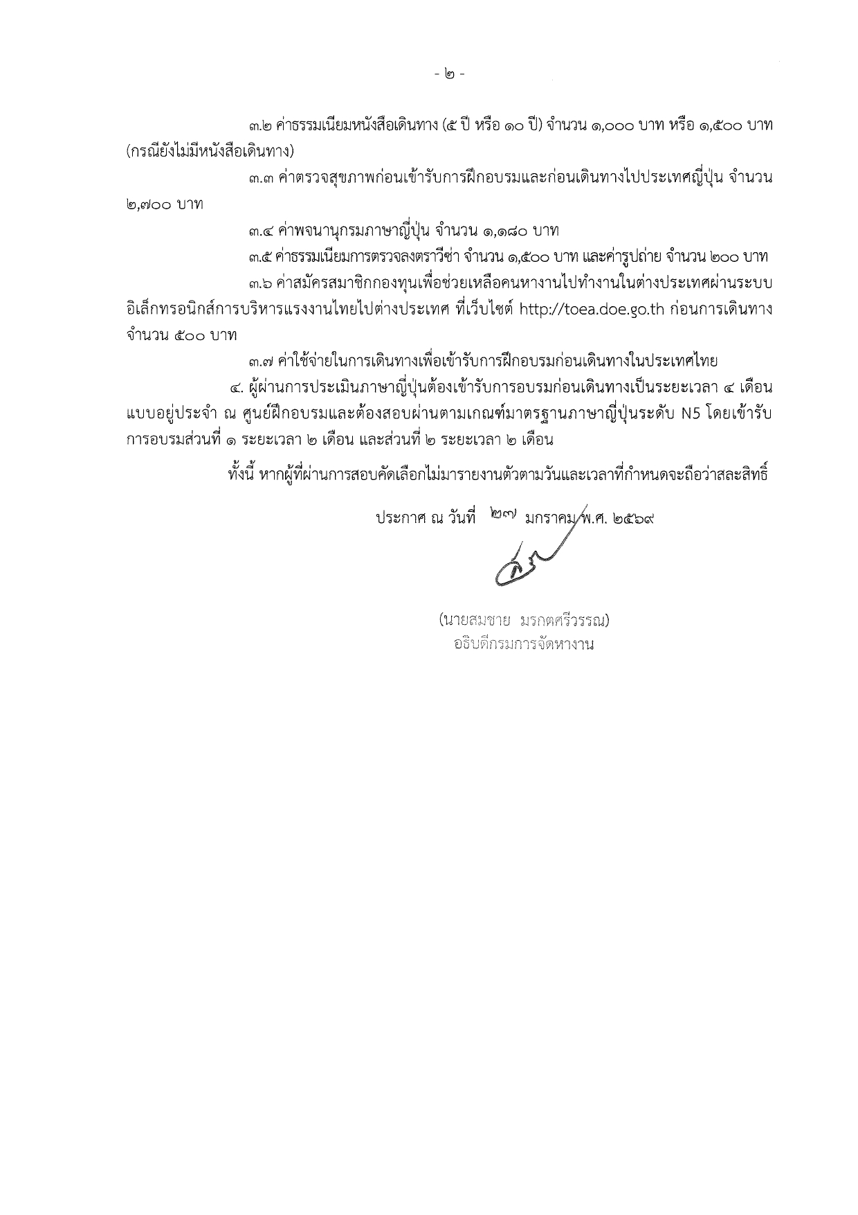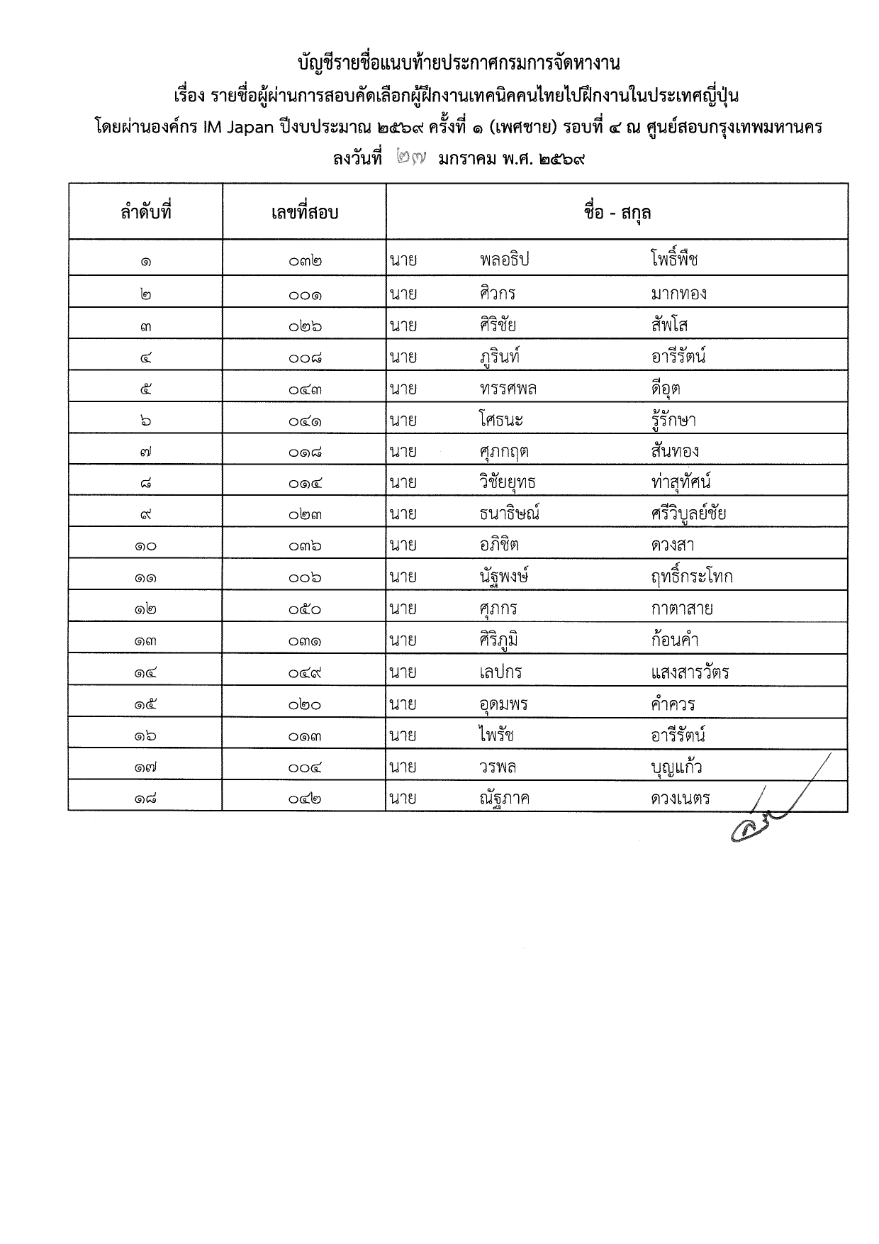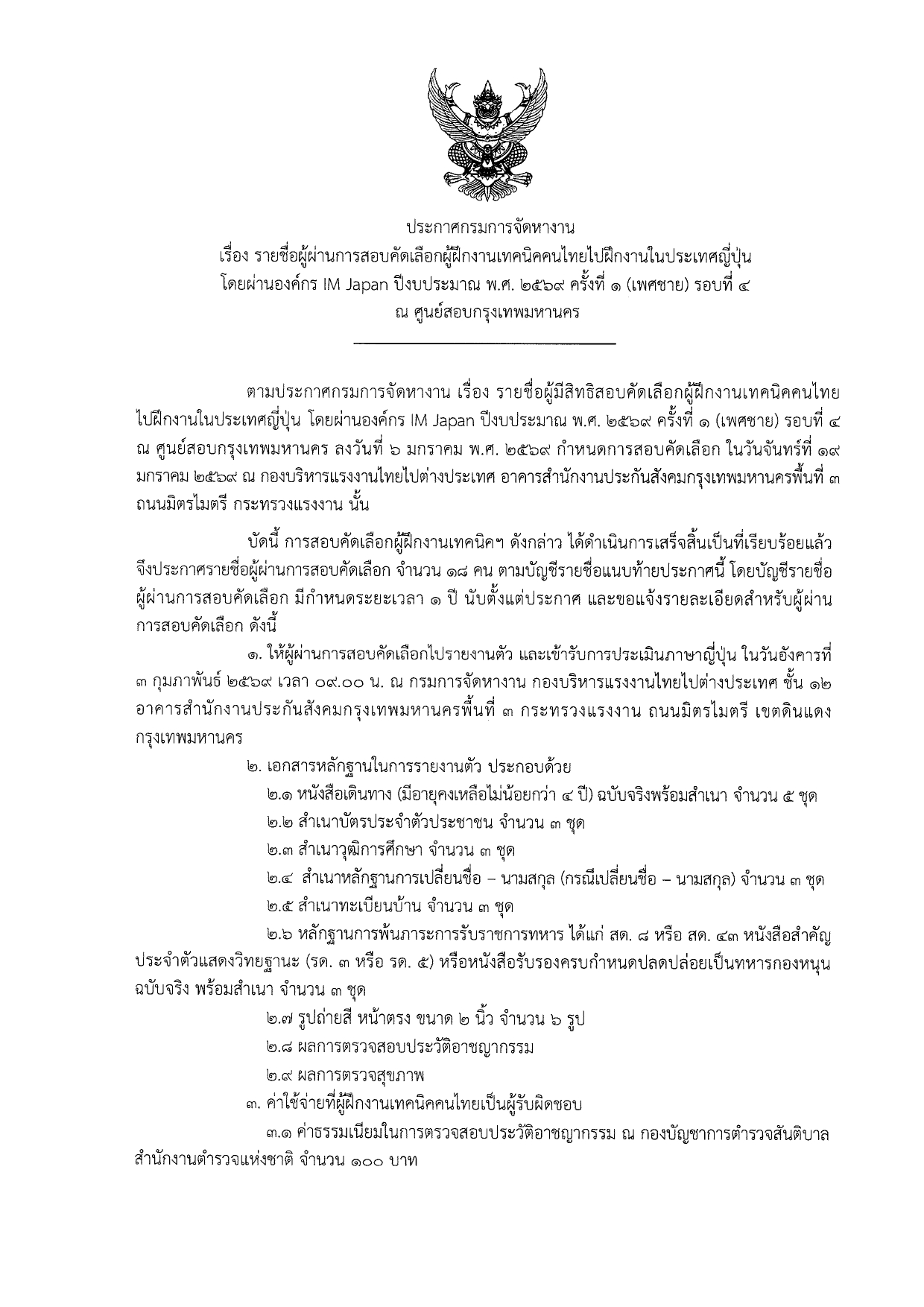 ประกาศกรมการจัดหางาน เรื่อง รายชื่อผู้ผ่านการสอบคัดเลือกผู้ฝึกงานเทคนิคคนไทยไปฝึกงานในประเทศญี่ปุ่น โดยผ่านองค์กร IM Japan ปีงบประมาณ พ.ศ. 2569 ครั้งที่ 1 (เพศชาย) รอบที่ 4 ณ ศูนย์สอบกรุงเทพมหานคร