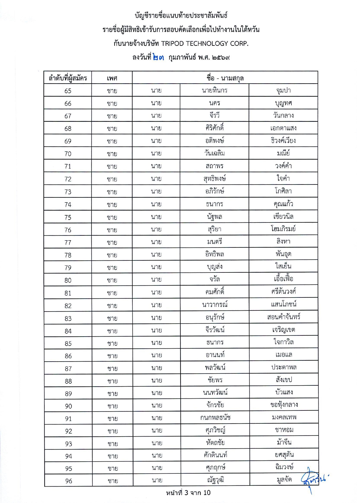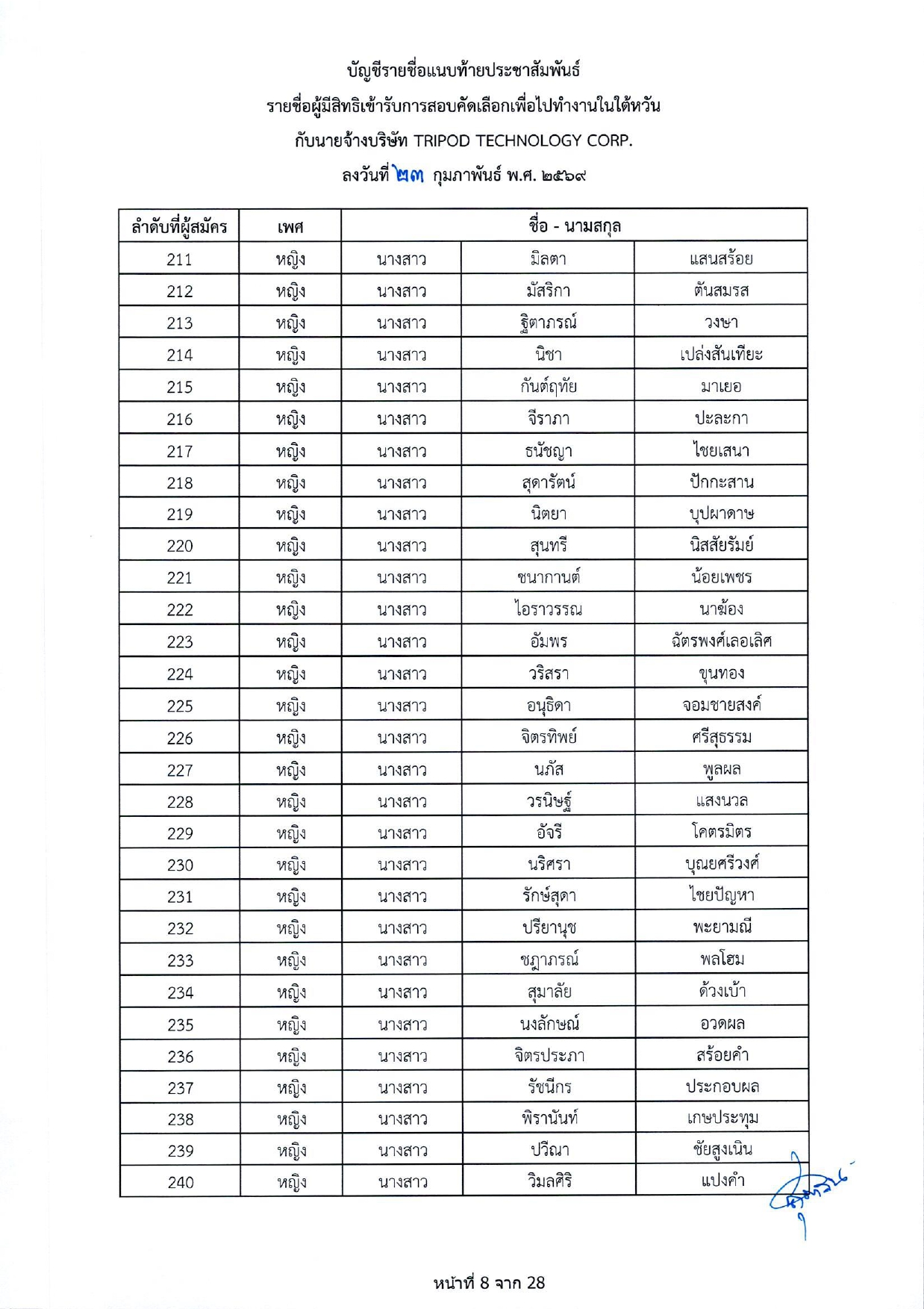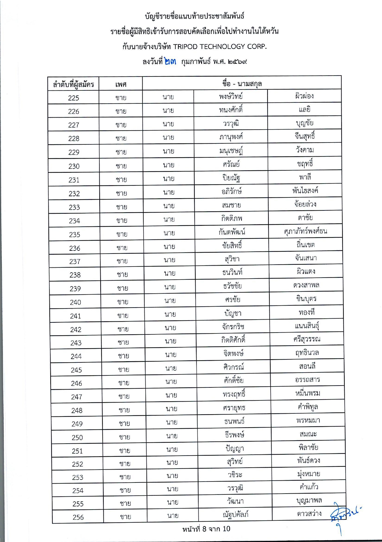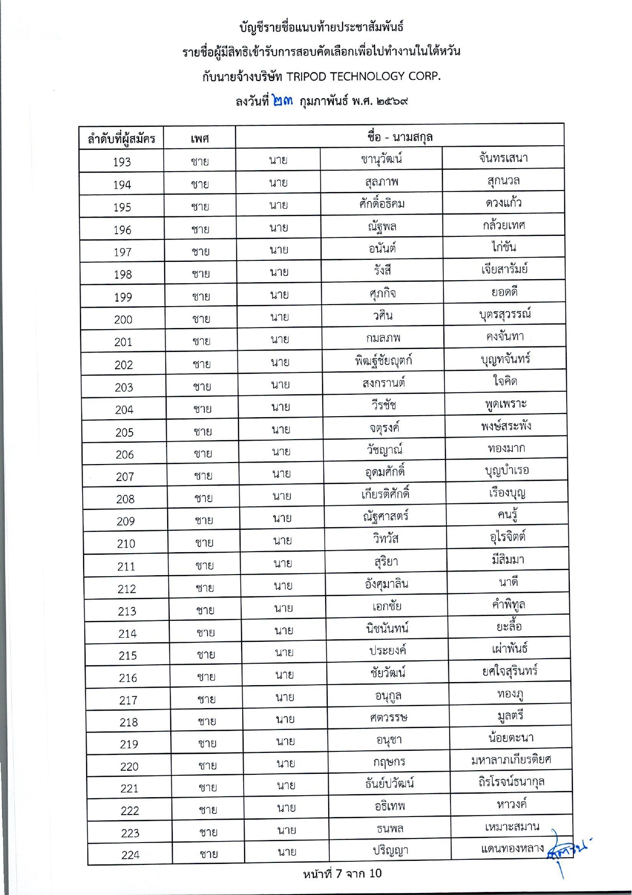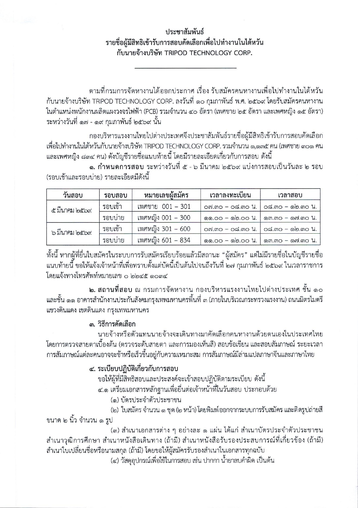 รายชื่อผู้มีสิทธิเข้ารับการกอบคัดเลือกเพื่อไปทำงานในไต้หวัน กับนายจ้างบริษัท TRIPOD TECHNOLOGY CORP.