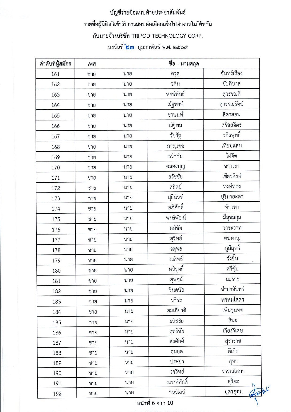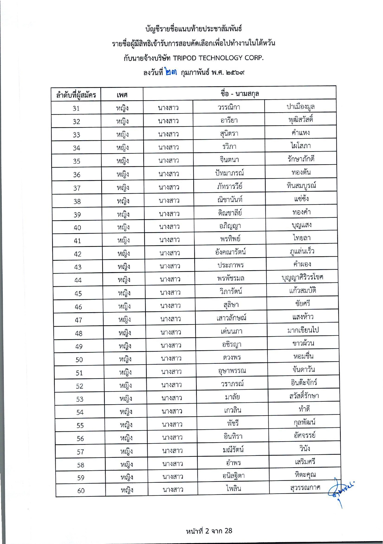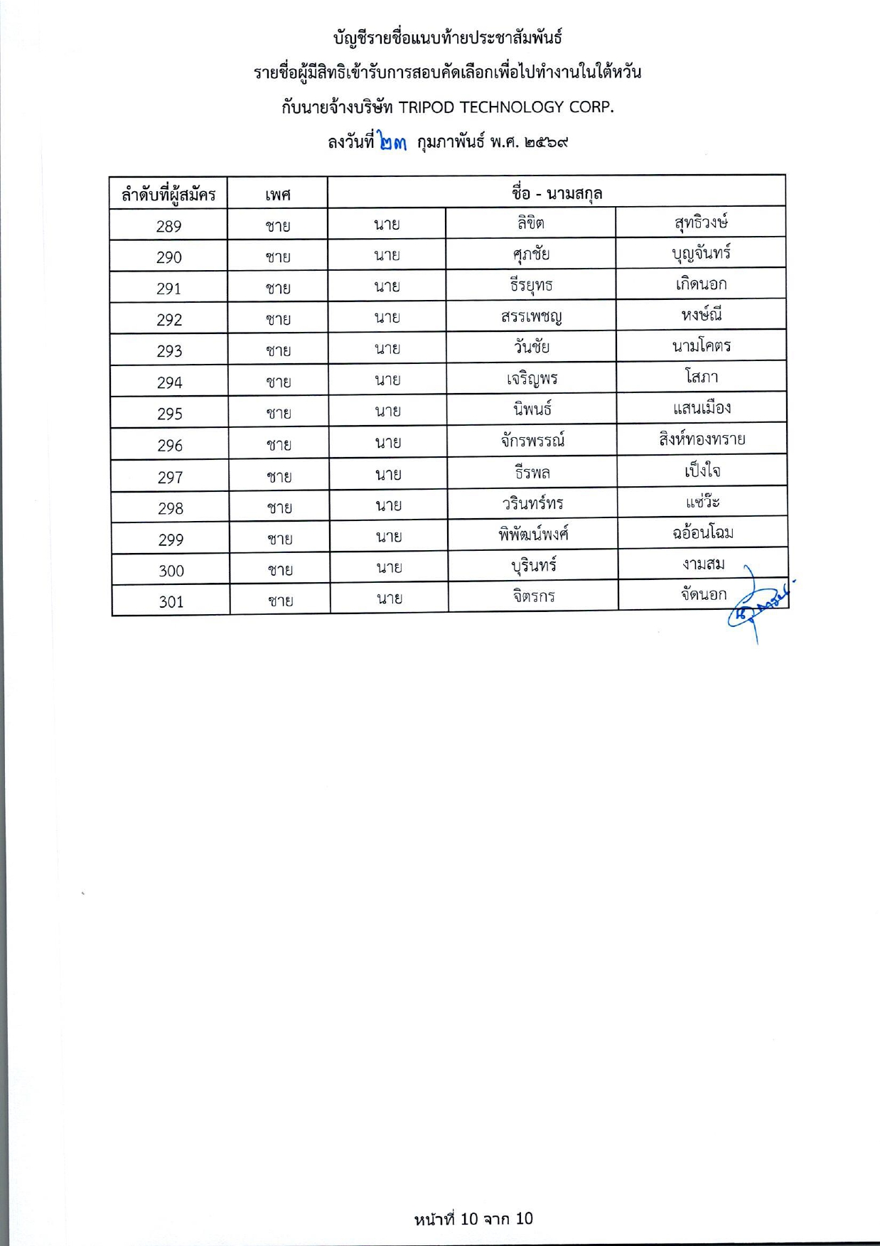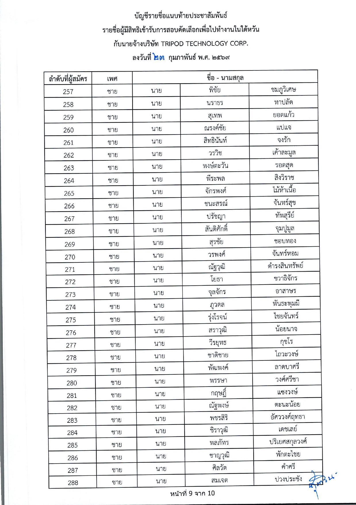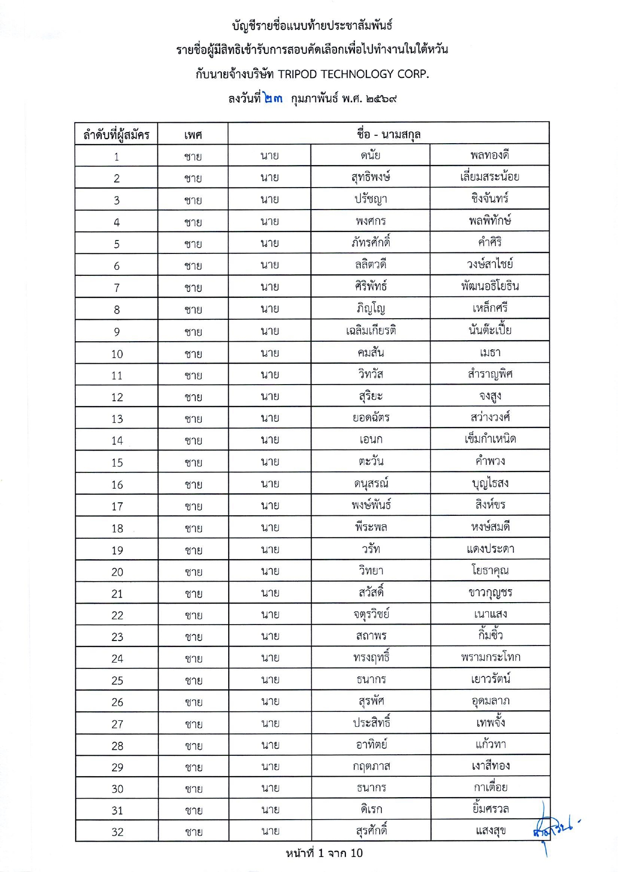 รายชื่อผู้มีสิทธิเข้ารับการกอบคัดเลือกเพื่อไปทำงานในไต้หวัน กับนายจ้างบริษัท TRIPOD TECHNOLOGY CORP.