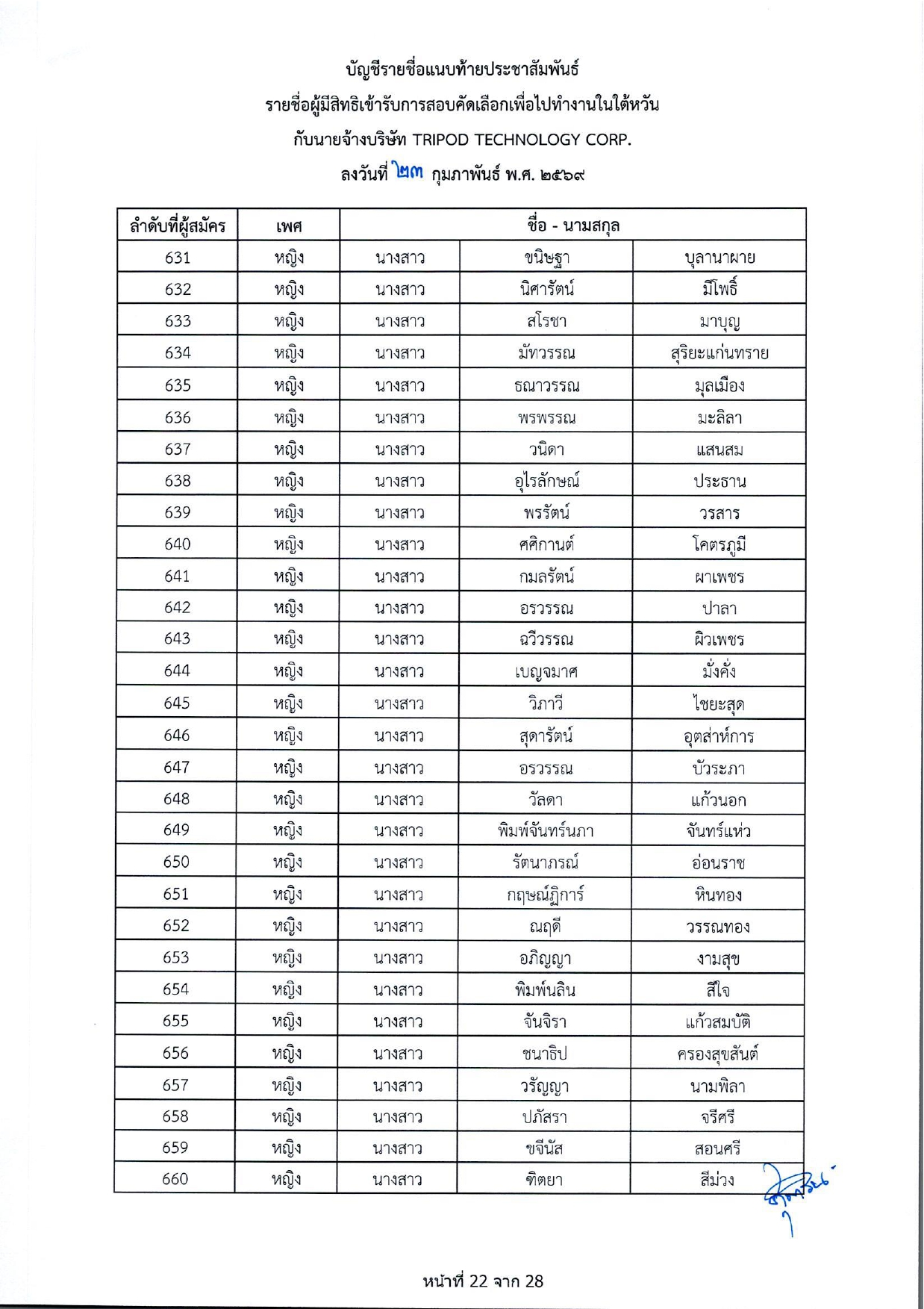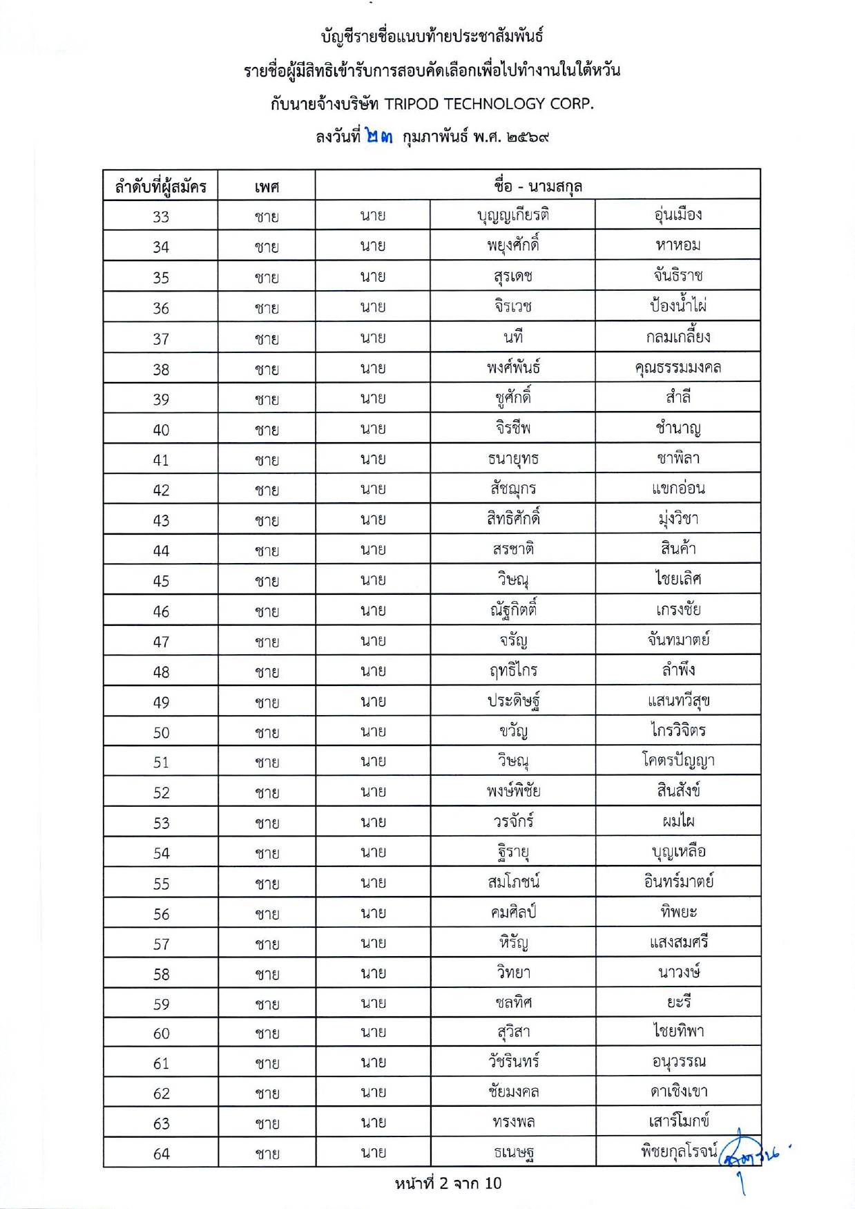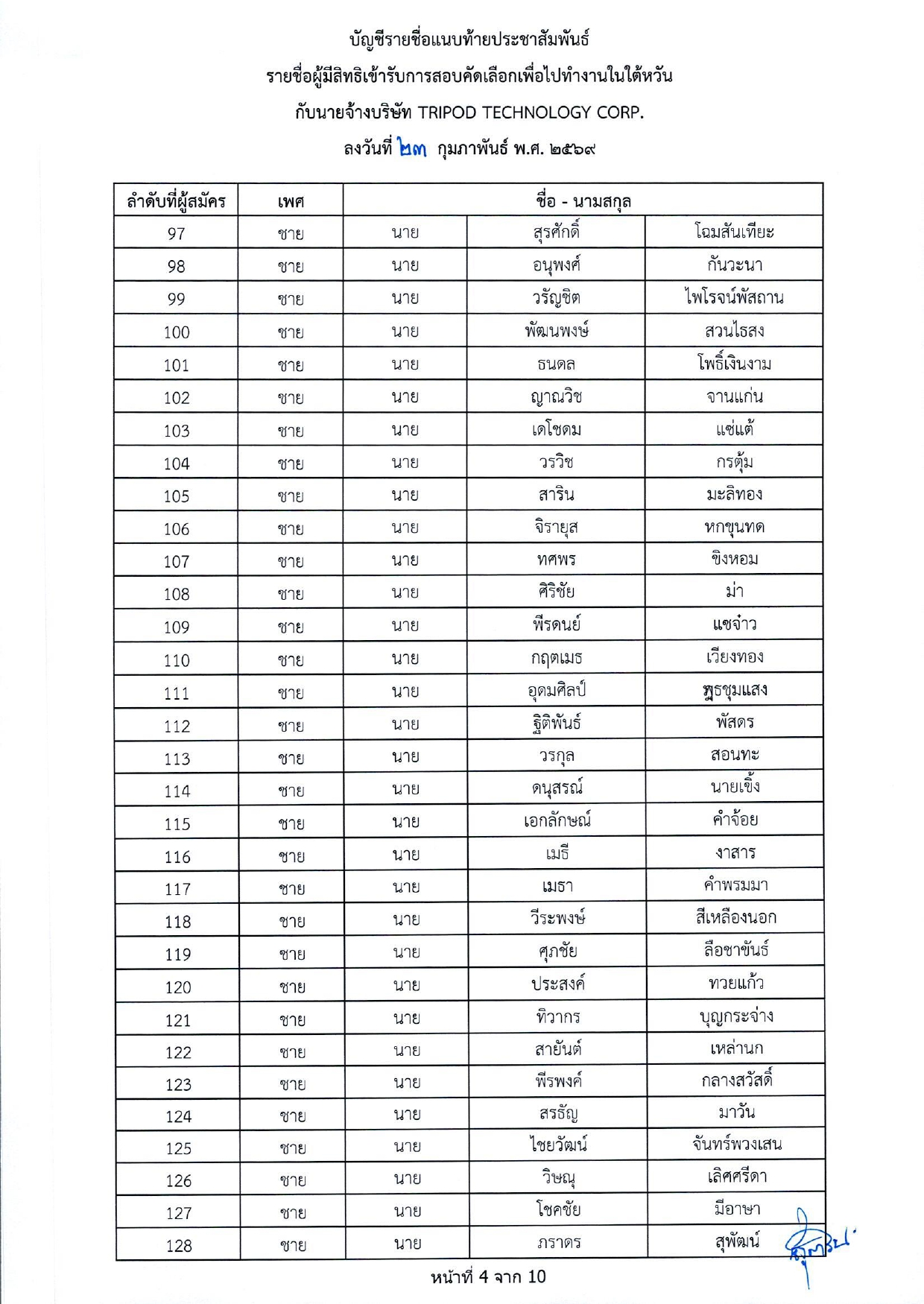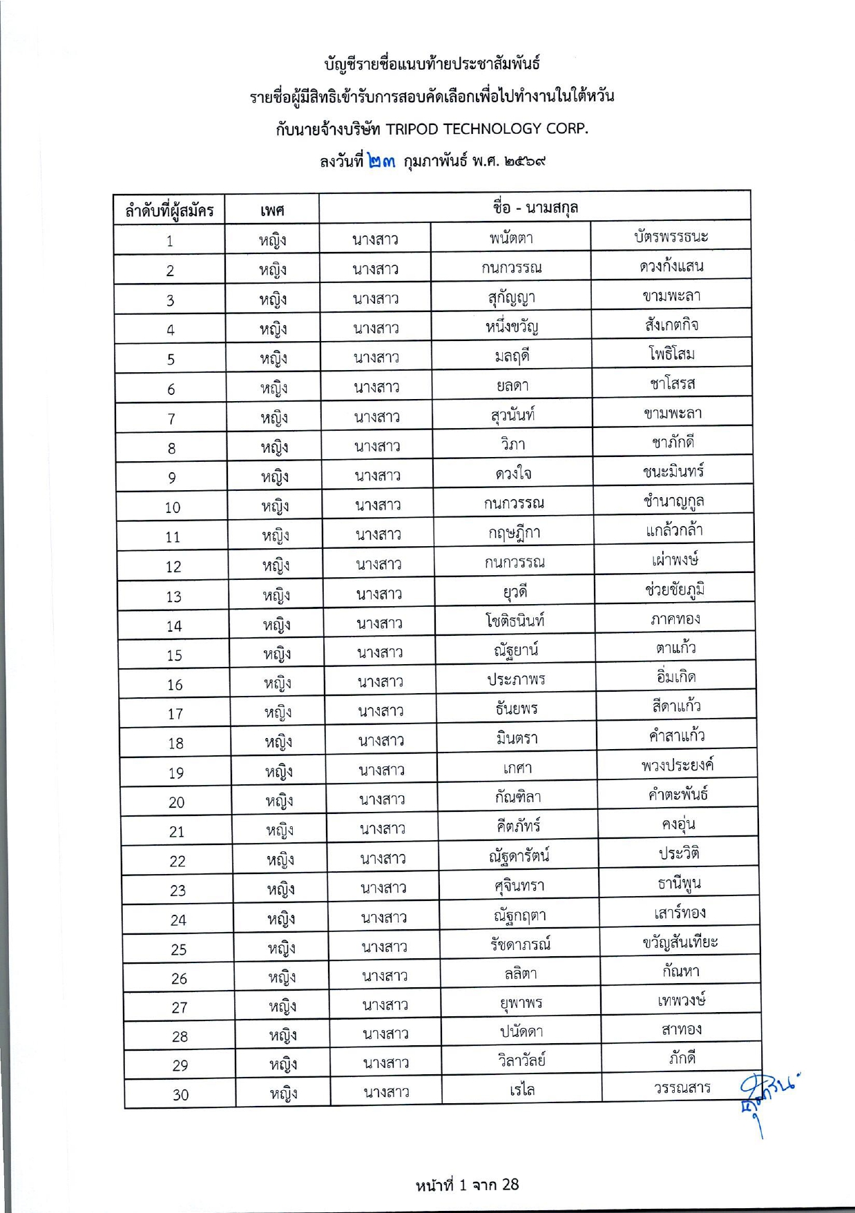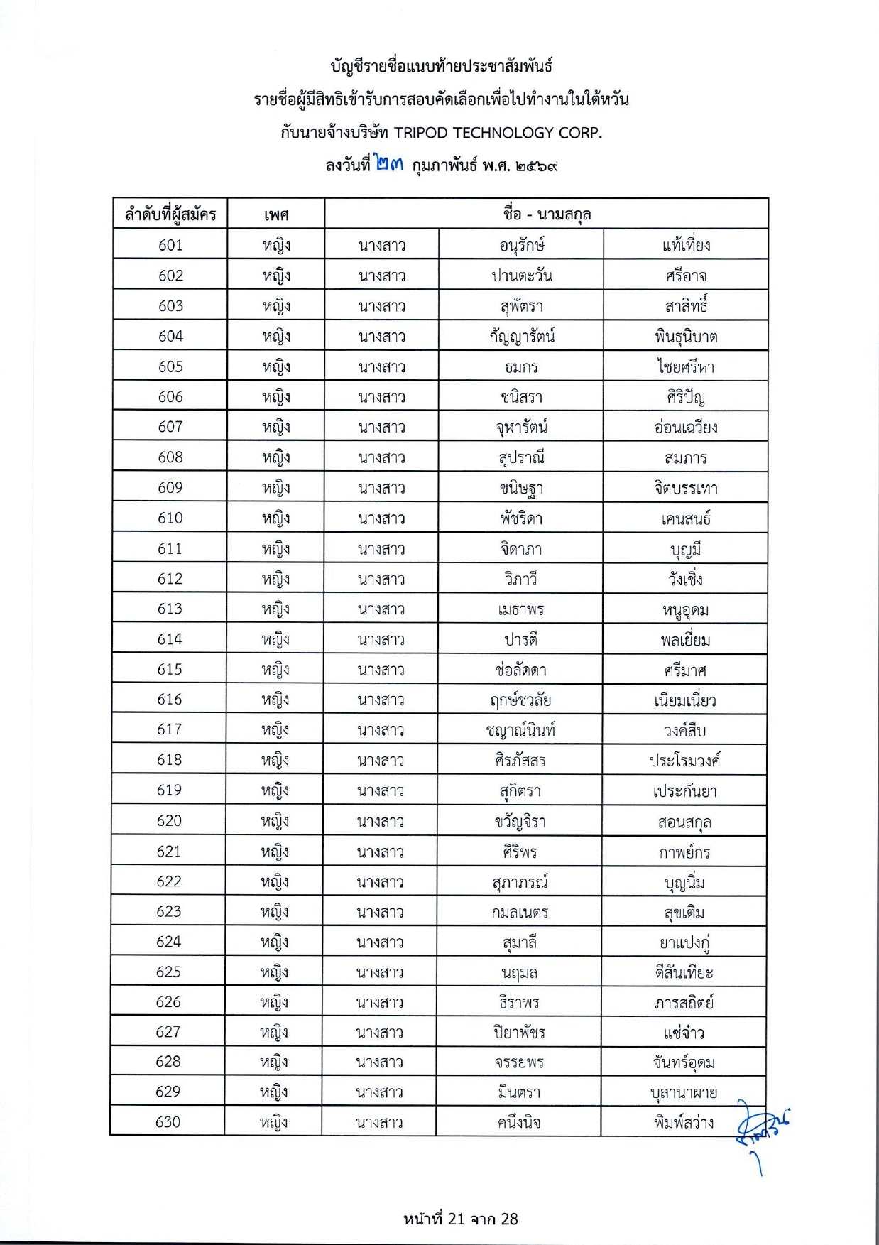 รายชื่อผู้มีสิทธิเข้ารับการกอบคัดเลือกเพื่อไปทำงานในไต้หวัน กับนายจ้างบริษัท TRIPOD TECHNOLOGY CORP.