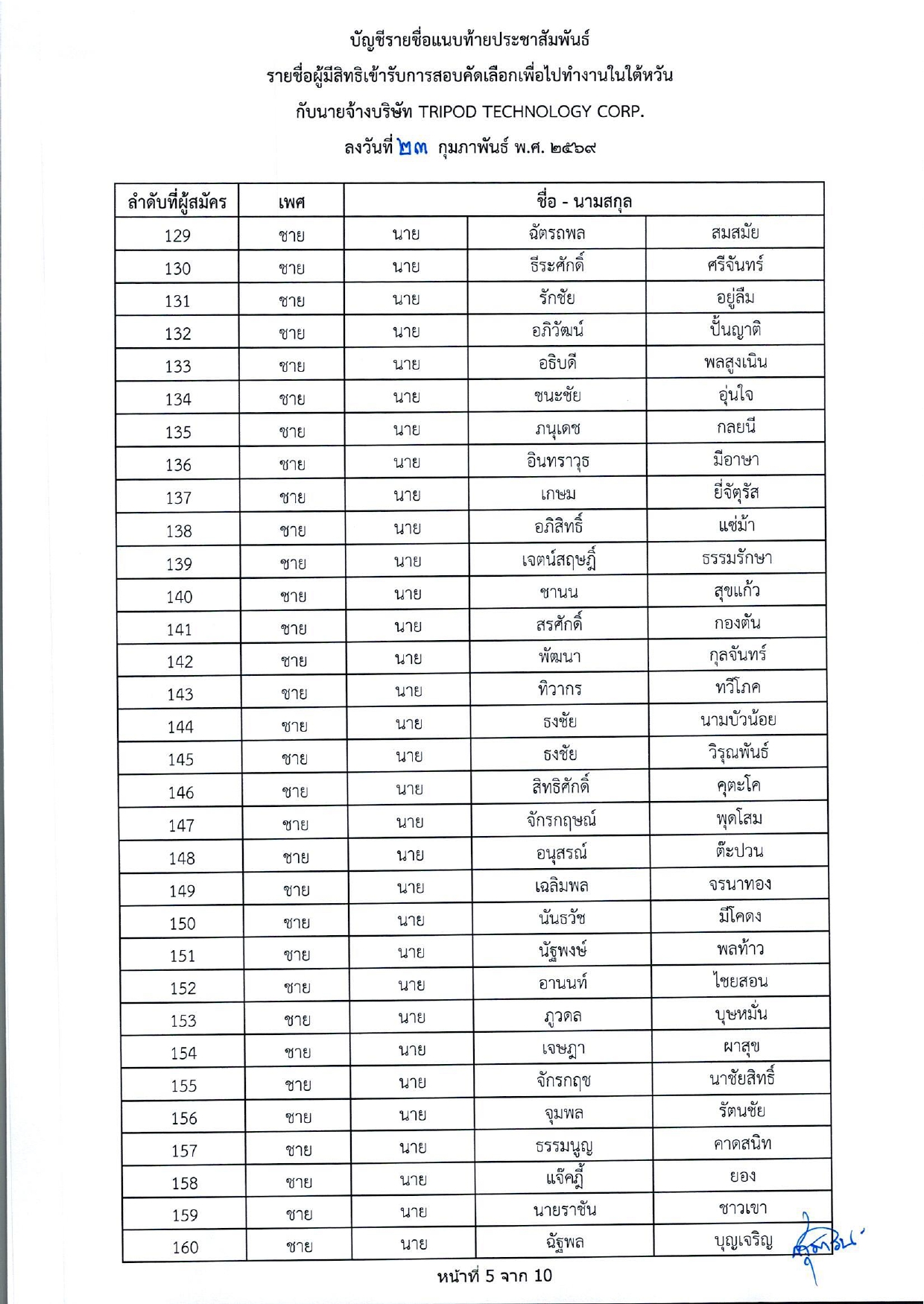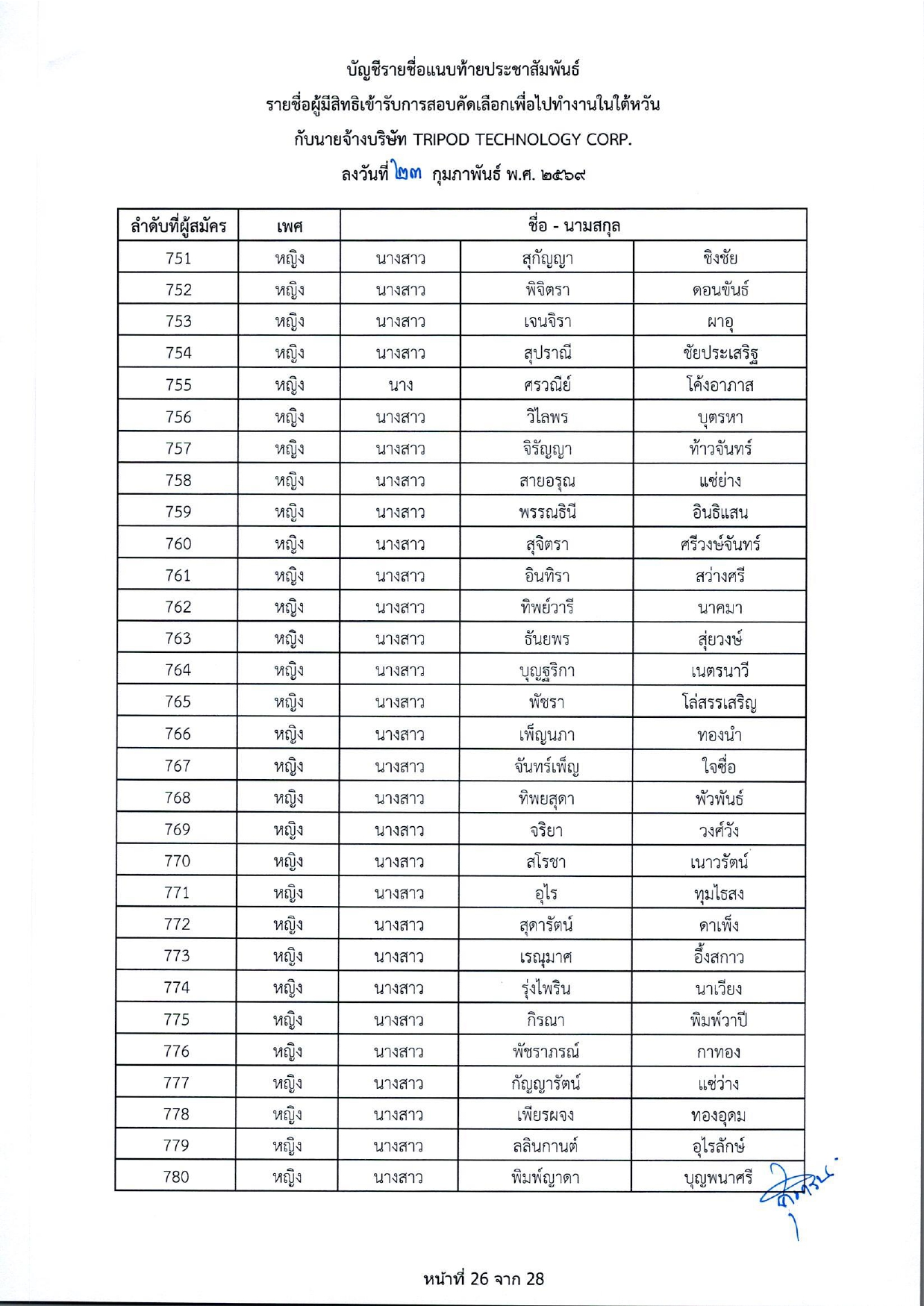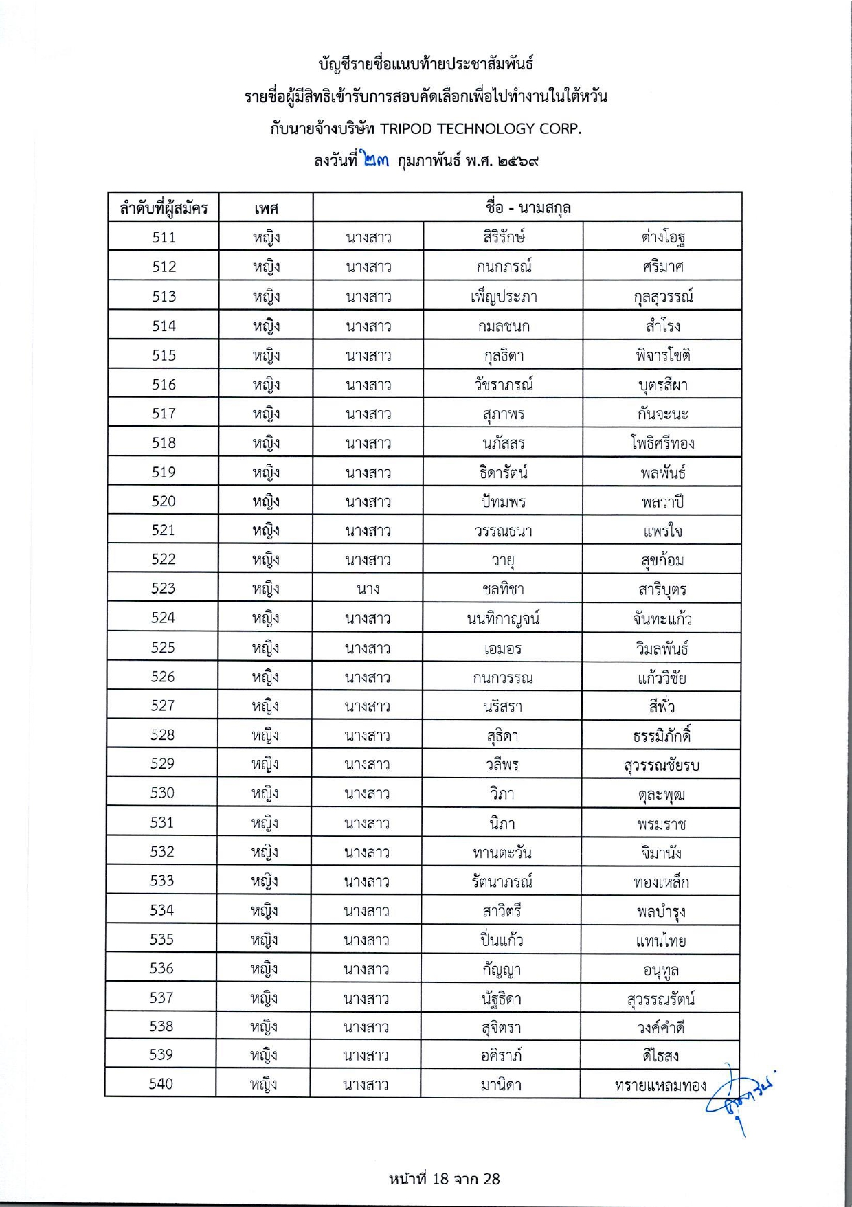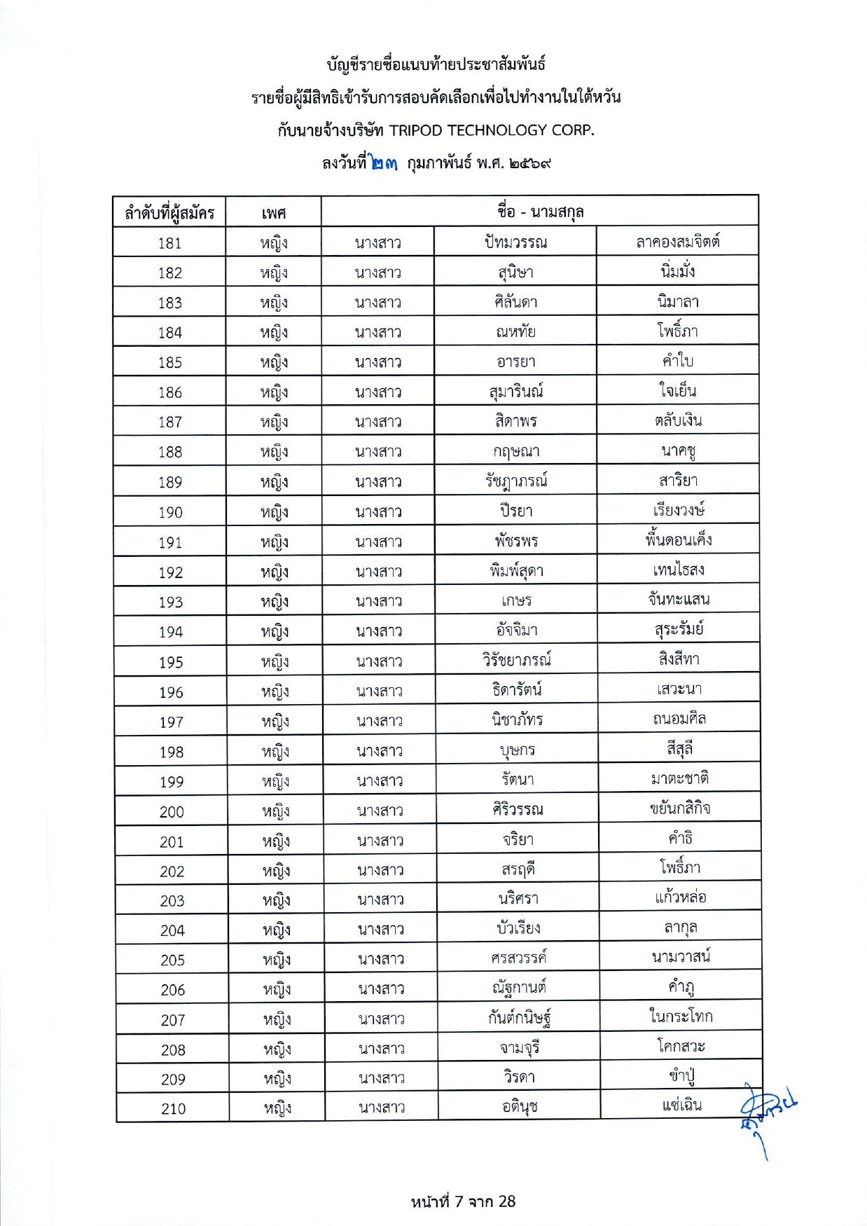รายชื่อผู้มีสิทธิเข้ารับการกอบคัดเลือกเพื่อไปทำงานในไต้หวัน กับนายจ้างบริษัท TRIPOD TECHNOLOGY CORP.