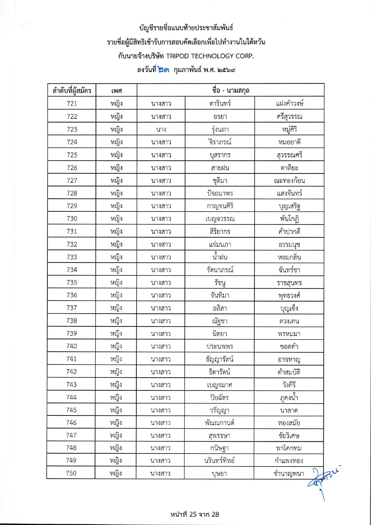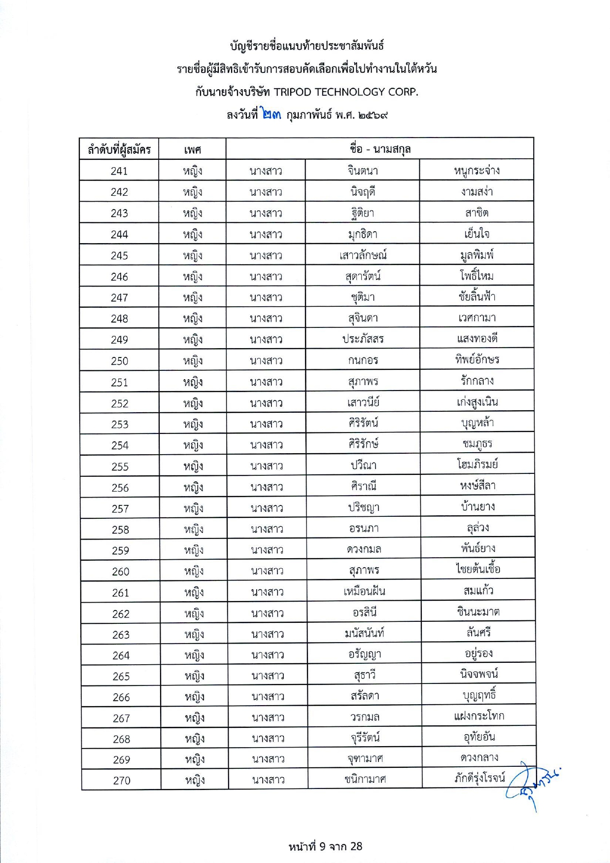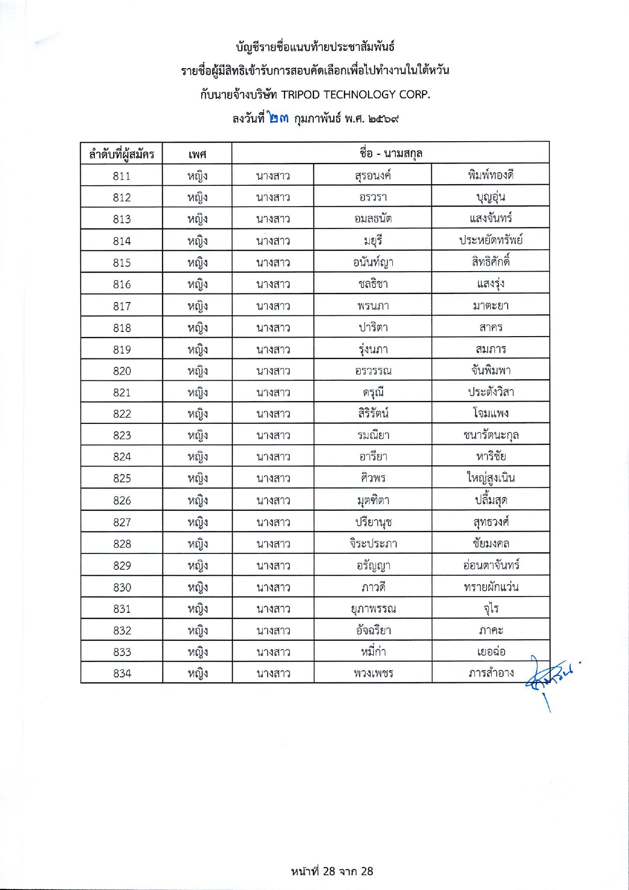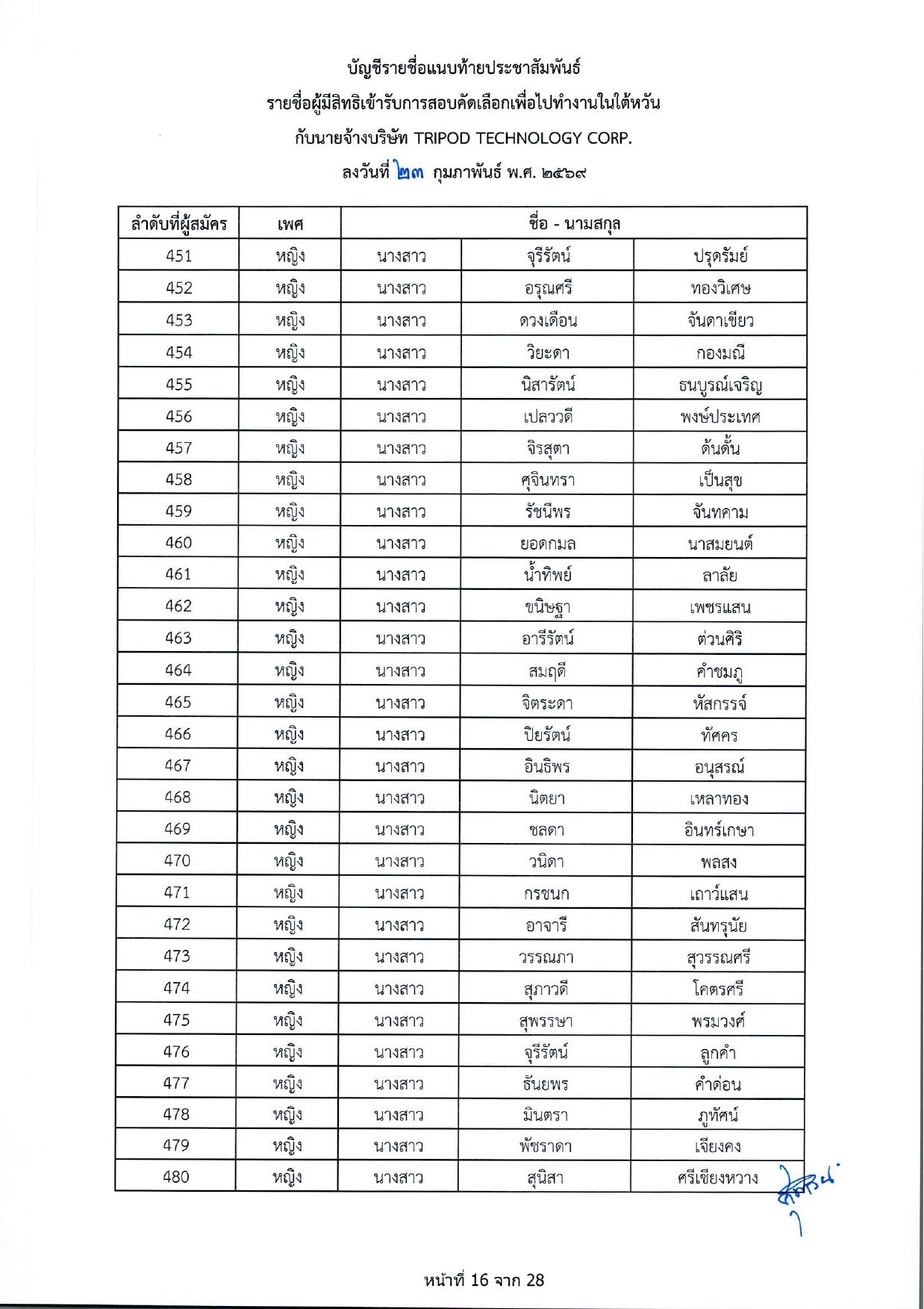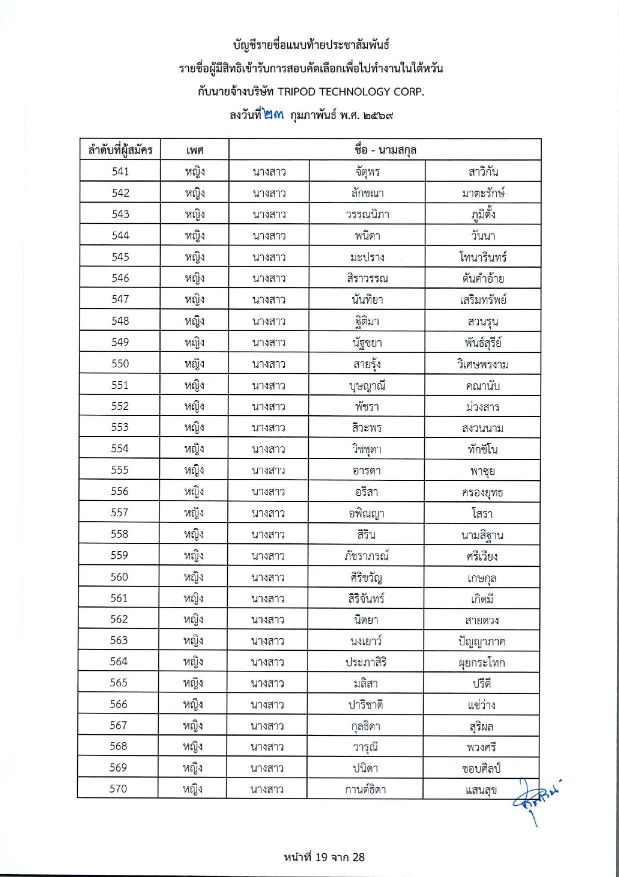 รายชื่อผู้มีสิทธิเข้ารับการกอบคัดเลือกเพื่อไปทำงานในไต้หวัน กับนายจ้างบริษัท TRIPOD TECHNOLOGY CORP.