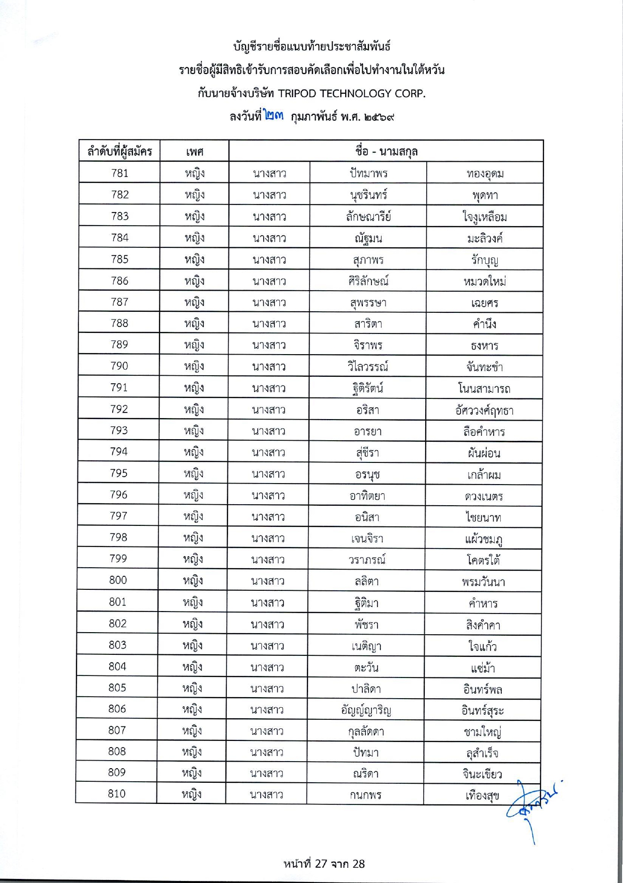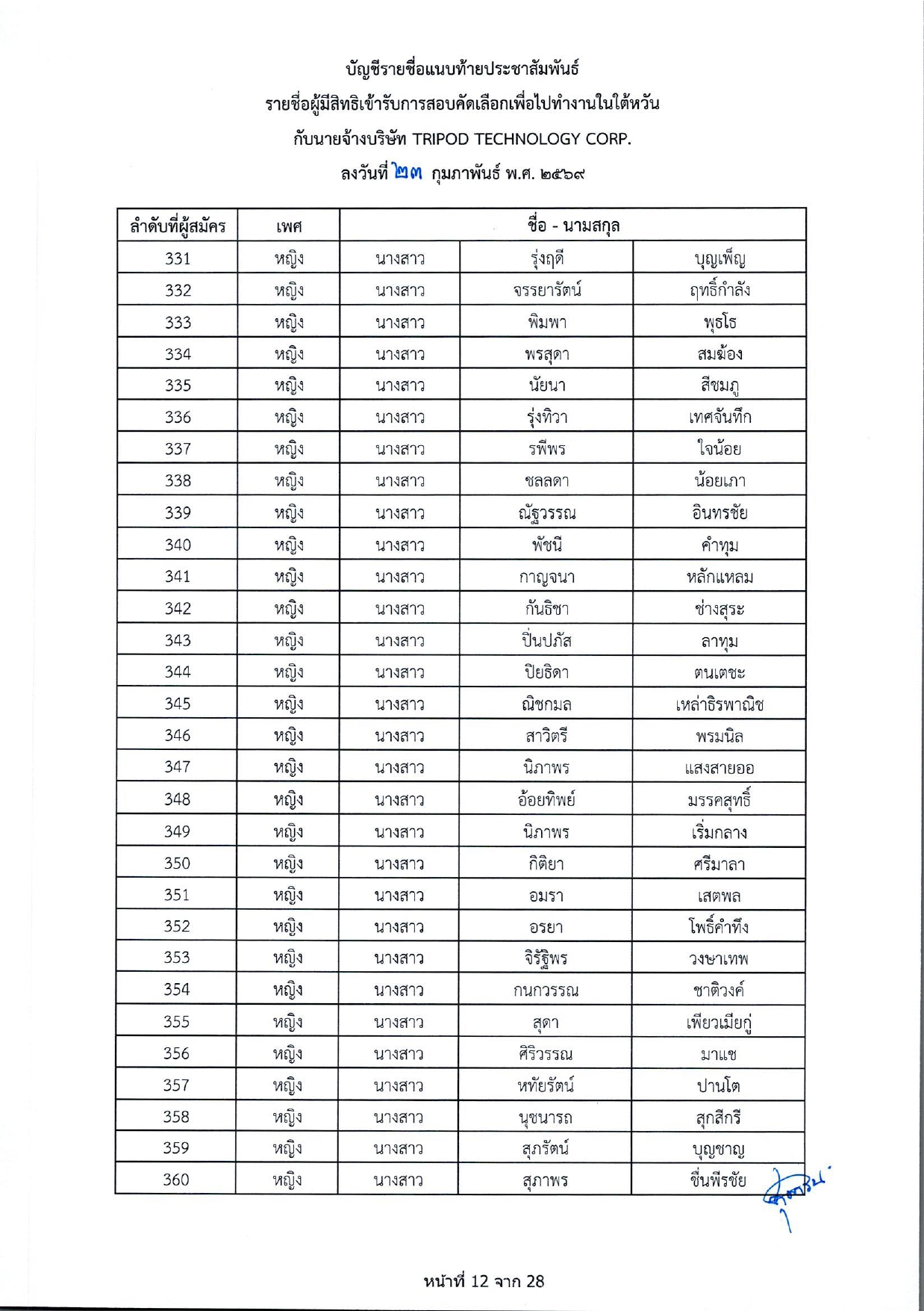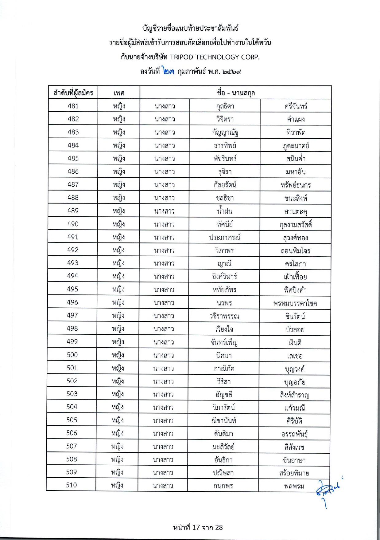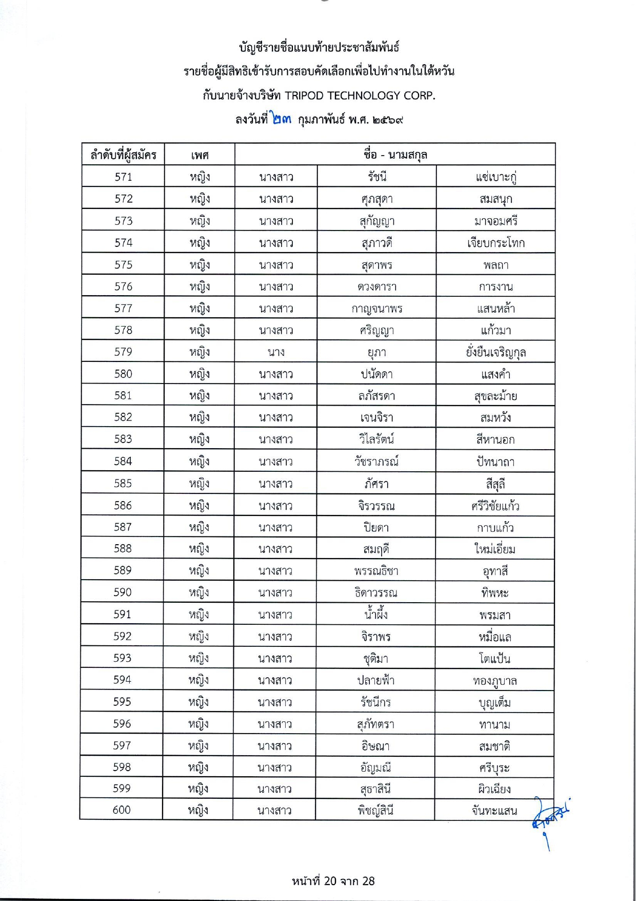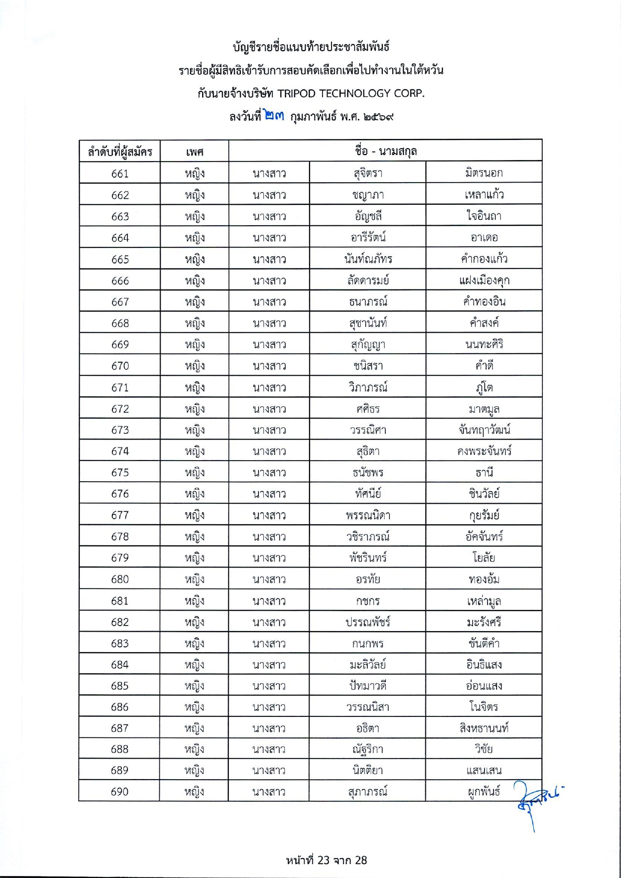 รายชื่อผู้มีสิทธิเข้ารับการกอบคัดเลือกเพื่อไปทำงานในไต้หวัน กับนายจ้างบริษัท TRIPOD TECHNOLOGY CORP.