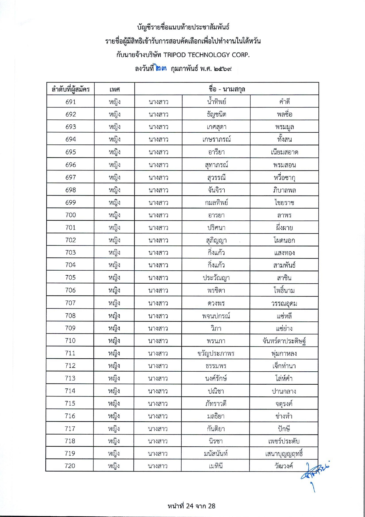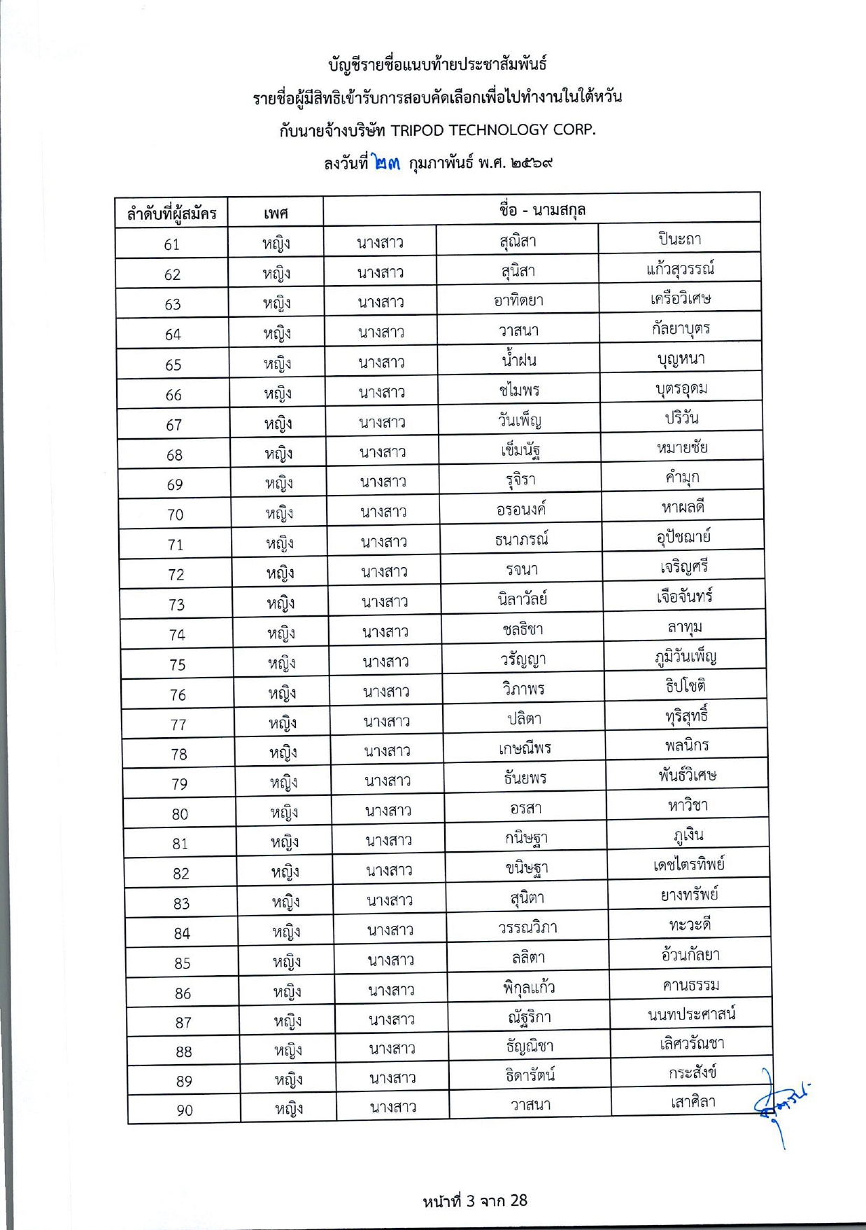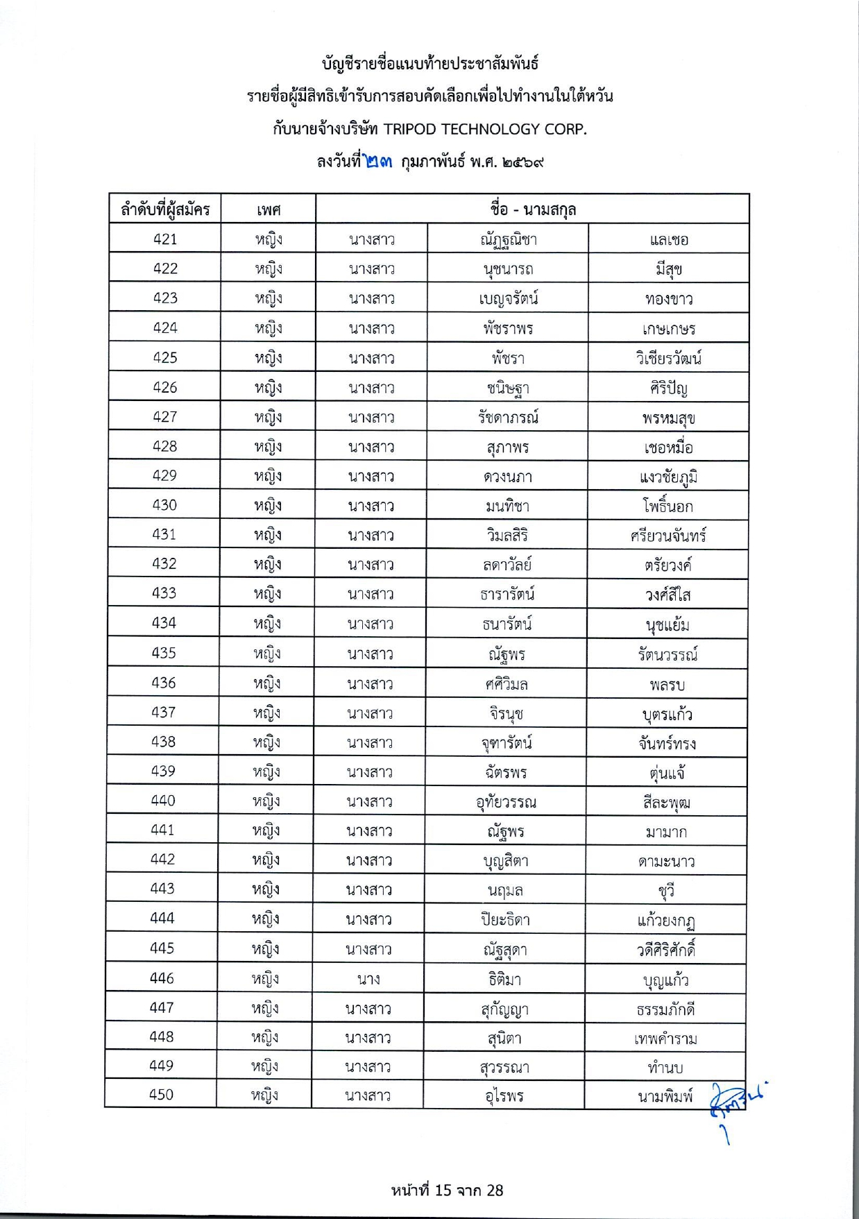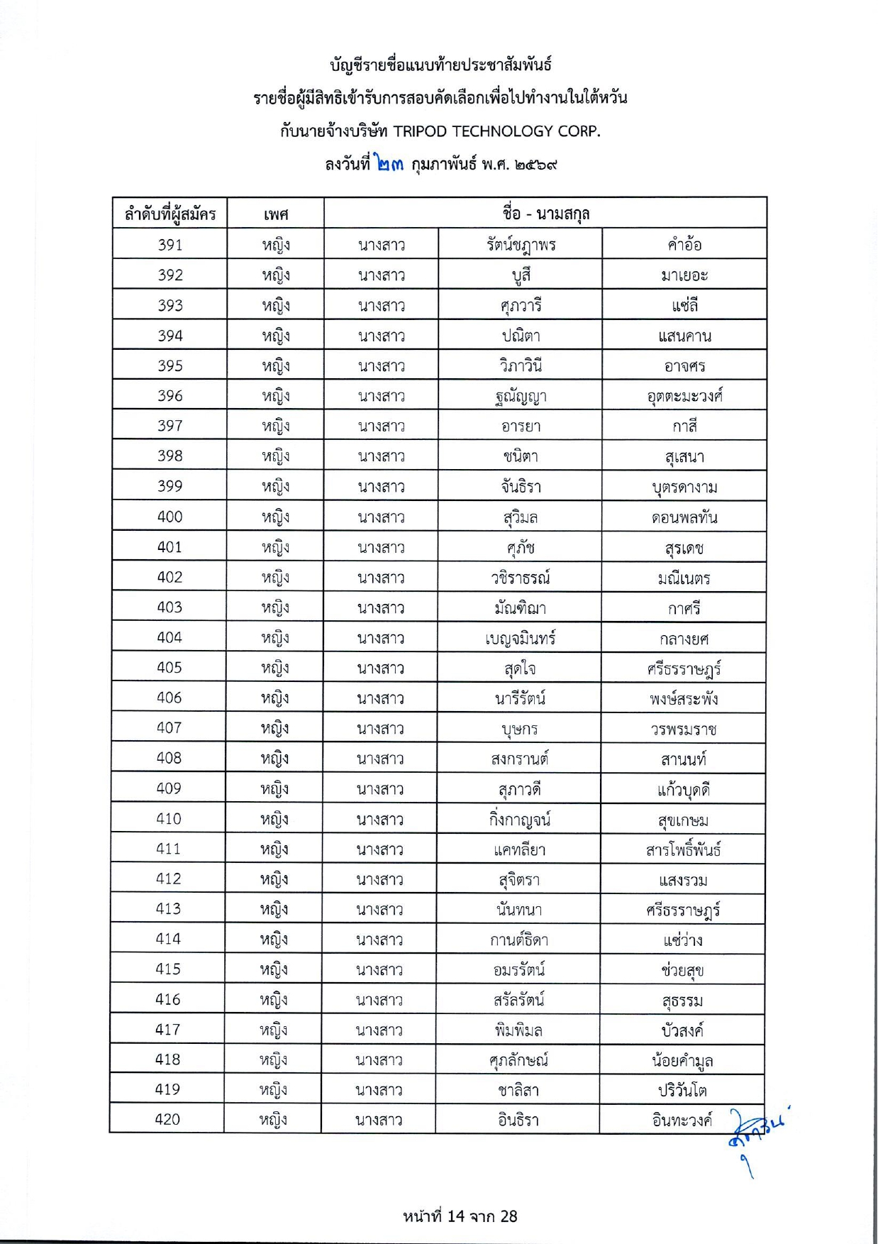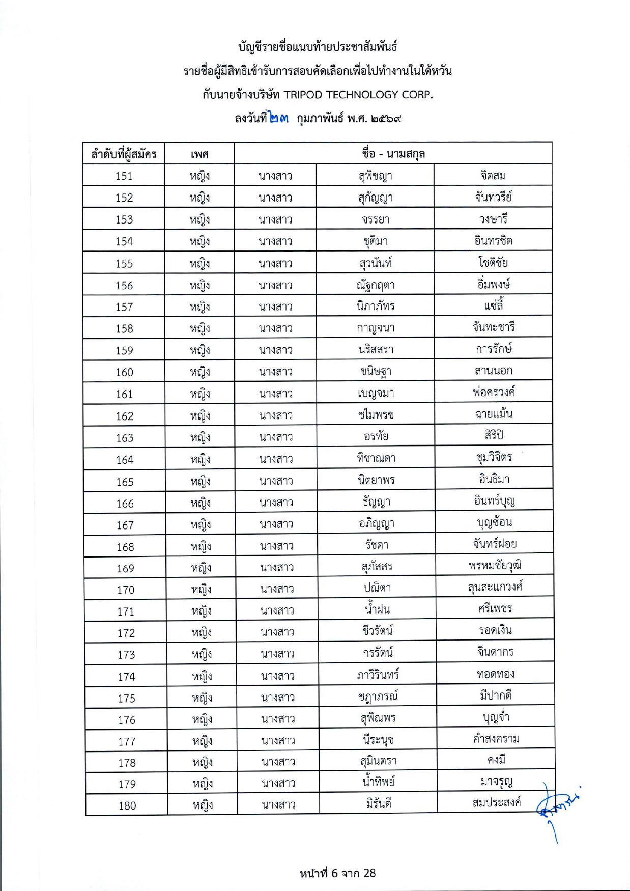 รายชื่อผู้มีสิทธิเข้ารับการกอบคัดเลือกเพื่อไปทำงานในไต้หวัน กับนายจ้างบริษัท TRIPOD TECHNOLOGY CORP.