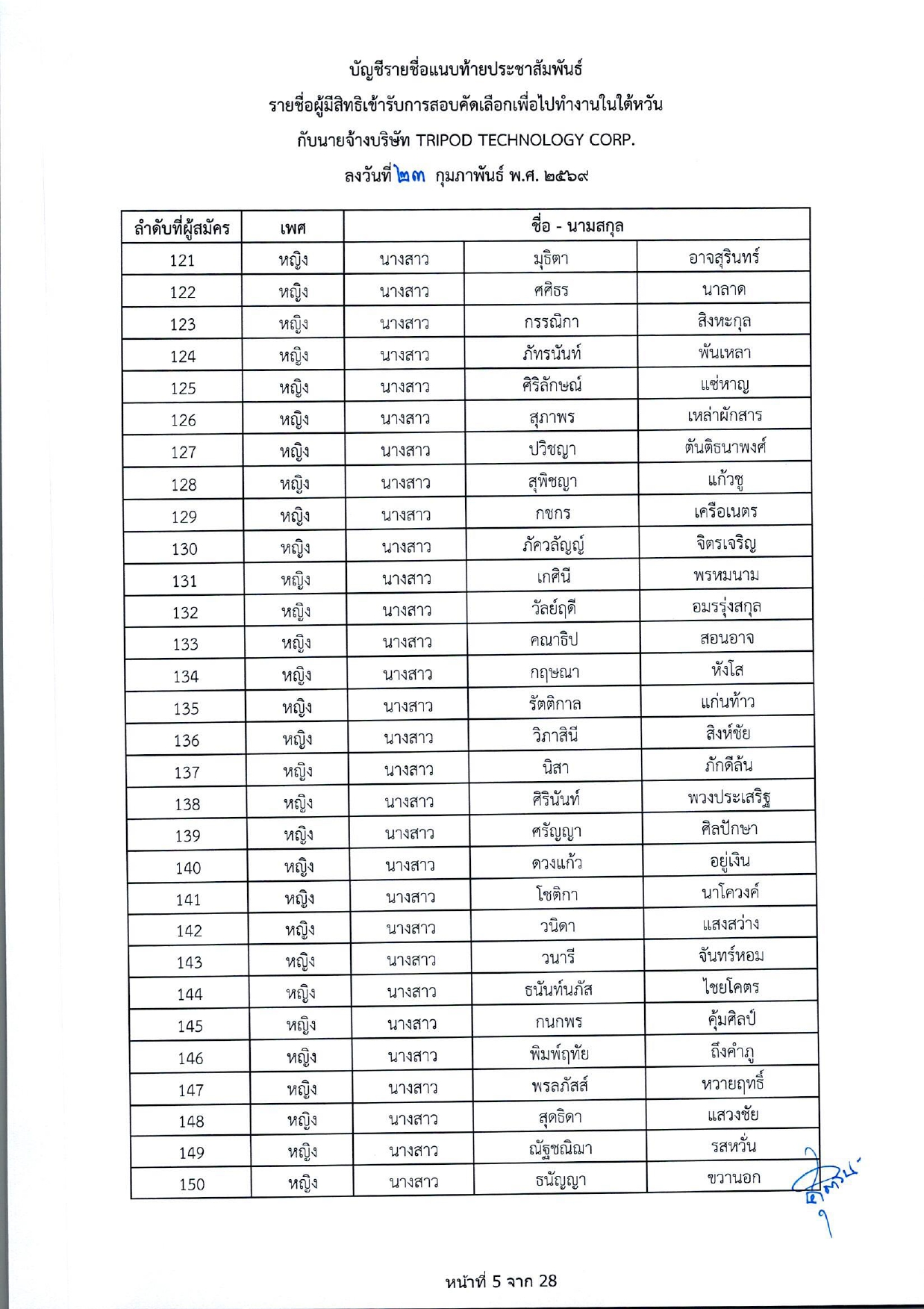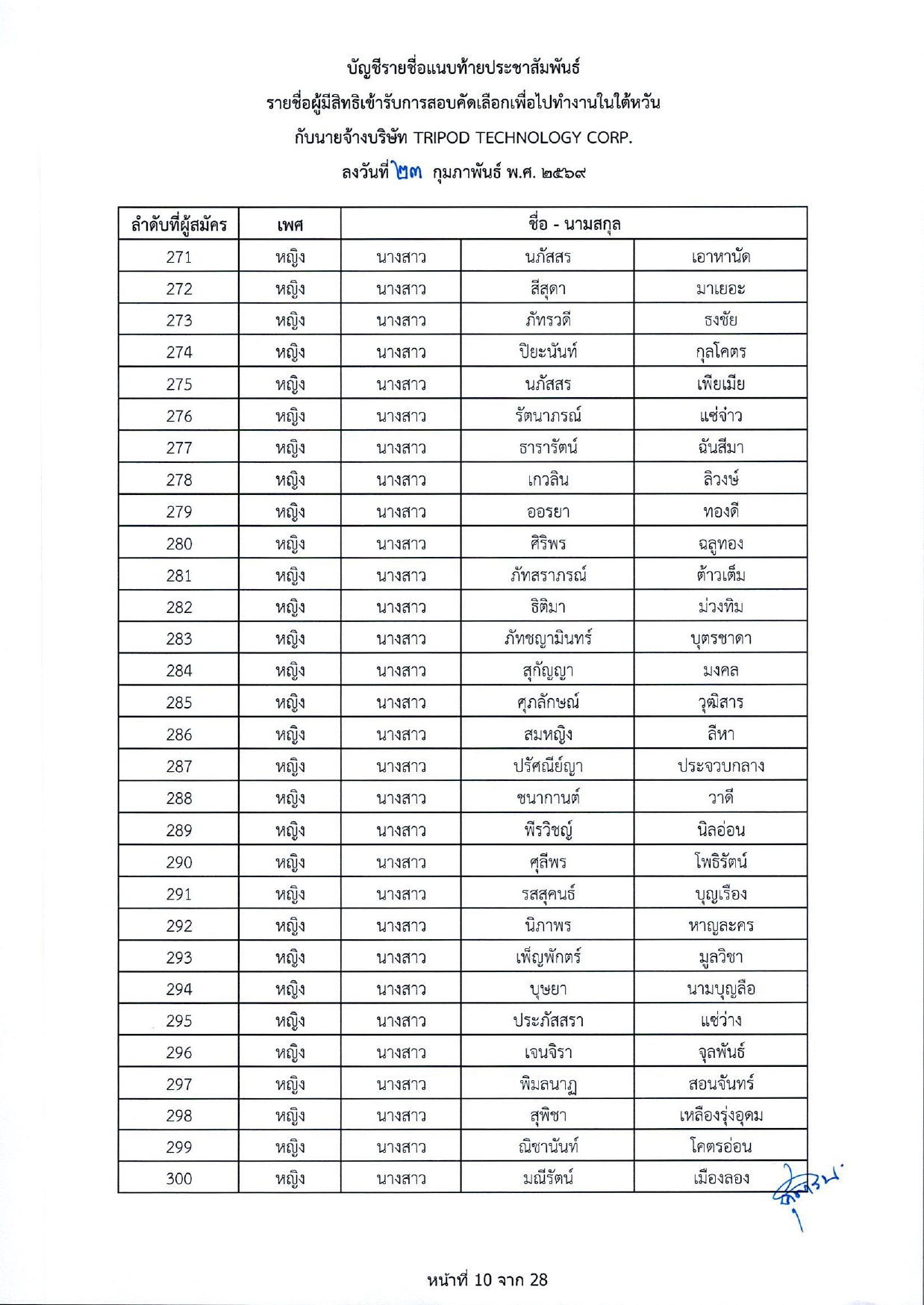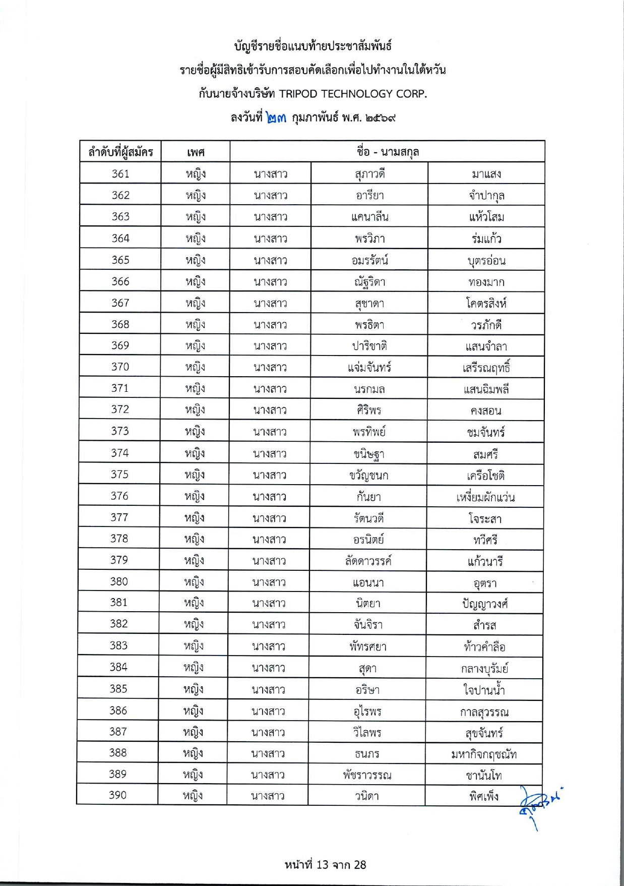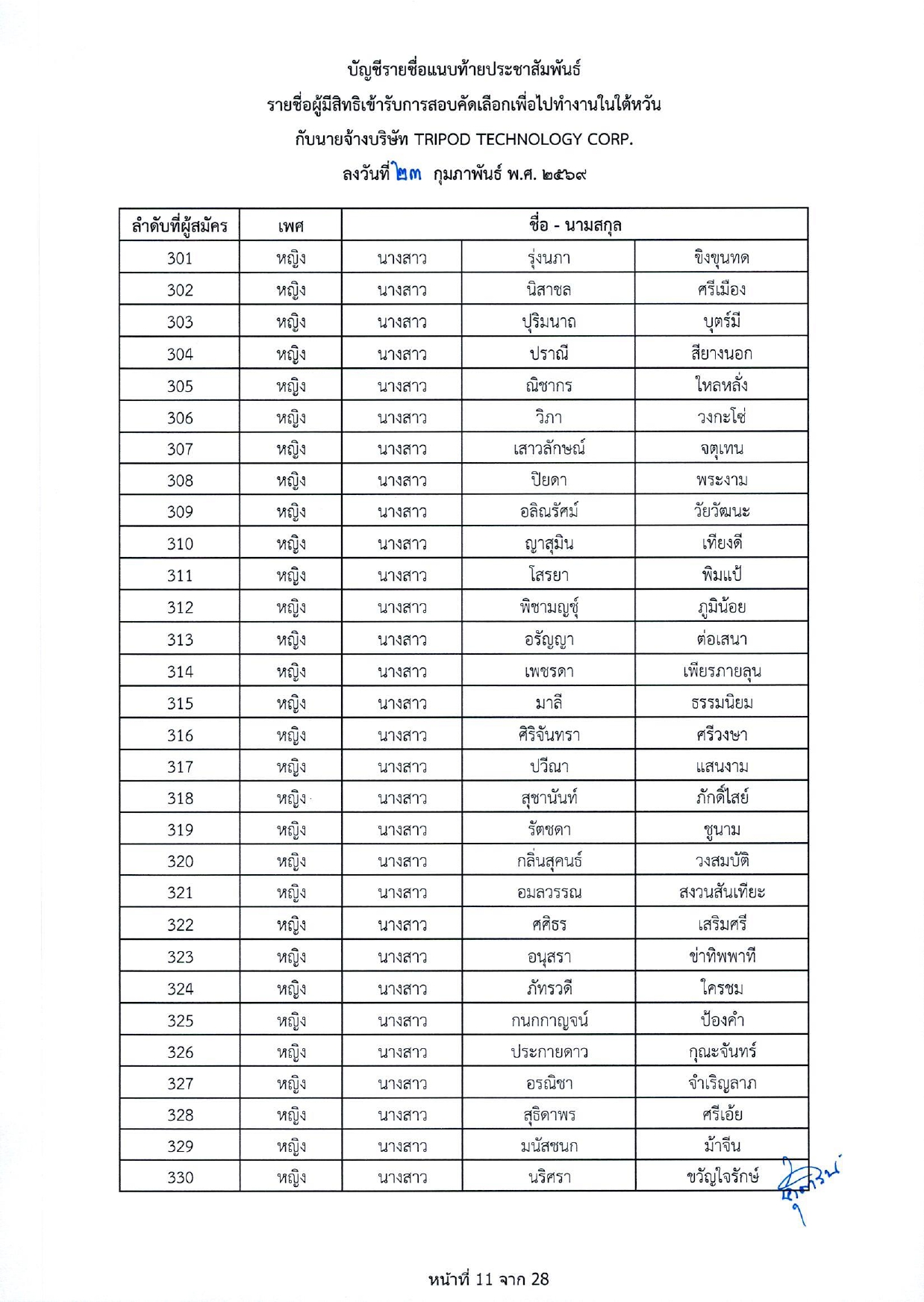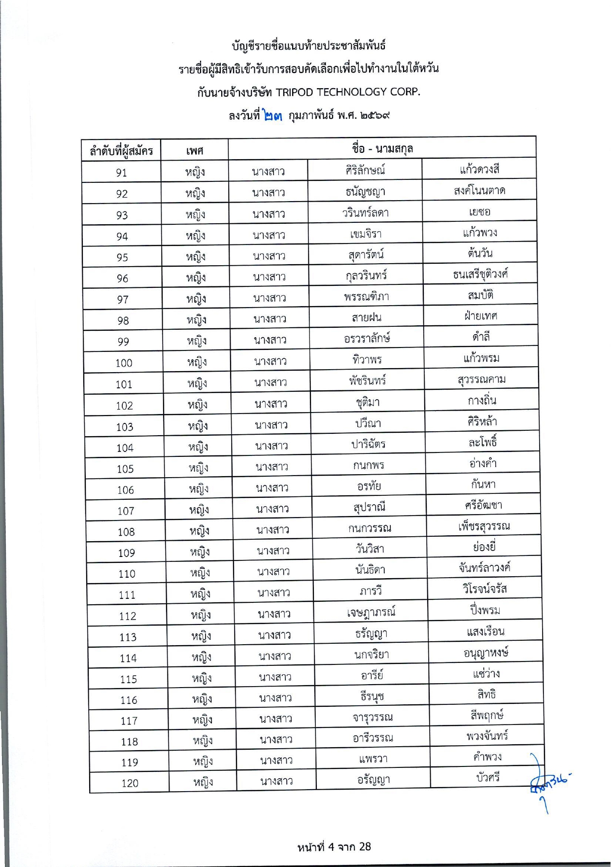 รายชื่อผู้มีสิทธิเข้ารับการกอบคัดเลือกเพื่อไปทำงานในไต้หวัน กับนายจ้างบริษัท TRIPOD TECHNOLOGY CORP.