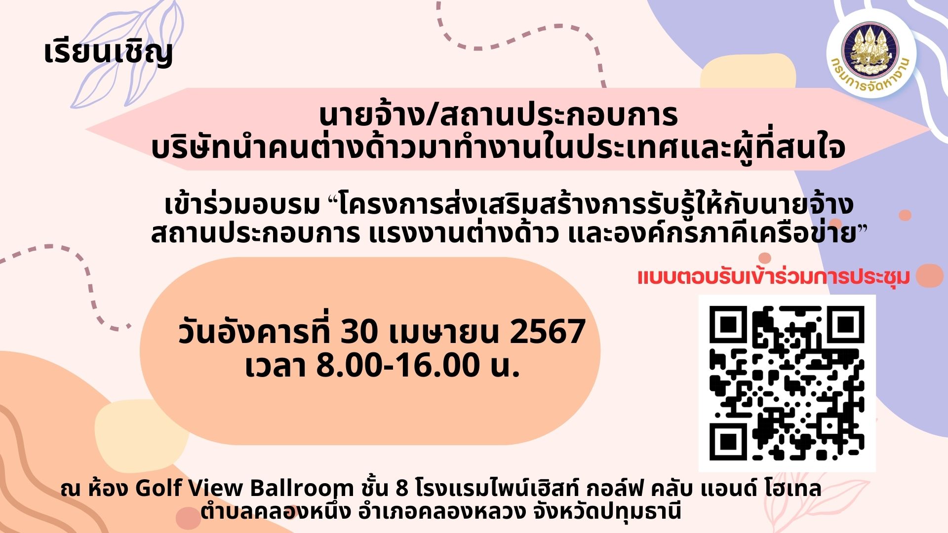 โทรศัพท์ : งานต่างด้าว 025670630 งานว่างงาน 025674107,งานต่างประเทศ 025670632 งานบริหาร 025670633