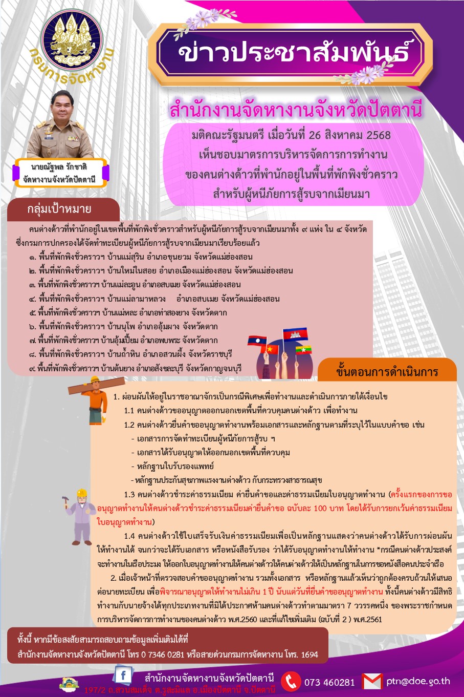 มติคณะรัฐมนตรี เมื่อวันที่ 26 สิงหาคม 2568 เห็นชอบมาตรการบริหารจัดการการทำงานของคนต่างด้าวที่พำนักอยู่ในพื้นที่พักพิงชั่วคราว สำหรับผู้หนีภัยการสู้รบจากเมียนมา