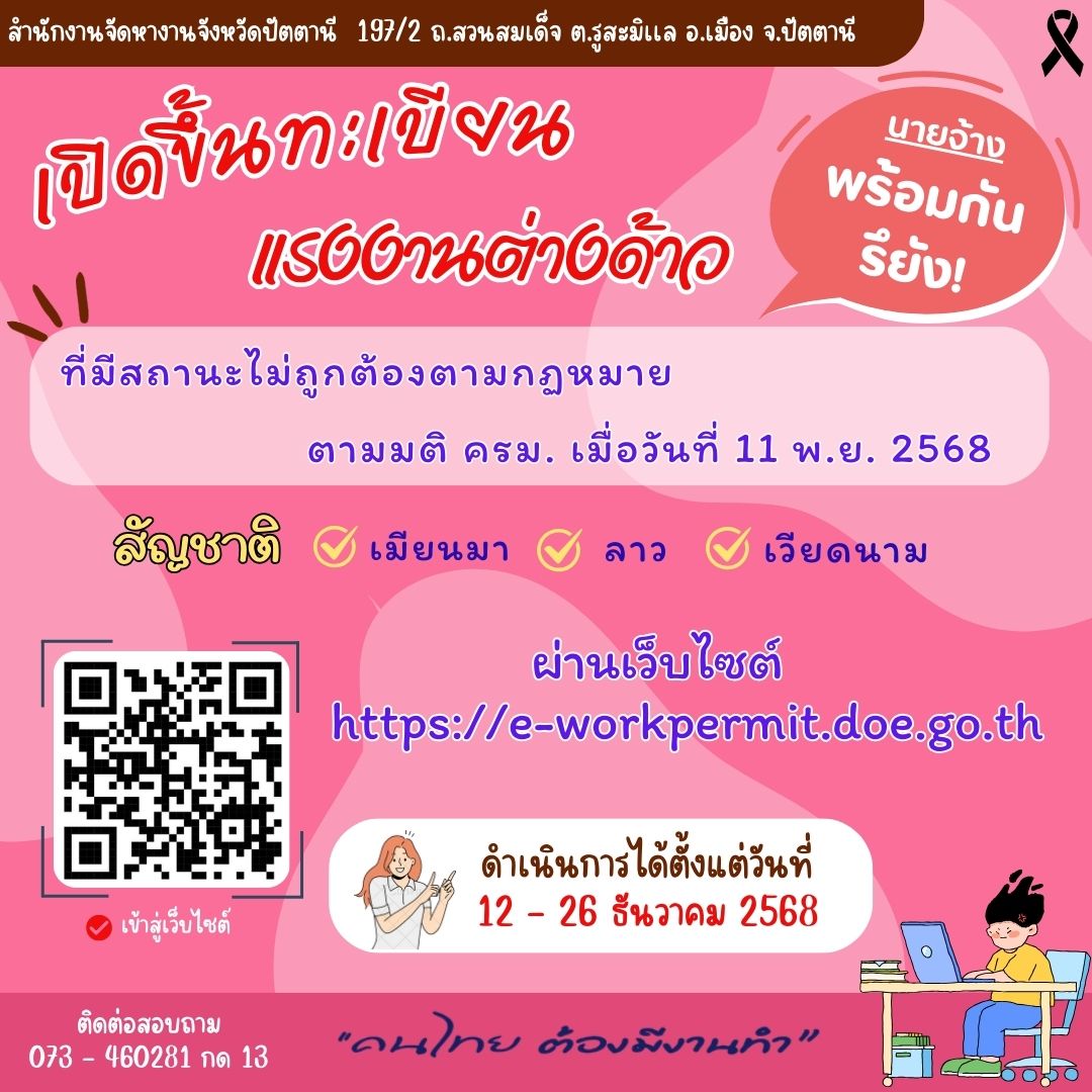 มติคณะรัฐมนตรีเมื่อวันที่ 11 พฤศจิกายน 2568 การขออนุญาตทำงานแทนคนต่างด้าวที่มีสถานะไม่ถูกต้องตามกฎหมาย สำหรับต่างด้าว 3 สัญชาติ (ลาว เมียนมา และเวียดนาม) ตั้งแต่วันที่ 12 - 26 ธันวาคม 2568 ทางเว็บไซต์ http://eworkpermit.doe.go.th (ตามรายละเอียดดังภาพ)