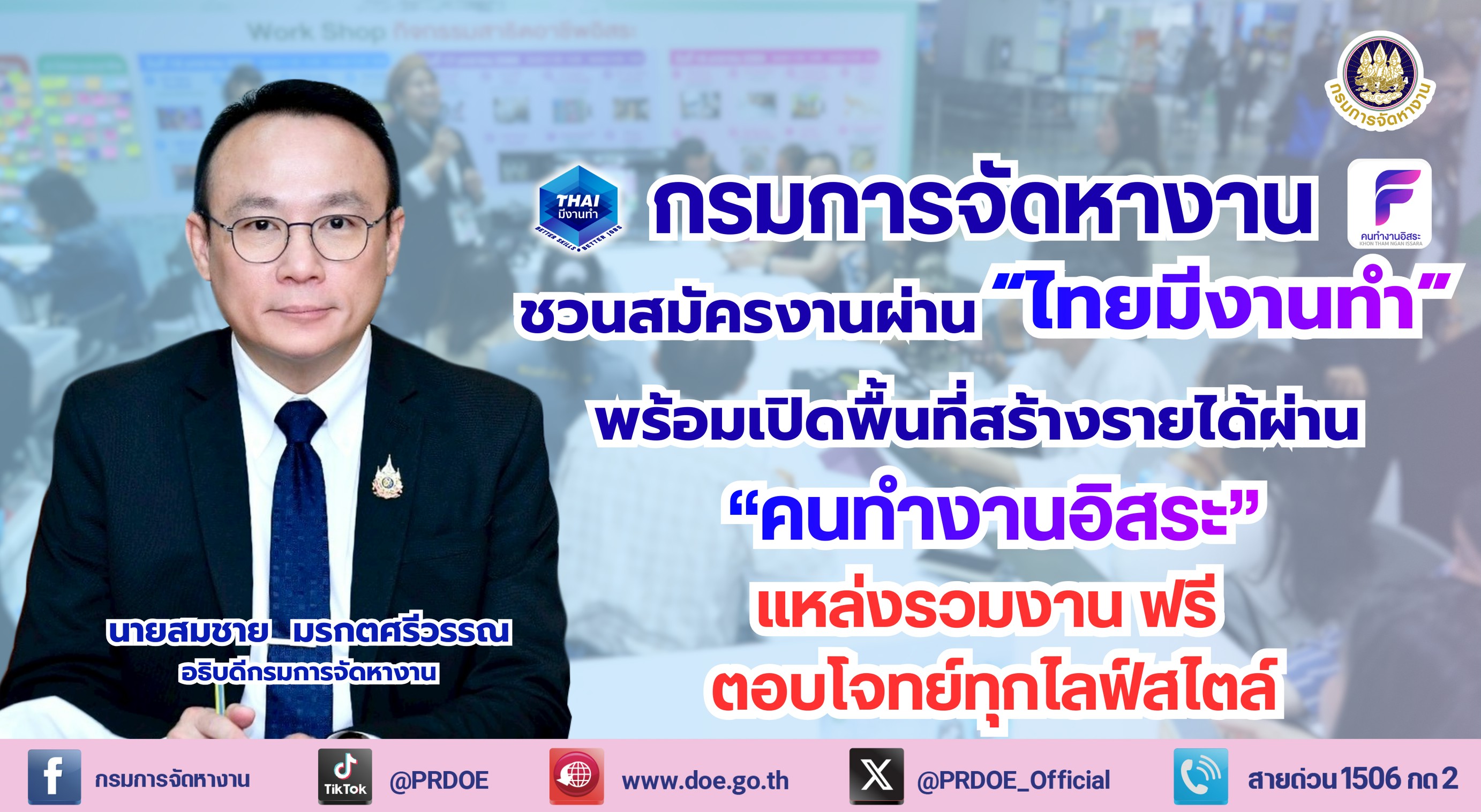 นายสมชาย กล่าวว่า สำหรับผู้ว่างงาน ผู้จบการศึกษาใหม่ ผู้สูงอายุ กลุ่มผู้เปราะบาง และทุกคนที่ต้องการ มีงานทำ สามารถใช้บริการหางาน ผ่านระบบออนไลน์ บนแพลตฟอร์ม “ไทยมีงานทำ” ที่เว็บไซต์ “ไทยมีงานทำ.doe.go.th” หรือแอปพลิเคชัน “ไทยมีงานทำ” ค้นหาข้อมูลตำแหน่งงานที่เหมาะสมกับตัวเองมากที่สุด โดย Matching ตำแหน่งงานตามพื้นที่ ภูมิลำเนา รวมถึงจับคู่ตำแหน่งงานจากความรู้ ความสามารถ และทักษะที่มีอยู่ได้ทุกที่ ทุกเวลา โดยไม่มีค่าบริการและสำหรับผู้ที่สนใจประกอบอาชีพอิสระหรือมองหาอาชีพเสริมสามารถฝากผลงาน แชร์ความถนัดของตนเองเพื่อหารายได้เสริม ผ่านแพลตฟอร์ม “คนทำงานอิสระ” ที่เว็บไซต์ “คนทำงานอิสระ.doe.go.th” หรือแอปพลิเคชัน “คนทำงานอิสระ” ซึ่งเป็นช่องทางเชื่อมต่อระหว่างผู้ประกอบอาชีพอิสระกับผู้ว่าจ้าง ช่วยเพิ่มโอกาสในการสร้างรายได้และขยายช่องทางการทำงานได้มากยิ่งขึ้น