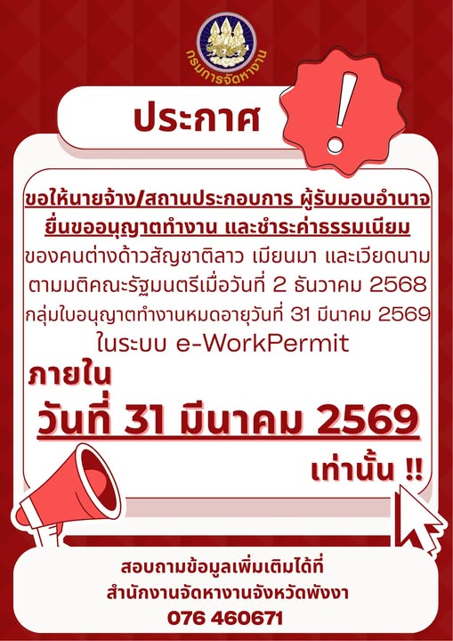 ประกาศ ขอให้นายจ้าง/สถานประกอบการ ผู้รับมอบอำนาจ ยื่นขออนุญาตทำงาน และชำระค่าธรรมเนียมของคนต่างด้าวสัญชาติลาว เมียนมา และเวียดนาม ตามมติคณะรัฐมนตรีเมื่อวันที่ 2 ธันวาคม 2568 กลุ่มใบอนุญาตทำงานหมดอายุวันที่ 31 มีนาคม 2569 ในระบu e-WorkPermit ภายในวันที่ 31 มีนาคม 2569 เท่านั้น !!