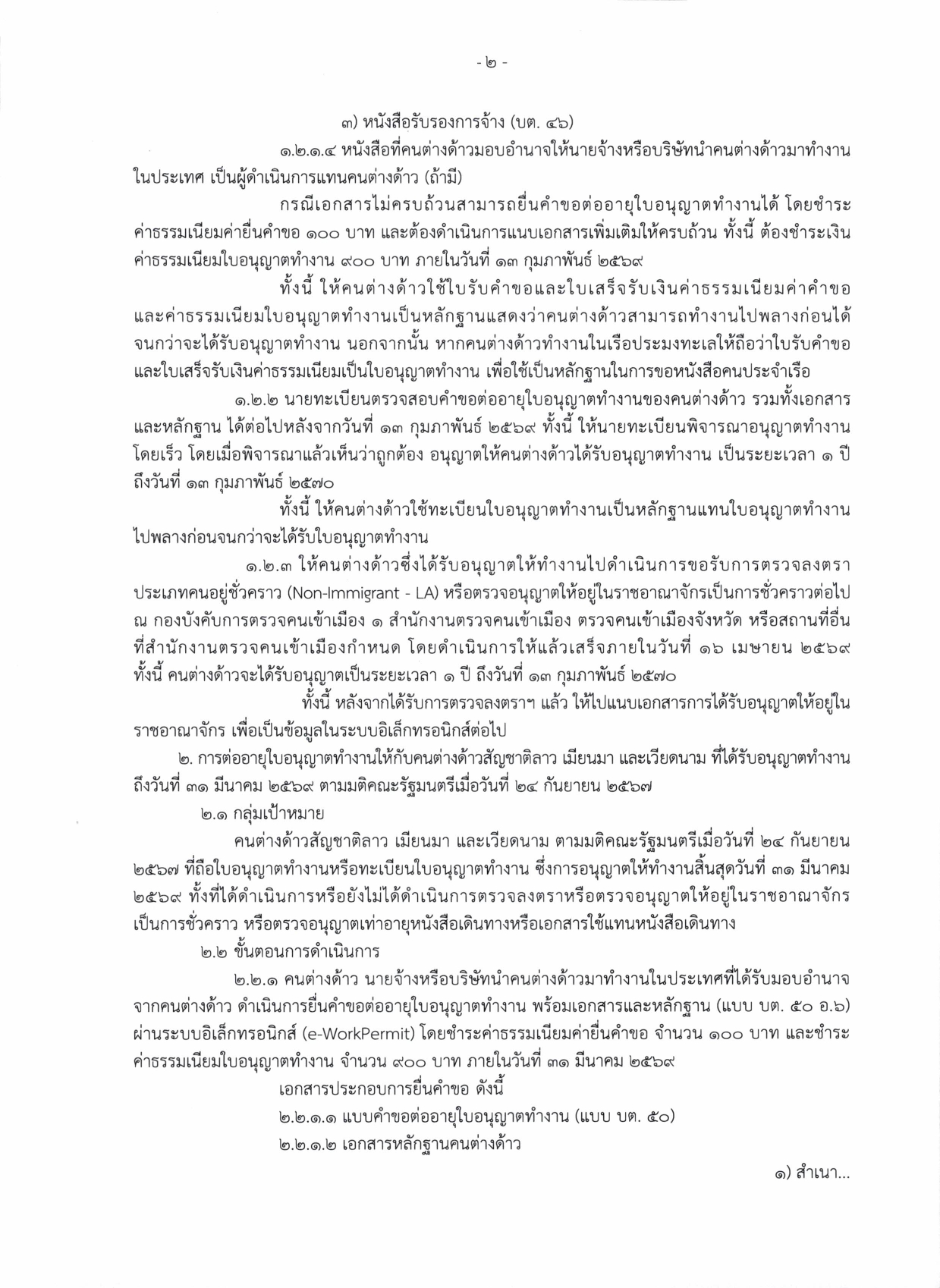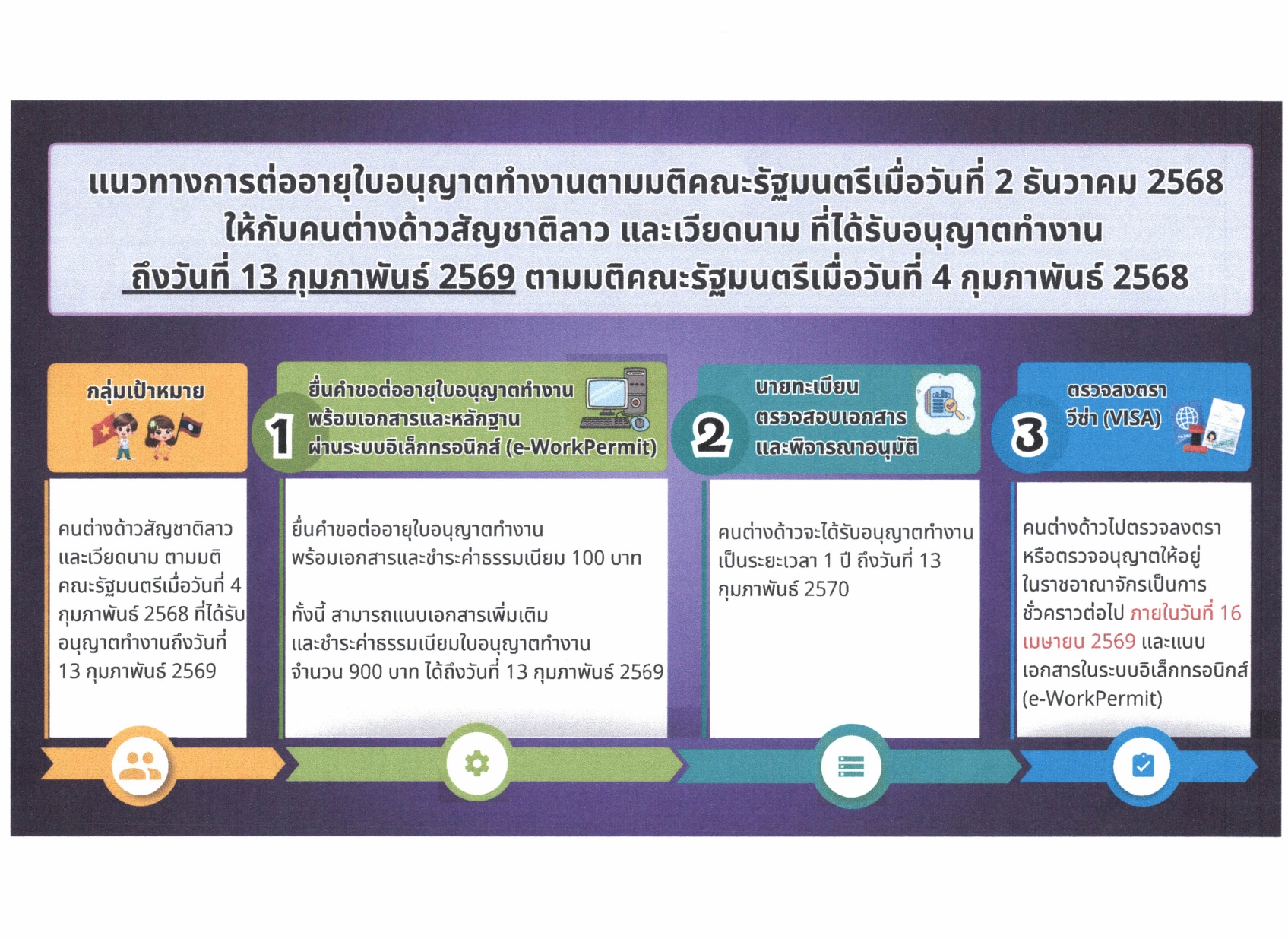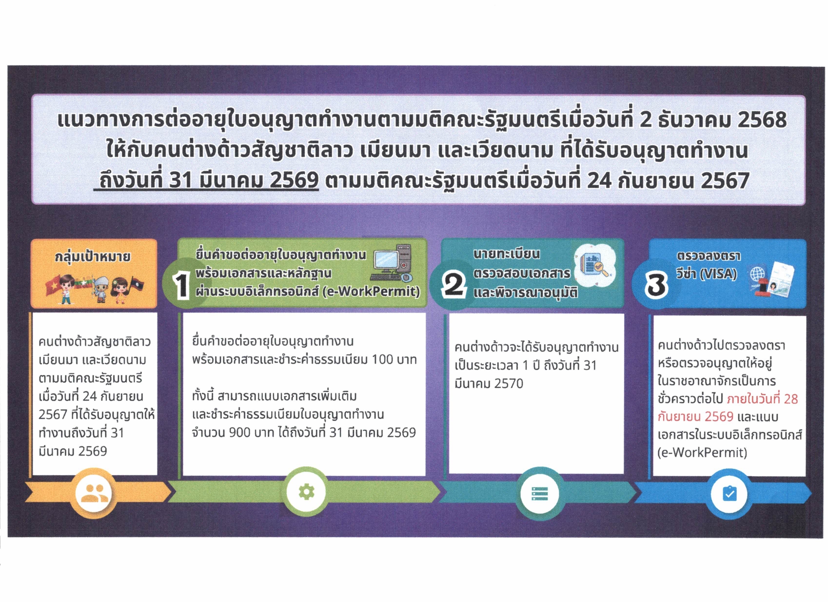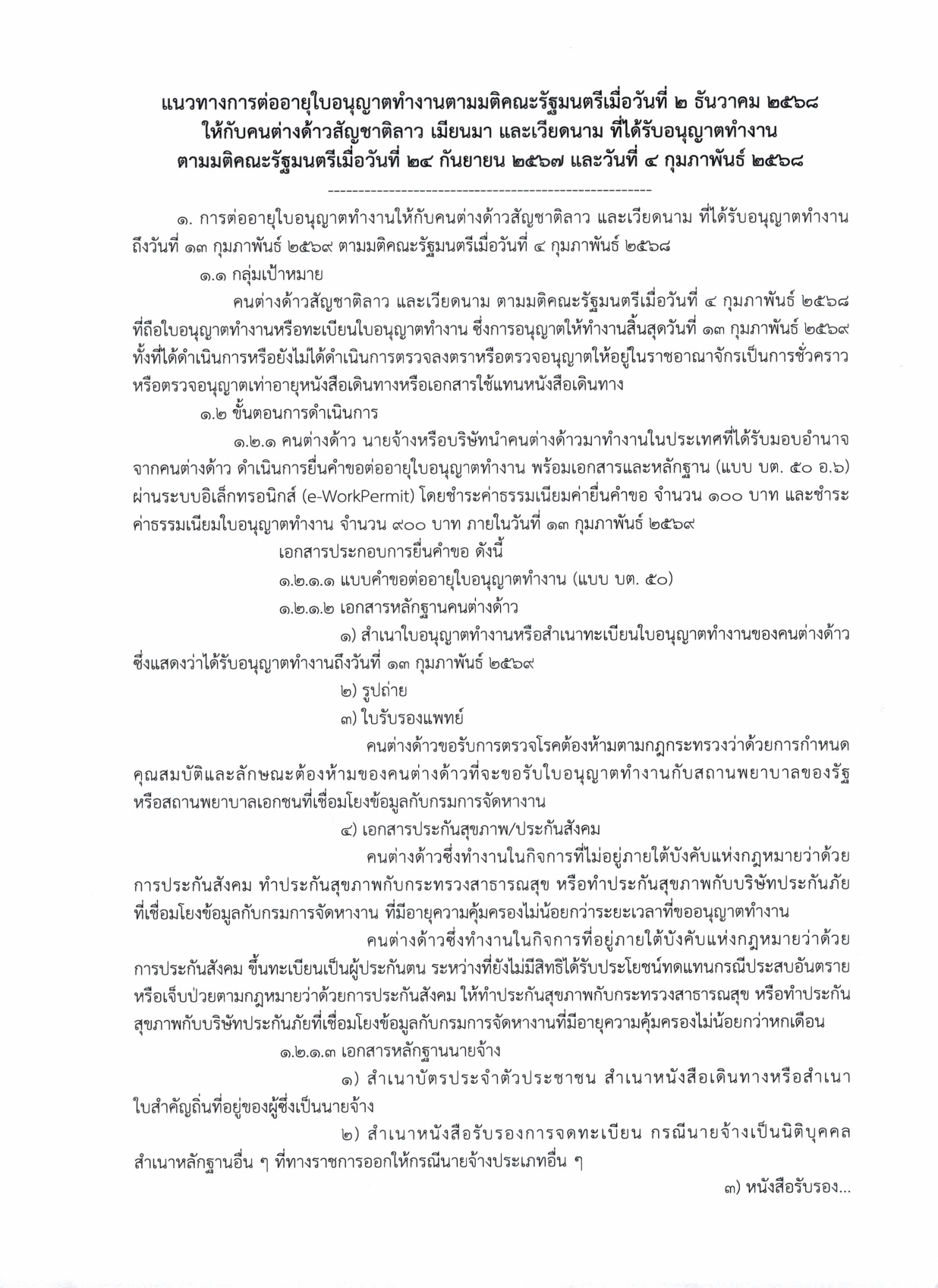 ประชาสัมพันธ์แนวทางการต่ออายุใบอนุญาตทำงานตามมติคณะรัฐมนตรีเมื่อวันที่ ๒ ธันวาคม ๒๕๖๘ ให้กับคนต่างด้าวสัญชาติลาว เมียนมา และเวียดนาม ที่ได้รับอนุญาตทำงานตามมติคณะรัฐมตรีเมื่อวันที่ ๒๔ กันยายน ๒๕๖๗ และวันที่ ๔ กุมภาพันธ์ ๒๕๖๘