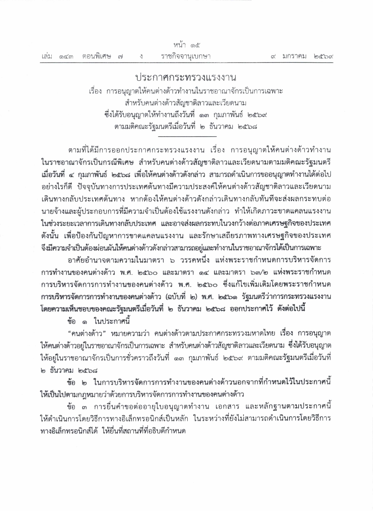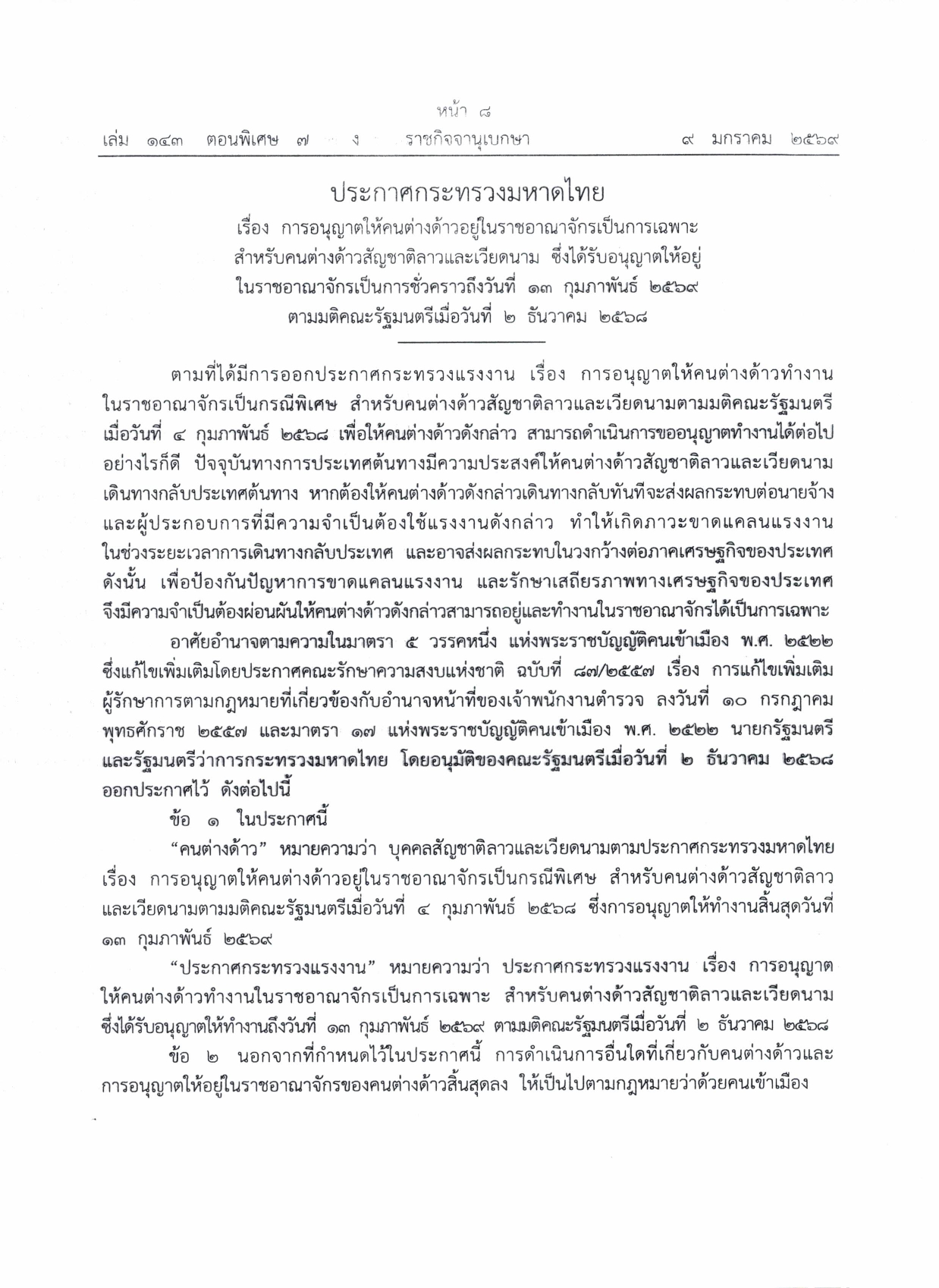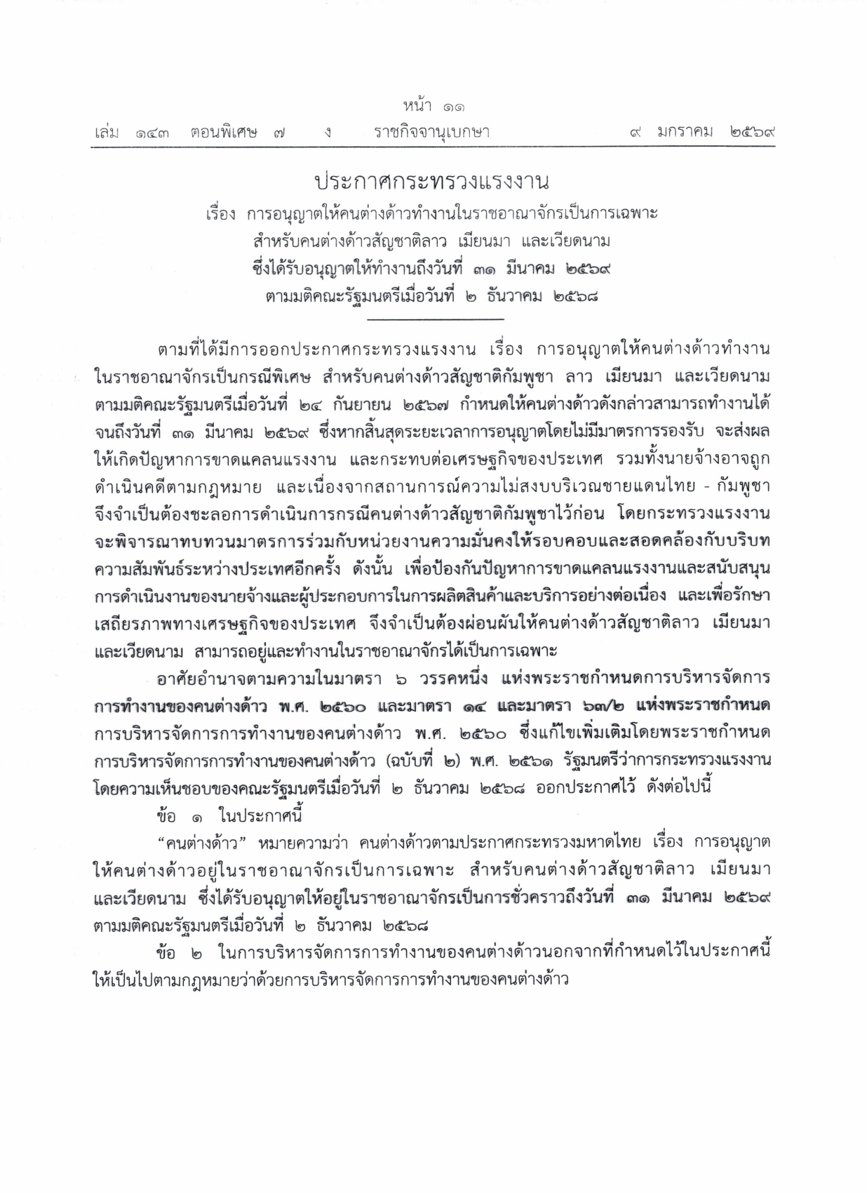 ประชาสัมพันธ์แนวทางการต่ออายุใบอนุญาตทำงานตามมติคณะรัฐมนตรีเมื่อวันที่ ๒ ธันวาคม ๒๕๖๘ ให้กับคนต่างด้าวสัญชาติลาว เมียนมา และเวียดนาม ที่ได้รับอนุญาตทำงานตามมติคณะรัฐมตรีเมื่อวันที่ ๒๔ กันยายน ๒๕๖๗ และวันที่ ๔ กุมภาพันธ์ ๒๕๖๘
