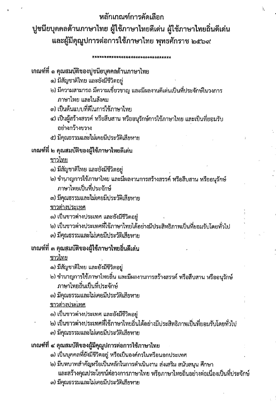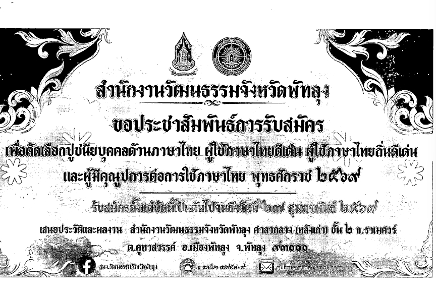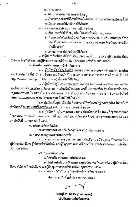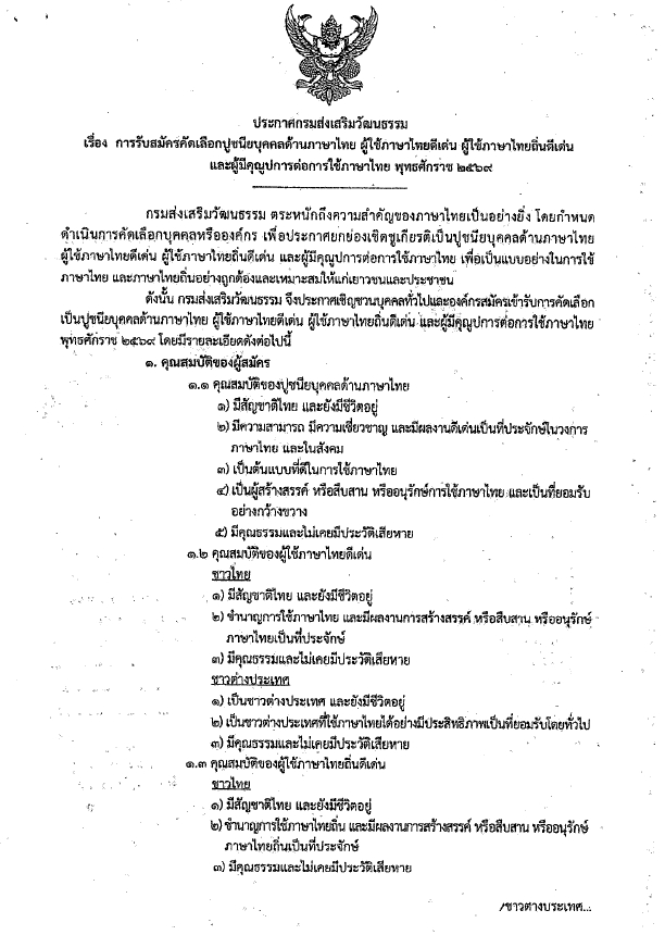 ประกาศกรมส่งเสริมวัฒนธรรม เรื่องการรับสมัครบุคคลด้านภาษาไทย ผู้ใช้ภาษาไทยดีเด่น ผู้ใ้ชภาษาถิ่นดีเด่นและผู้มีคุณูปการต่อการใช้ภาษาไทย พุทธศักราช 2569