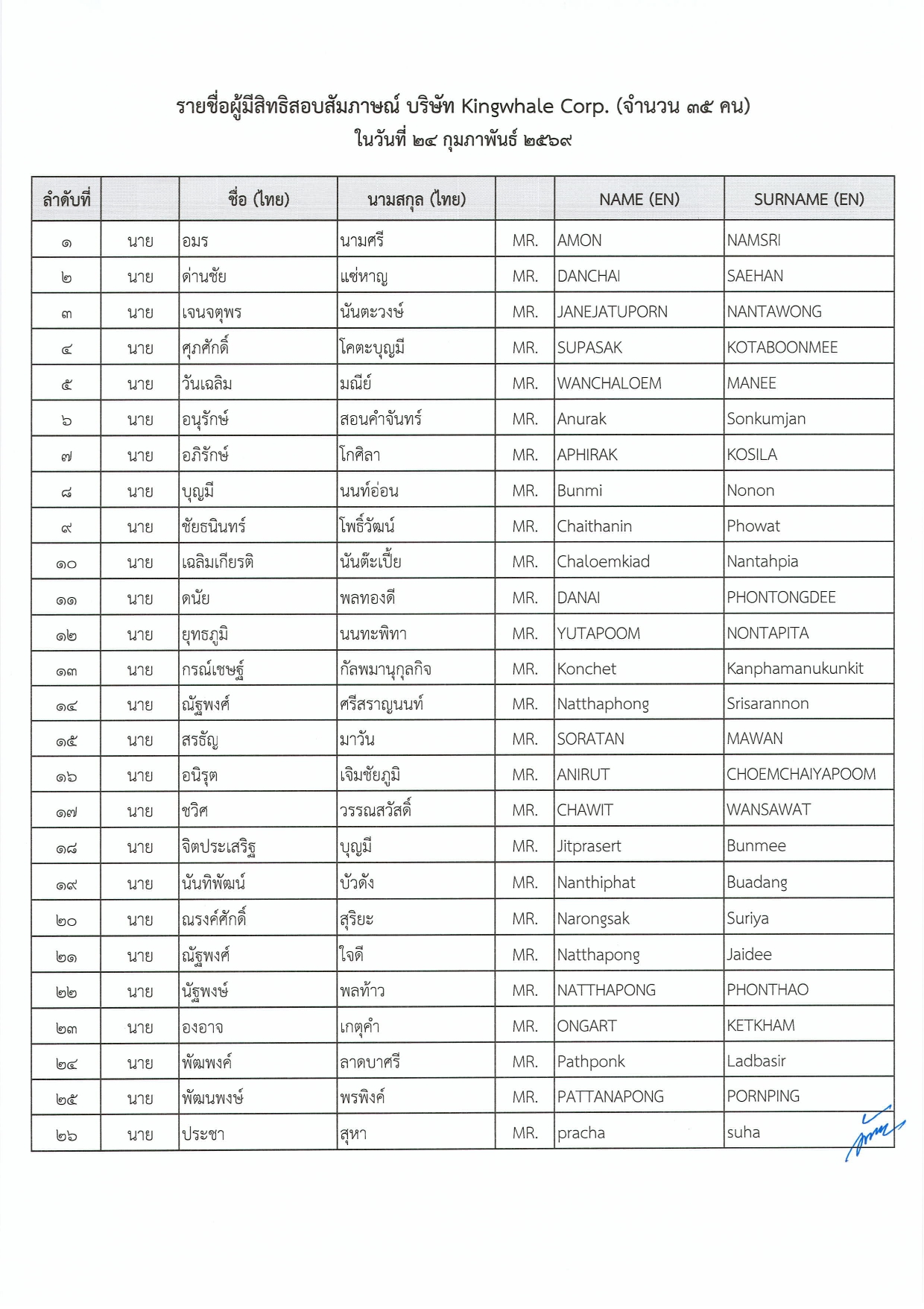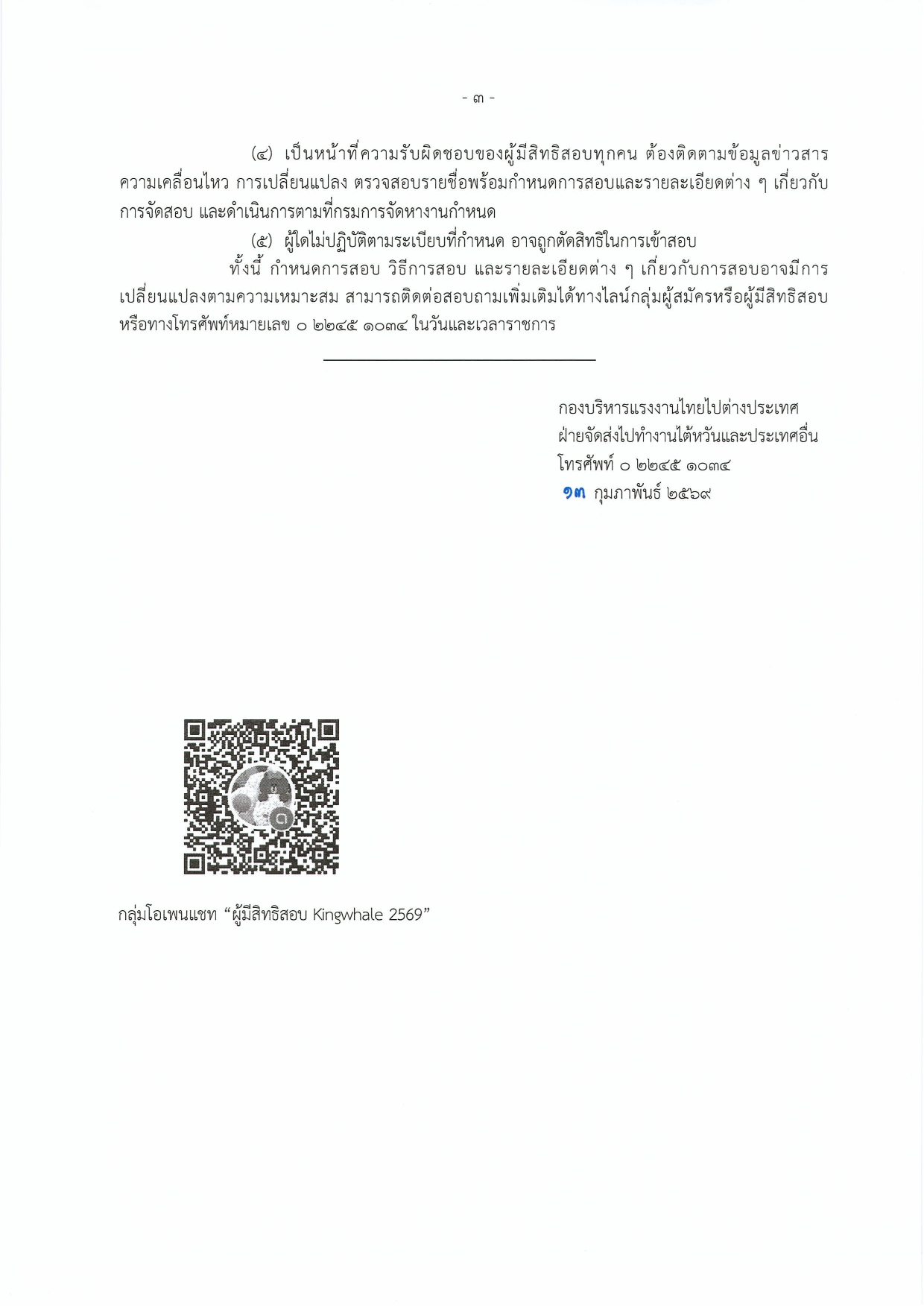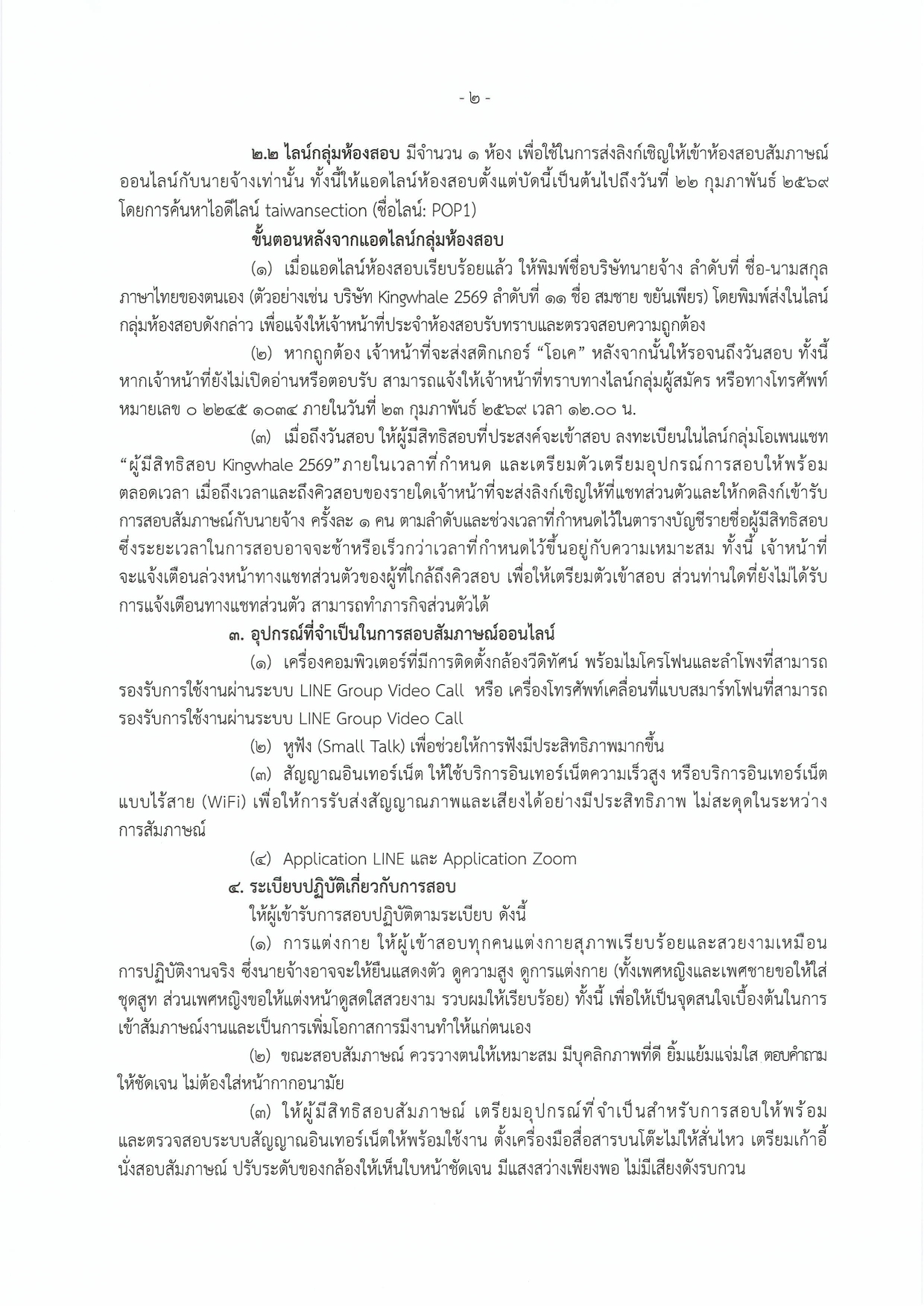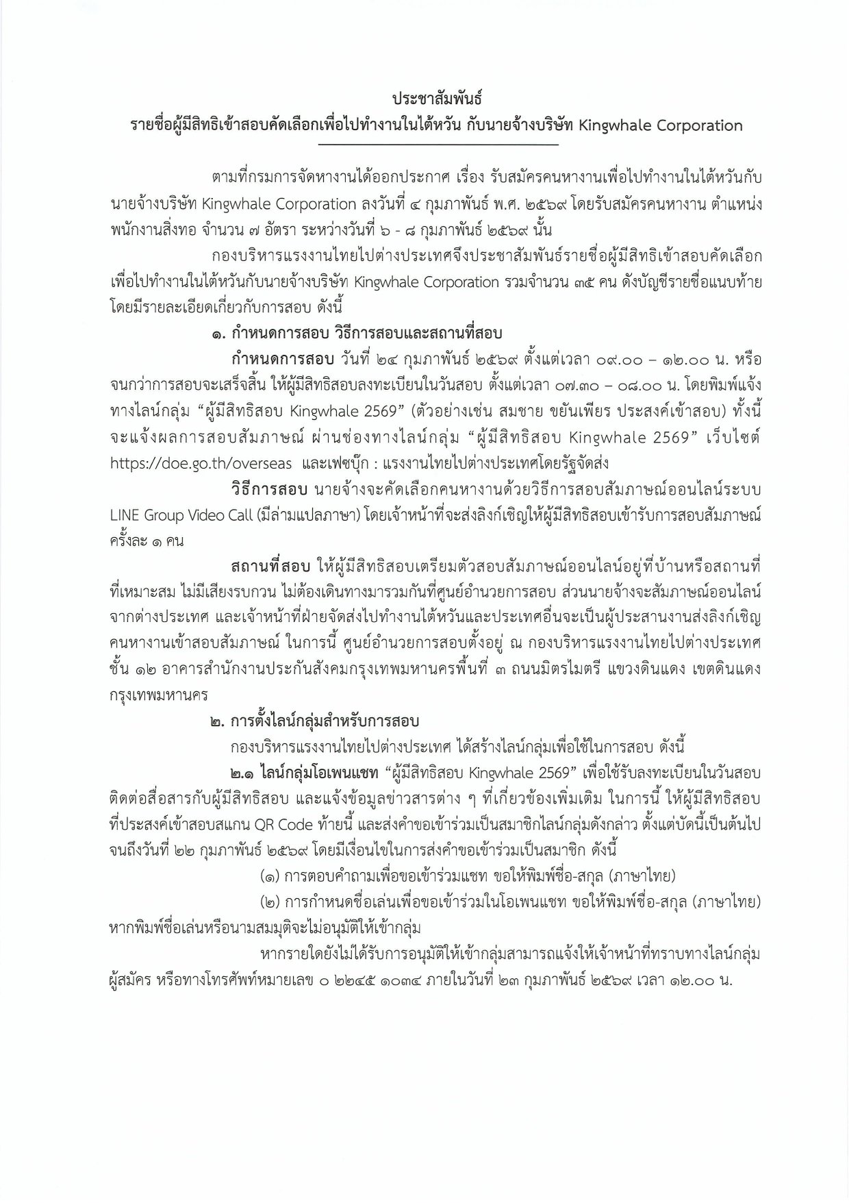 ประชาสัมพันธ์ รายชื่อผู้มีสิทธิเข้าสอบคัดเลือกเพื่อไปทำงานในไต้หวัน กับนายจ้างบริษัท Kingwhale Corporation