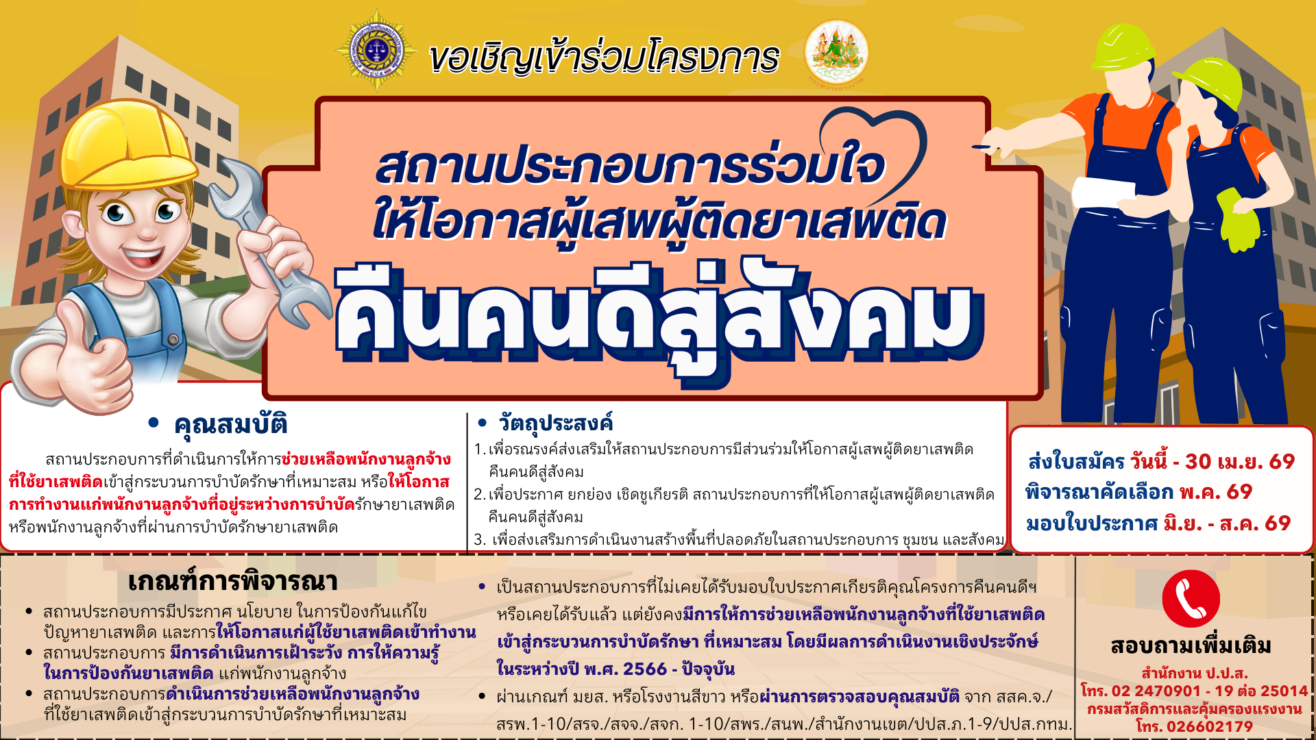 หลักเกณฑ์การพิจารณาโครงการสถานประกอบการร่วมใจให้โอกาสผู้เสพผู้ติดยาเสพติดคืนคนดีสู่สังคม ประจำปี พ.ศ.2569