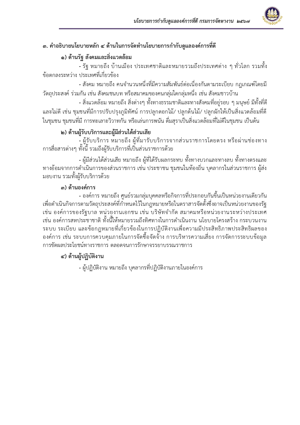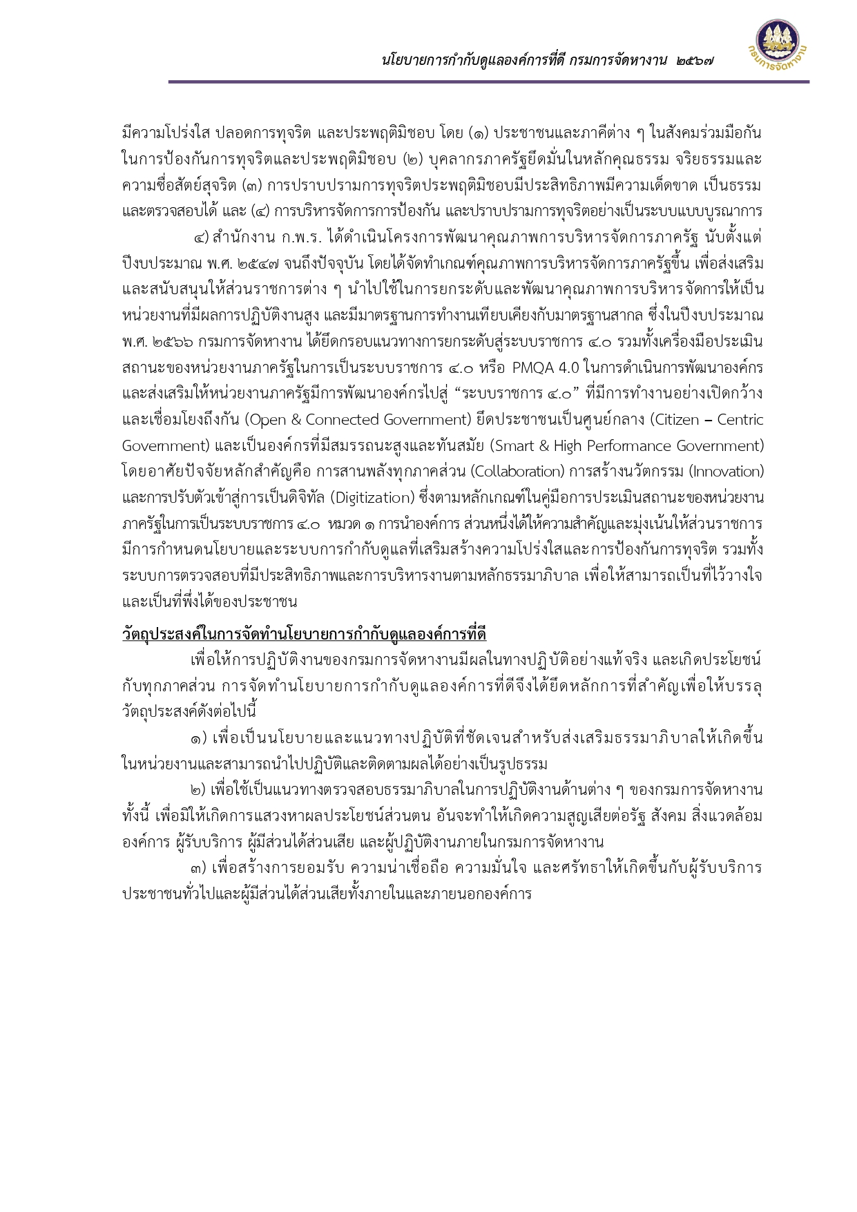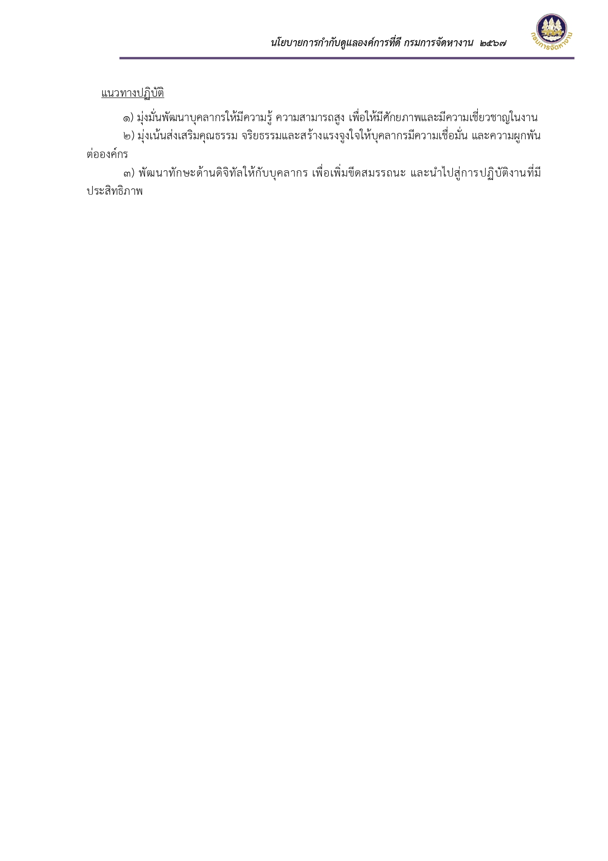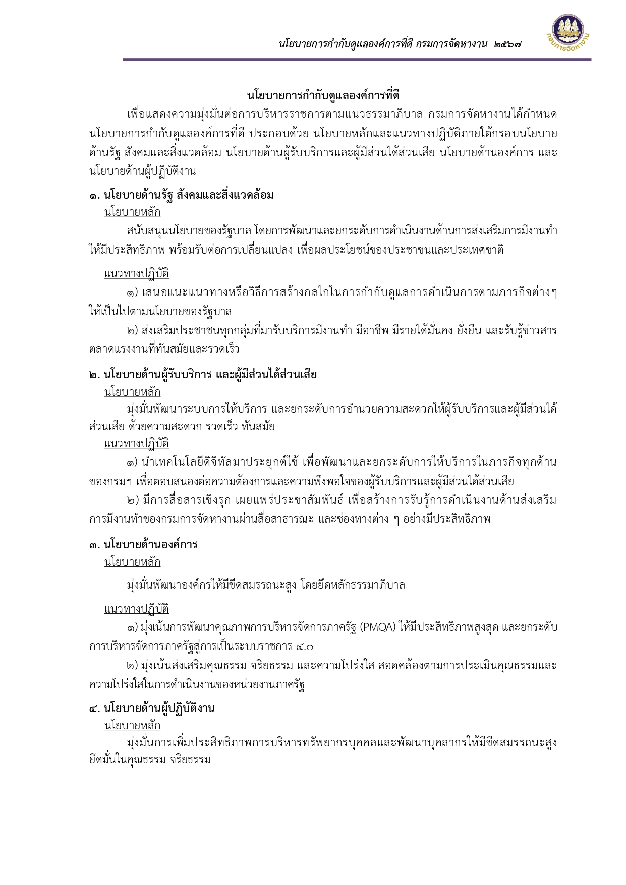 ประกาศเจตนารมณ์และนโยบายการกำกับดูแลองค์การที่ดี กรมการจัดหางาน ประจำปี พ.ศ. ๒๕๖๗
