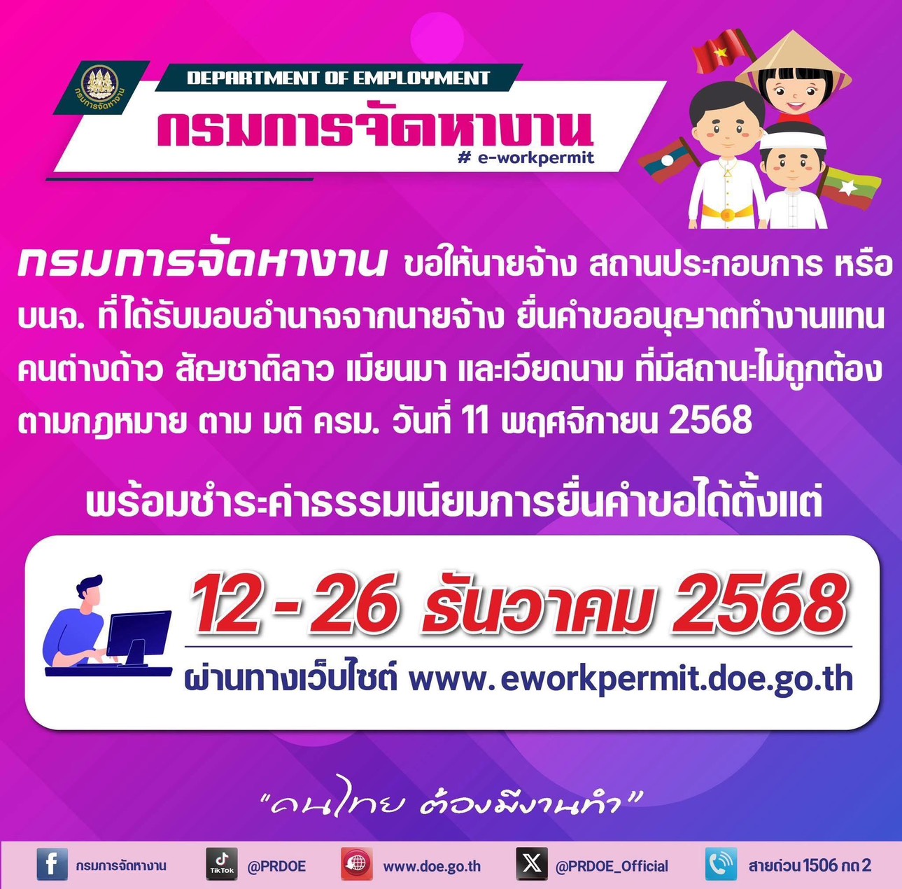 สำนักงานจัดหางานจังหวัดพิจิตรขอประชาสัมพันธ์ให้นายจ้างหรือบริษัทนำคนต่างด้าวมาทำงานในประเทศที่ได้รับมอบอำนาจจากนายจ้างยื่นคำขออนุญาตทำงานแทนคนต่างด้าวและชำระค่าธรรมเนียมการยื่นคำขอ ได้ระหว่างวันที่ 12 ธันวาคม 2568 ถึงวันที่ 26 ธันวาคม 2568 ผ่านทางระบบอิเล็กทรอนิกส์ eworkpermit