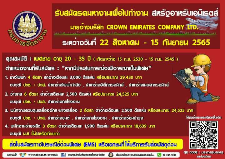 นายสุชาติ ชมกลิ่น รัฐมนตรีว่าการกระทรวงแรงงาน เปิดเผยว่า กระทรวงแรงงาน โดยกรมการจัดหางานเปิดรับสมัครคนหางานเพื่อไปทำงานกับนายจ้างบริษัท CROWN EMIRATES COMPANY LTD. ประเทศสหรัฐอาหรับเอมิเรตส์ (U.A.E.) ซึ่งประกอบธุรกิจเกี่ยวกับการผลิตกระป๋องและบรรจุภัณฑ์อลูมิเนียม จำนวน 4 ตำแหน่ง ได้แก่ ตำแหน่งช่างไฟฟ้า ช่างกล พนักงานควบคุมเครื่องจักร/ช่างเครื่อง และพนักงานฝ่ายผลิต รวมจำนวน 15 อัตรา มีระยะเวลาจ้างงาน 3 ปี โดยนายจ้างจะจัดหาที่พัก อาหารวันละ 3 มื้อ พร้อมจ่ายค่าโดยสารเครื่องบินจากกรุงเทพฯไปดูไบ และตั๋วขากลับหากทำงานครบตามสัญญาจ้าง ซึ่งผู้สนใจสามารถยื่นใบสมัครทางไปรษณีย์ลงทะเบียนด่วนพิเศษ (EMS) ได้ตั้งแต่วันที่ 22 สิงหาคม - 15 กันยายน 2565 โดยไม่เว้นวันหยุดราชการ