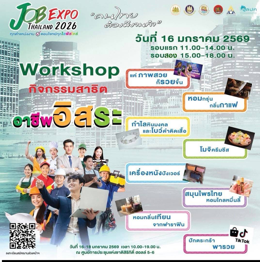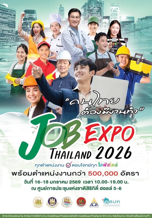 กระทรวงแรงงาน โดยกรมการจัดหางาน เชิญชวนร่วมงาน “JOB EXPO THAILAND 2026” วันที่ 16-18 มกราคม 2569 เวลา 10.00-19.00 น. ฮอลล์ 5-6 ศูนย์ฯ สิริกิติ์