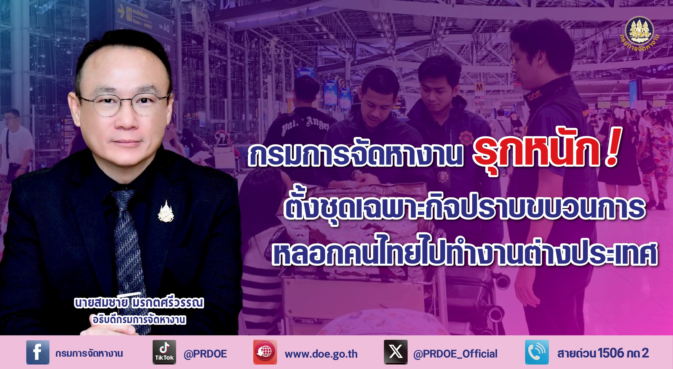“กรมการจัดหางานยืนยันเดินหน้าปราบปรามขบวนการหลอกลวงแรงงานไทยอย่างจริงจัง ควบคู่การสร้างความตระหนักรู้แก่ประชาชน เพื่อให้การเดินทางไปทำงานต่างประเทศเป็นไปอย่างถูกต้องตามกฎหมาย ปลอดภัย และคุ้มครองสิทธิแรงงานไทยในทุกมิติ” อธิบดีกรมการจัดหางาน กล่าว