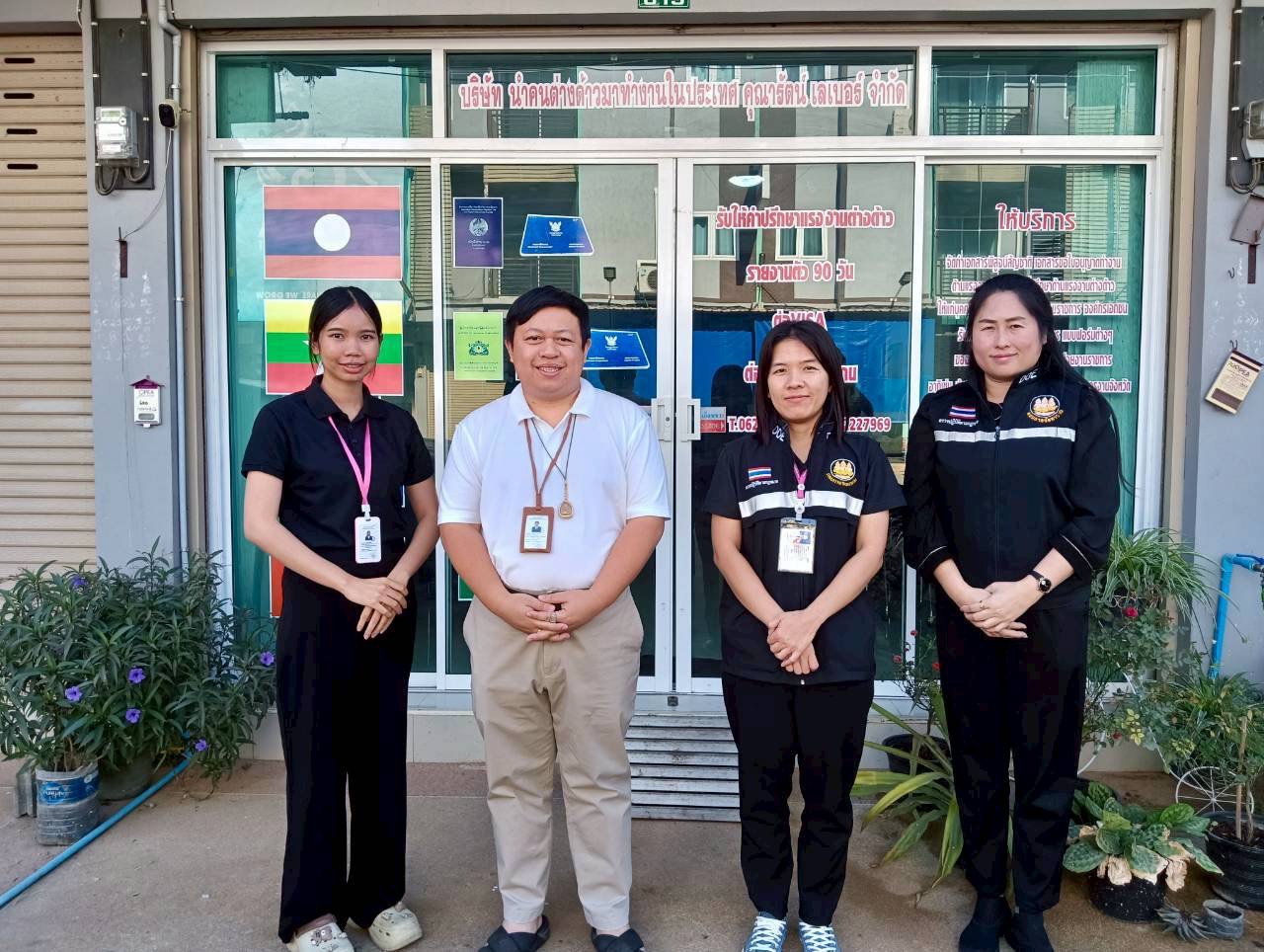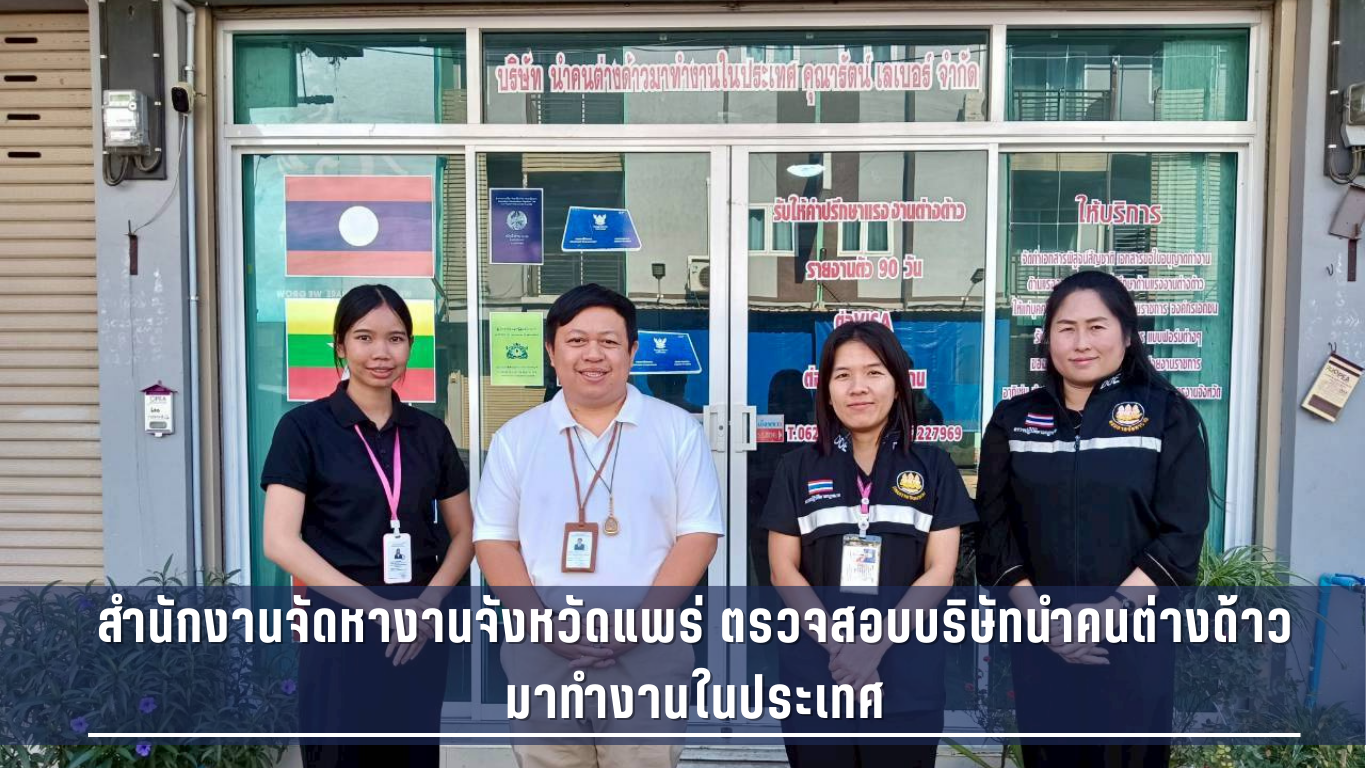 วันที่ 21 มกราคม 2569 นางสาวบุญณิศา เมืองจันทร์ จัดหางานจังหวัดแพร่ มอบหมายนางสาวโชติกานต์ ชูทรัพย์ นักวิชาการแรงงานชำนาญการ และเจ้าหน้าที่ฝ่ายคุ้มครองคนหางานและการทำงานของคนต่างด้าว ออกปฏิบัติงานตรวจสอบบริษัทนำคนต่างด้าวมาทำงานในประเทศ คุณารัตน์ เลเบอร์ จำกัด ตั้งอยู่เลขที่ 619 หมู่ที่ 9 ตำบลนาจักร อำเภอเมืองแพร่ จังหวัดแพร่ ใบอนุญาตให้ประกอบธุรกิจการนำคนต่างด้าวมาทำงานกับนายจ้างในประเทศ (แบบ บต.1) เลขที่ นจ. 0300/2565 ออกให้วันที่ 7 พฤศจิกายน 2565 ใช้ได้จนถึงวันที่ 6 พฤศจิกายน 2570