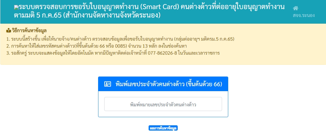 นายจ้าง/คนต่างด้าว ตรวจสอบรายชื่อคนต่างด้าวจากระบบตรวจสอบตามลิงค์ข้างล่างนี้ เพื่อทราบสถานะการผลิตใบอนุญาตทำงาน (Smart Card) กลุ่มต่ออายุใบอนุญาตทำงาน ตามมติ ครม. 5 ก.ค.65 (ใบอนุญาตทำงานหมดอายุปี 67,68)