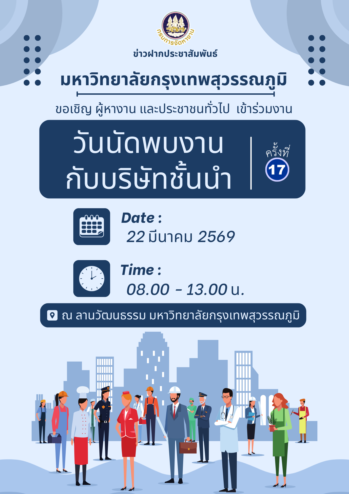 ข่าวฝากประชาสัมพันธ์ : มหาวิทยาลัยกรุงเทพสุวรรณภูมิ ขอเชิญ ผู้หางาน และประชาชนทั่วไปเข้าร่วมงาน "วันนัดพบงานกับบริษัทชั้นนำ" ครั้งที่ 17 ในวันอาทิตย์ ที่ 22 มีนาคม พ.ศ.2569 ณ ลานวัฒนธรรม มหาวิทยาลัยกรุงเทพสุวรรณภูมิ