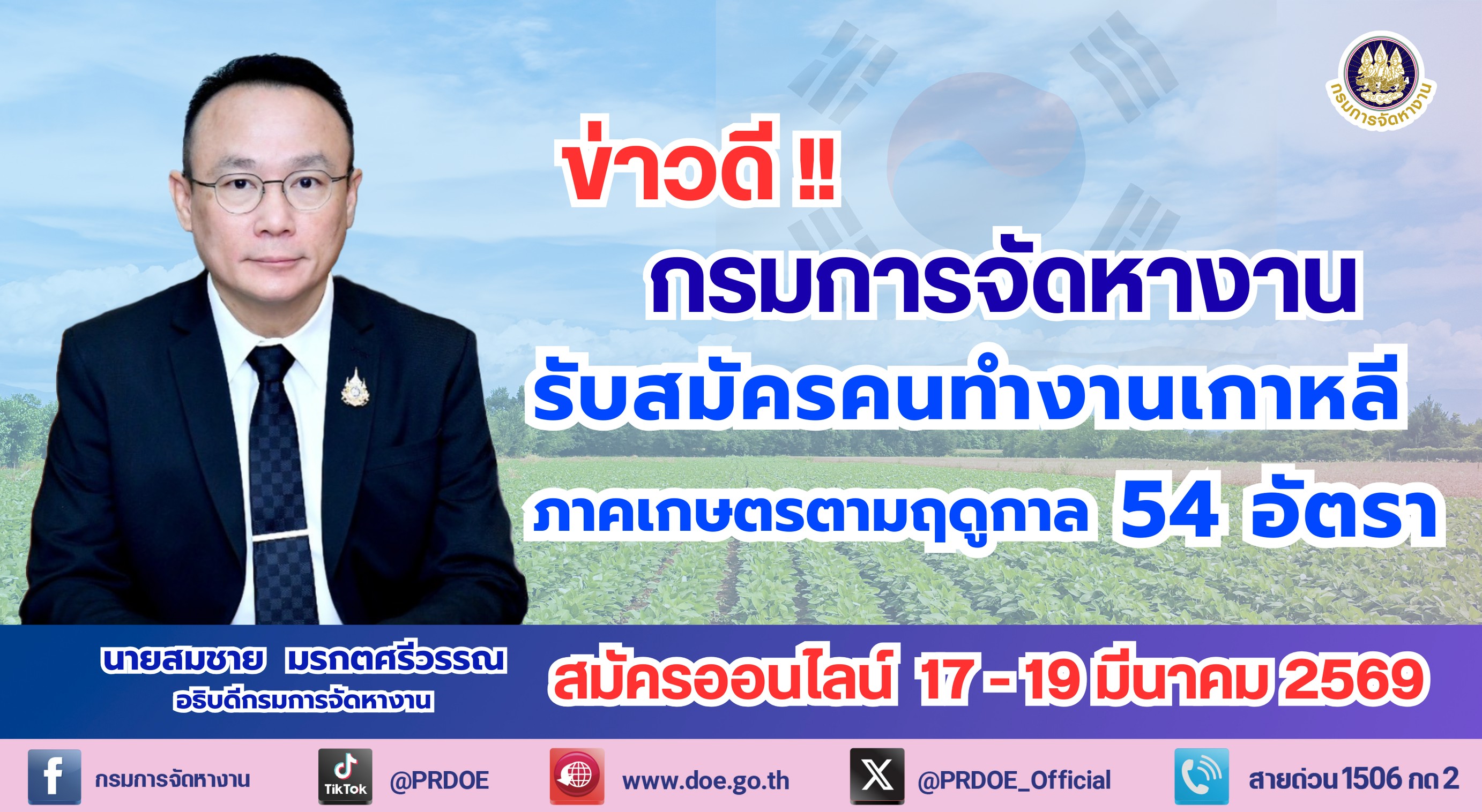 นายสมชาย มรกตศรีวรรณ อธิบดีกรมการจัดหางาน เปิดเผยว่า กรมการจัดหางาน เปิดรับสมัครคนไทยไปทำงานภาคเกษตรตามฤดูกาลในอำเภอจินโด จังหวัดชอลลานัม สาธารณรัฐเกาหลี ครั้งที่ 1 ตำแหน่งคนงานภาคเกษตรตามฤดูกาล จำนวน 54 อัตรา เงินเดือน 2,156,880 วอนต่อเดือน หรือประมาณ 45,726 บาท (ขึ้นอยู่กับอัตราแลกเปลี่ยน) มีระยะเวลาการจ้างงาน 8 เดือน สำหรับผู้สนใจสามารถสมัครทางเว็บไซต์ toea.doe.go.th โดยลงทะเบียนระบบอิเล็กทรอนิกส์การบริหารแรงงานไทยไปต่างประเทศ กรอกข้อมูลเพื่อลงทะเบียนคนหางาน และดำเนินการสมัครไปทำงาน โดยเลือกหัวข้อ "สมัครไปทำงานโดยรัฐจัดส่ง" และเลือกรายการ "การรับสมัครคนหางานเพื่อไปทำงานภาคเกษตรและประมงตามฤดูกาลในอำเภอจินโด จังหวัดชอลลานัม สาธารณรัฐเกาหลี (ครั้งที่ 1/2569)" ตั้งแต่วันที่ 17 – 19 มีนาคม 2569 ตลอด 24 ชั่วโมง