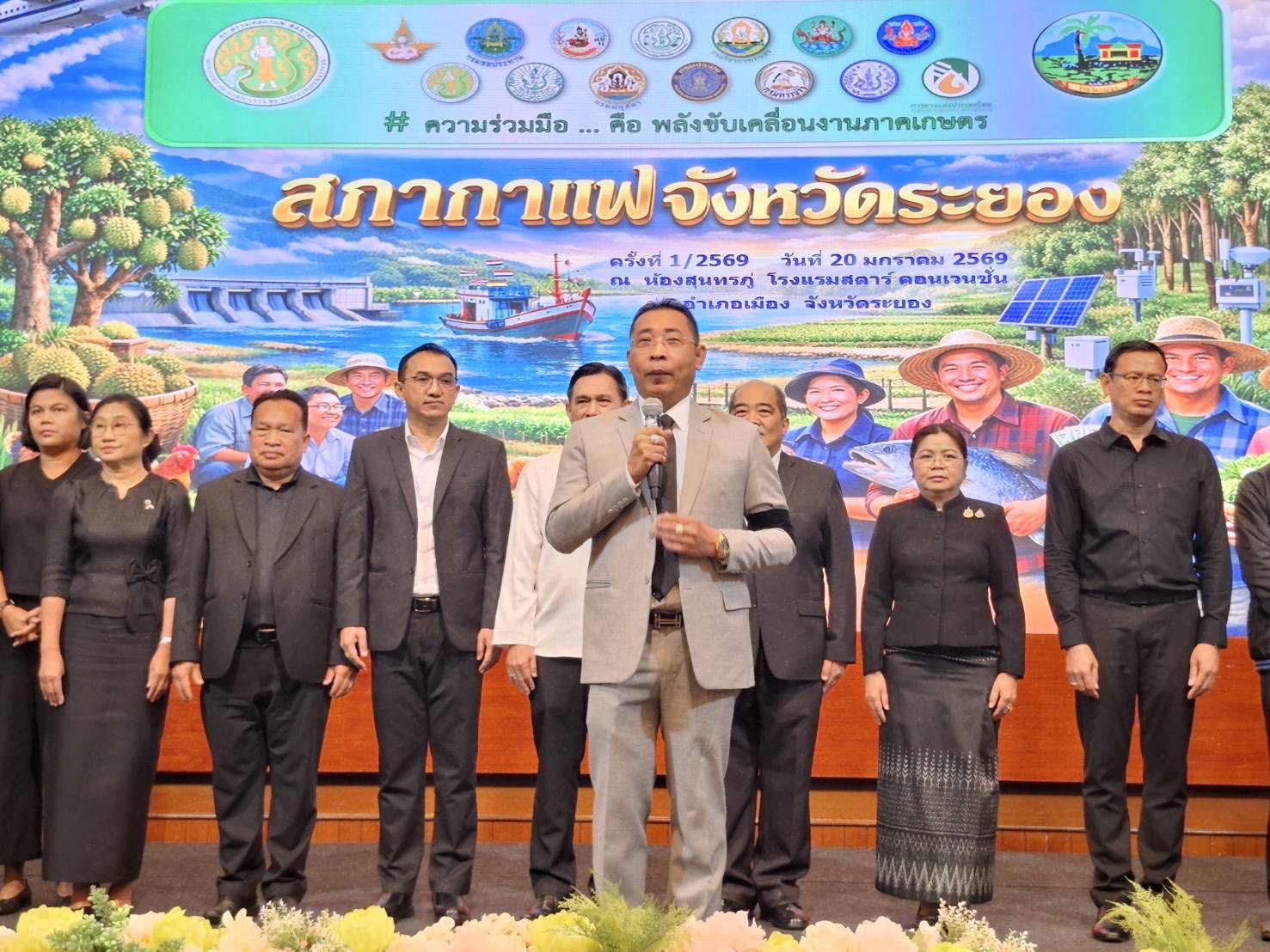 นายณัฐพล รักชาติ จัดหางานจังหวัดระยอง มอบหมายให้นางวาสนา จวงสอน นักวิชาการแรงงานชำนาญการพิเศษ พร้อมด้วยข้าราชการ และเจ้าหน้าที่สำนักงานจัดหางานจังหวัดระยอง ร่วมกิจกรรมสภากาแฟสัญจร ครั้งที่ 1/2569 ประจำเดือนมกราคม 2569 เพื่อพบปะ สนทนา แลกเปลี่ยนความเห็น รับฟังปัญหา ข้อเสนอแนะจากทุกภาคส่วน เพื่อประโยชน์ในการพัฒนาจังหวัดระยอง ในวันอังคารที่ 20 มกราคม 2569 เวลา 07.30 น. โดยมีนายไตรภพ วงศ์ไตรรัตน์ ผู้ว่าราชการจังหวัดระยอง เป็นประธานฯ และส่วนราชการในสังกัดกระทรวงเกษตรและสหกรณ์เป็นเจ้าภาพ ณ ห้องสุนทรภู่ โรงแรมสตาร์ คอนเวนชั่น อำเภอเมืองระยอง จังหวัดระยอง
