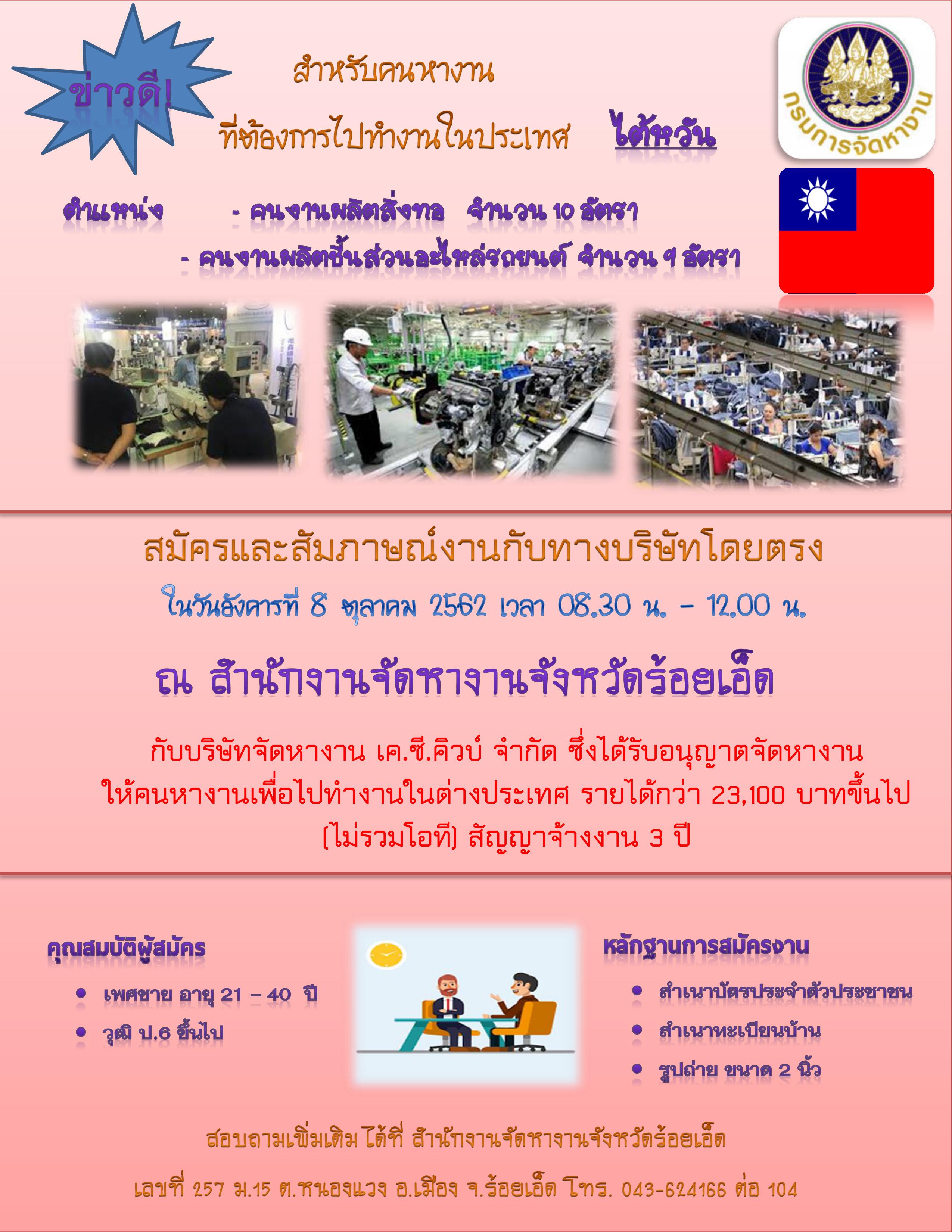 รับสมัครไปทำงานที่ประเทศไต้หวัน(บริษัท เค.ซี.คิวบ์ จก.)