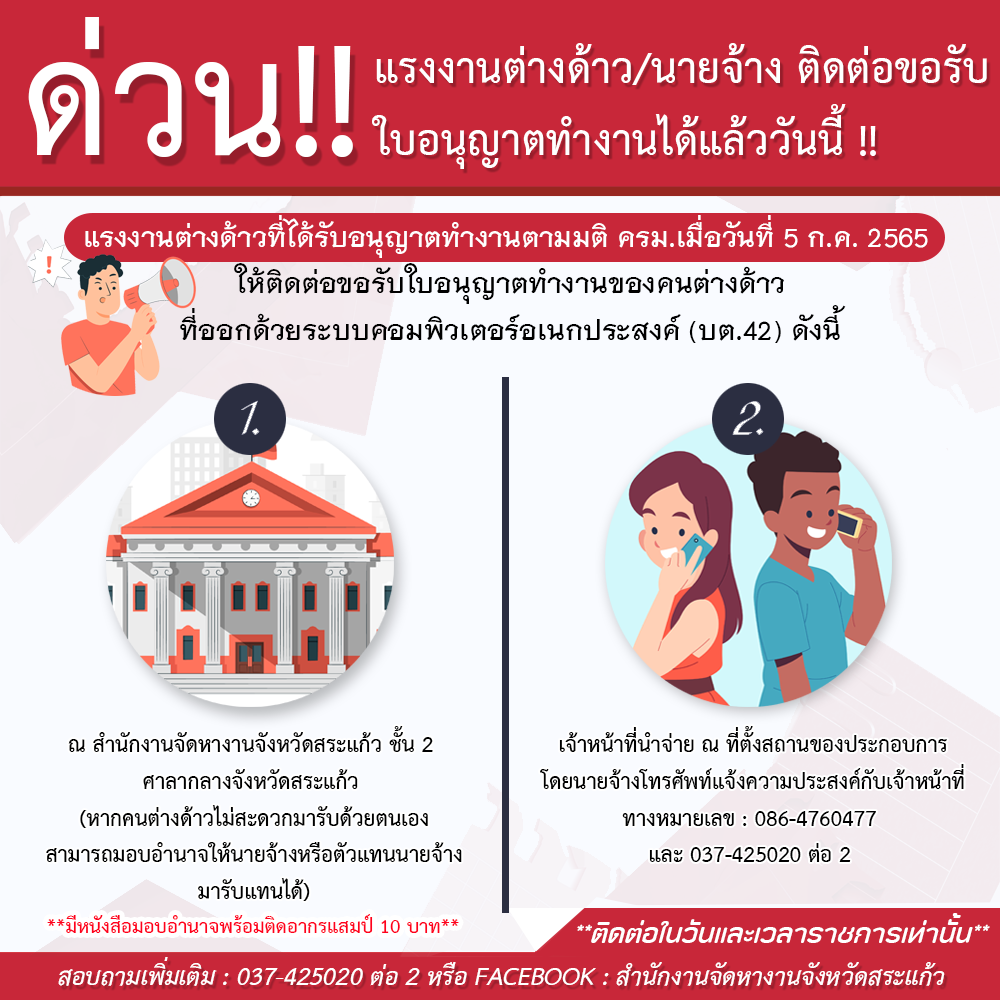 ด่วน!! แรงงานต่างด้าว/นายจ้าง ติดต่อขอรับใบอนุญาตทำงานได้แล้ววันนี้ !!!