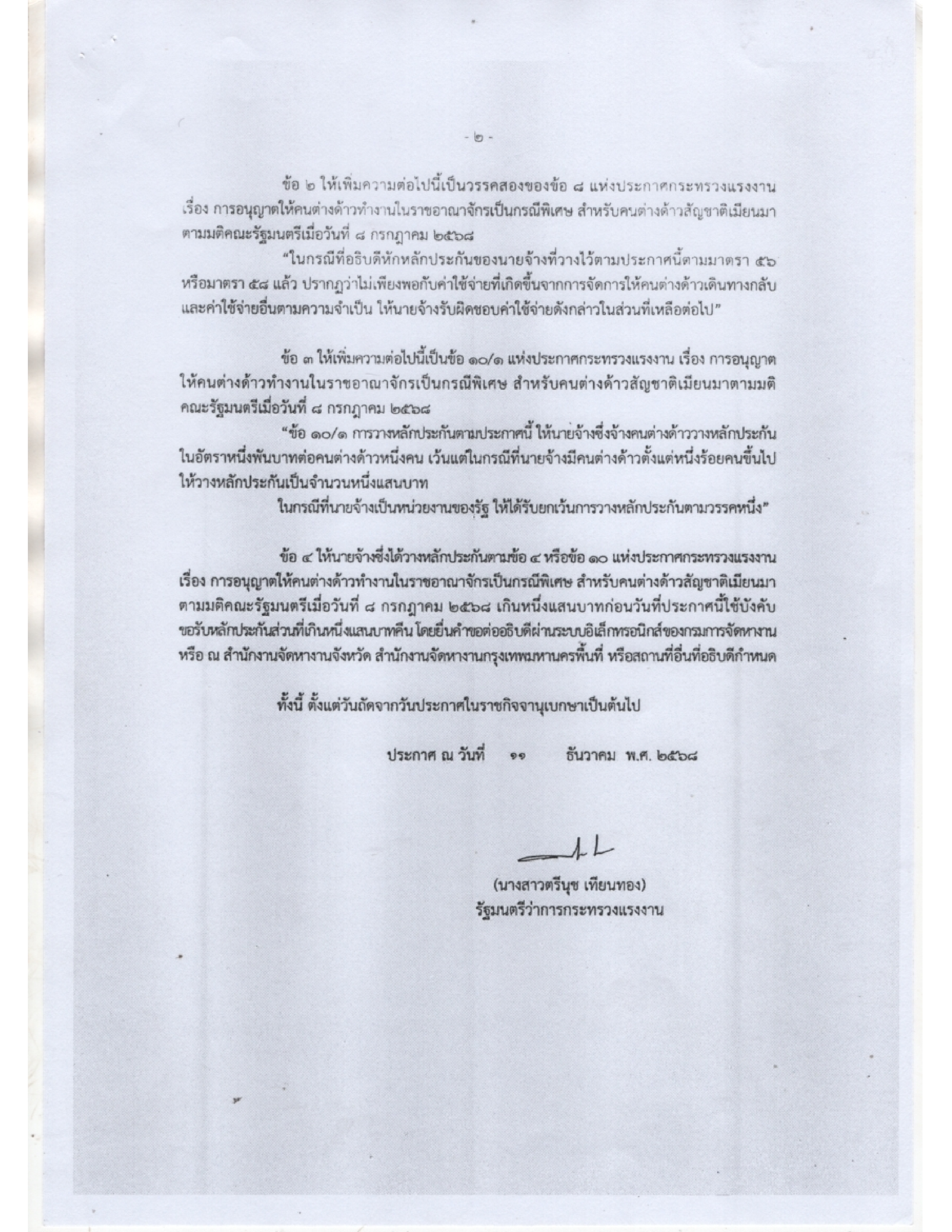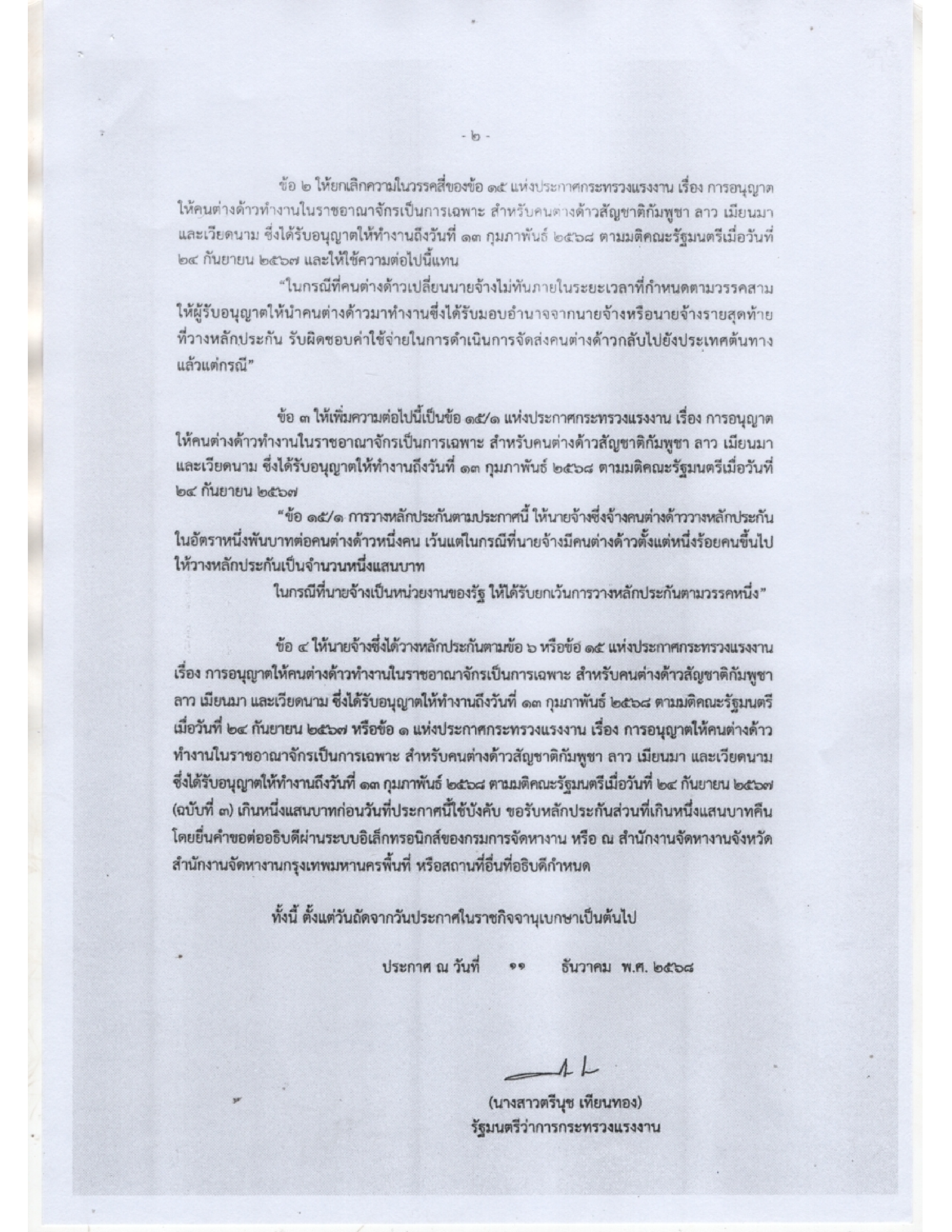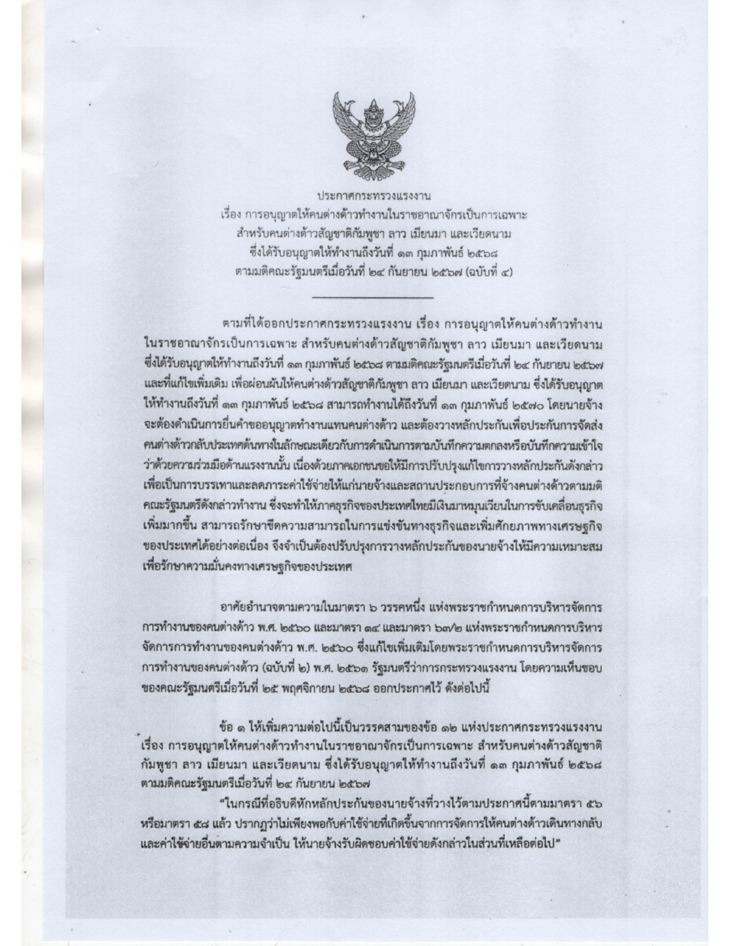 ประกาศกระทรวงแรงงาน เรื่อง การอนุญาตให้คนต่างด้าวทำงานใราชอาณาจักรเป็นการเฉพาะสำหรับคนต่างด้าวสัญชาติกัมพูชา ลาว เมียนมา และเวียดนาม ซึ่งได้รับอนุญาตให้ทำงานถึงวันที่ 13 กุมภาพันธ์ 2568 ตามมติคณะรัฐมนตรี เมื่อวันที่ 24 กันยายน 2567 (ฉบับที่ 4)