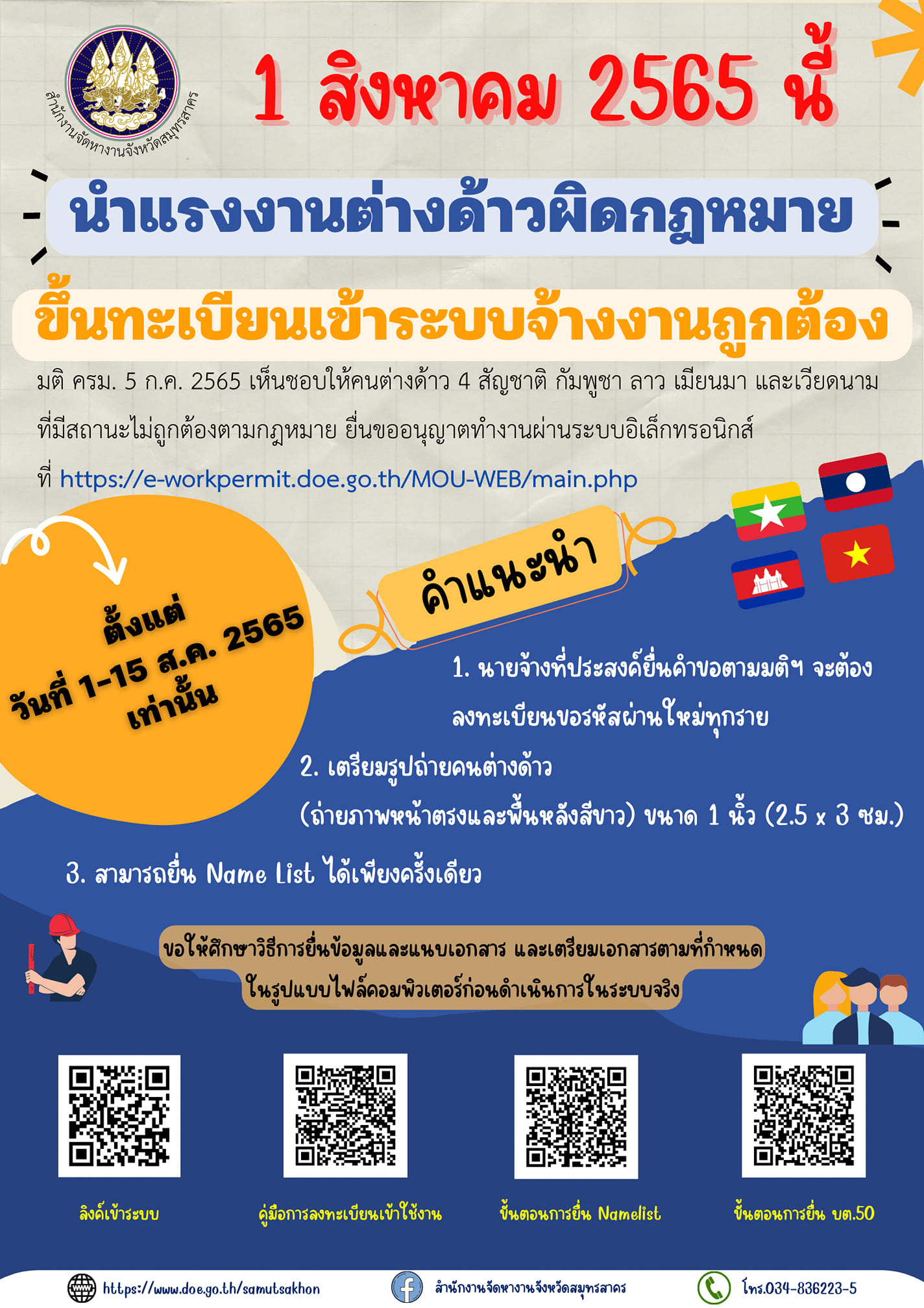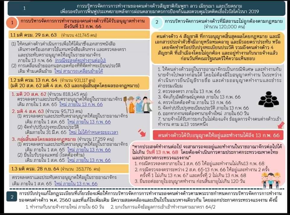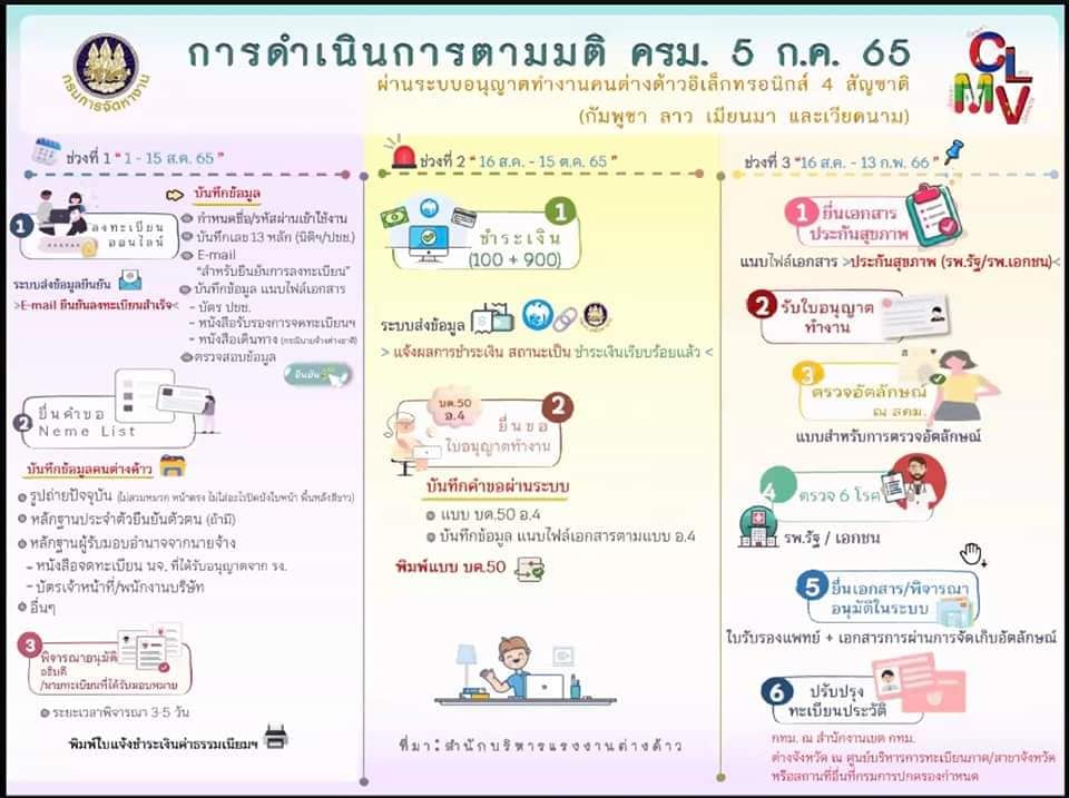 มติ ครม. 5 ก.ค. 2565 เห็นชอบให้คนต่างด้าว 4 สัญชาติ กัมพูชา ลาว เมียนมา และเวียดนาม ที่มีสถานะไม่ถูกต้องตามกฎหมาย ยื่นขออนุญาตทำงานผ่านระบบอิเล็กทรอนิกส์ที่